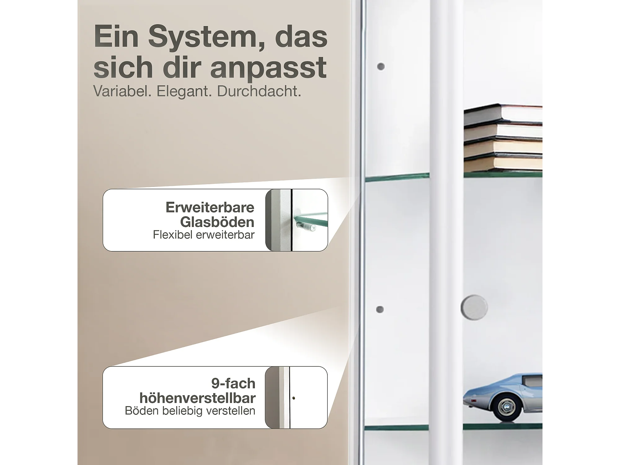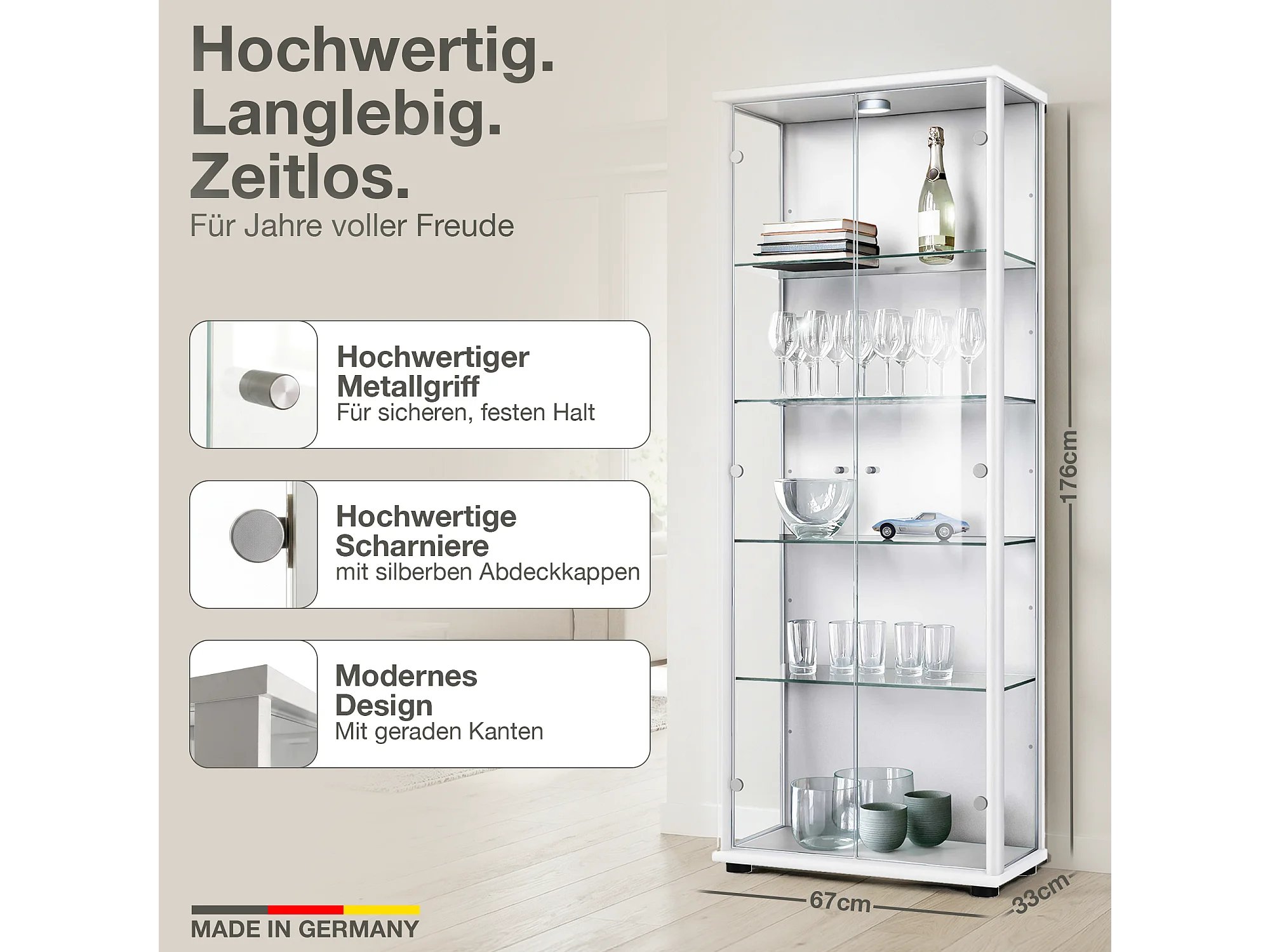 Staande vitrine met 2 deuren, 4 in hoogte verstelbare glasplanken - Met LED-verlichting - 176x67x33 cm - Wit