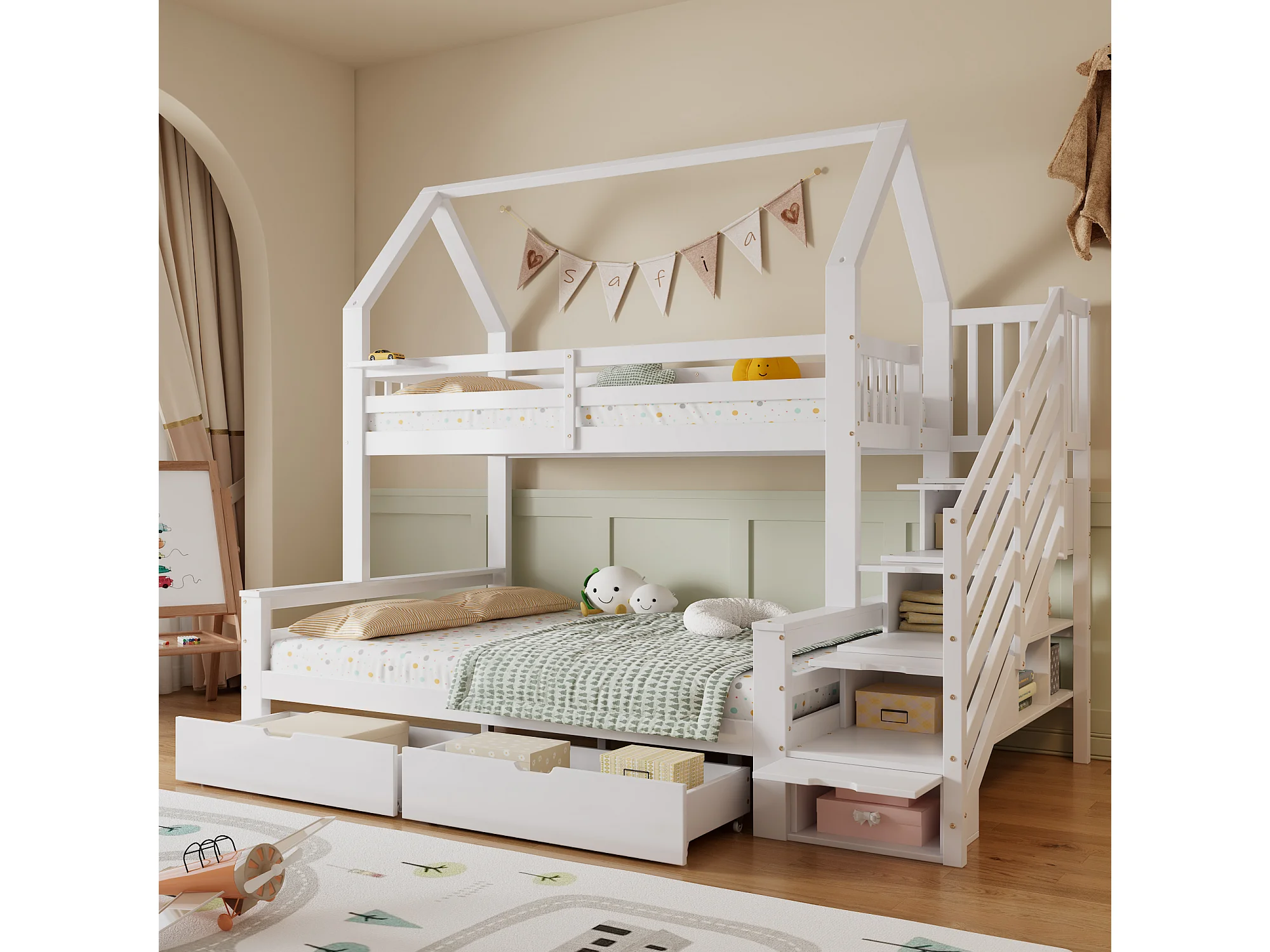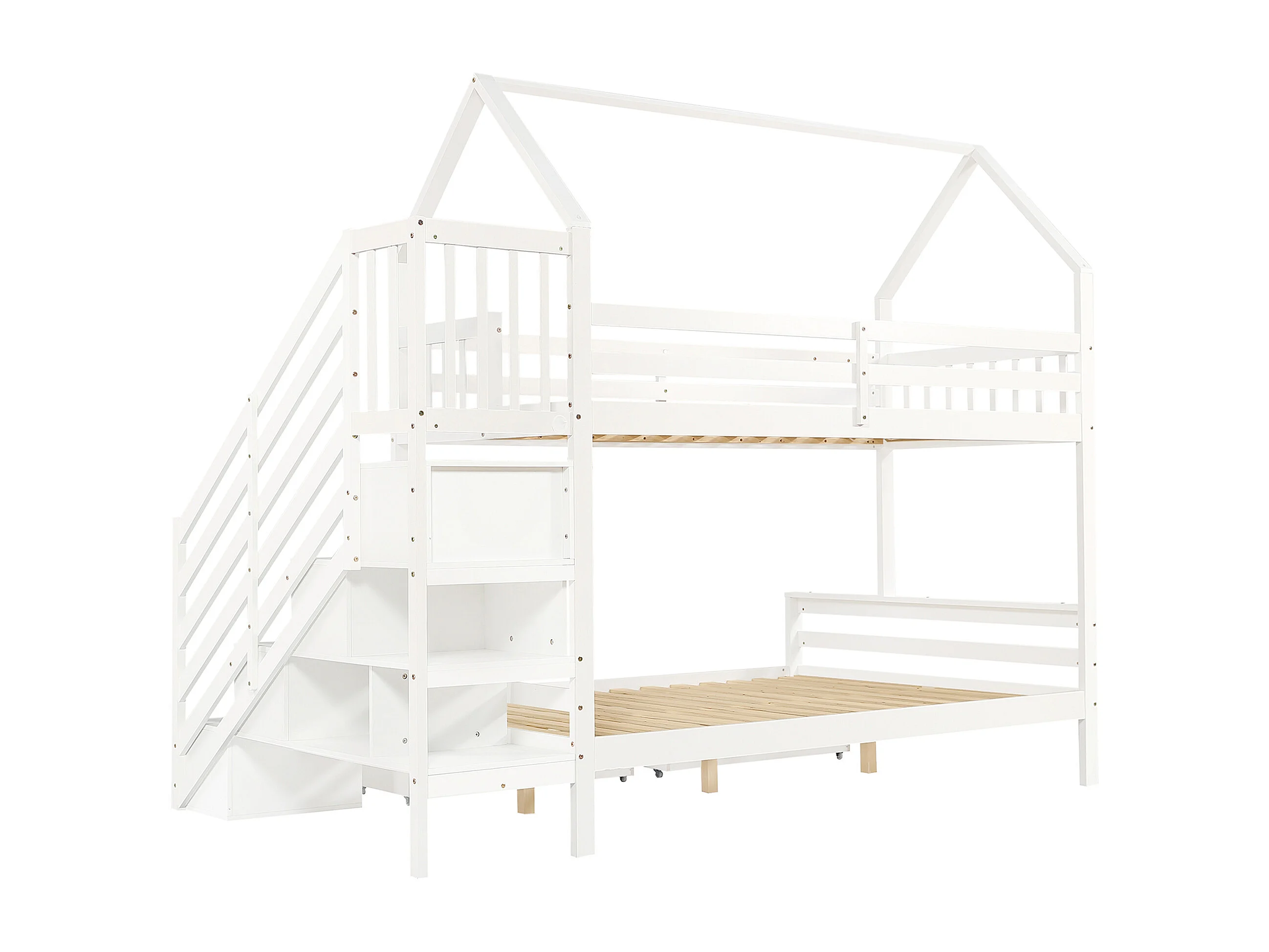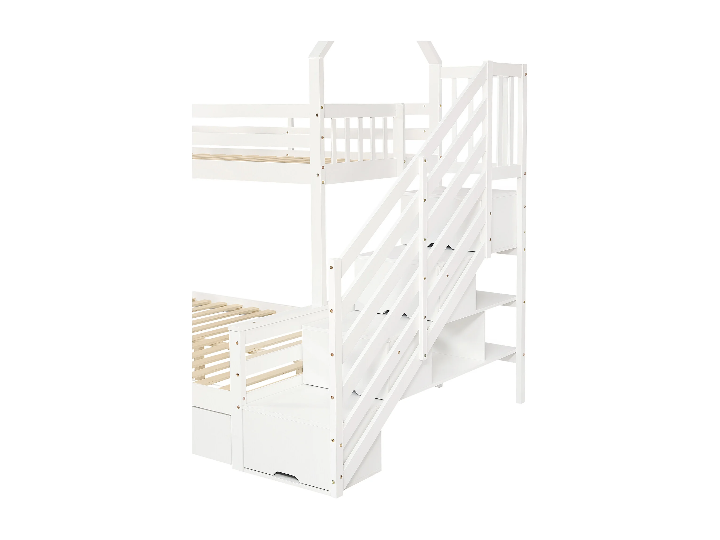 Stapelbed 140x200cm met trapkast en twee lades op wielen charmant dakdesign hout en MDF wit (Zonder matras)