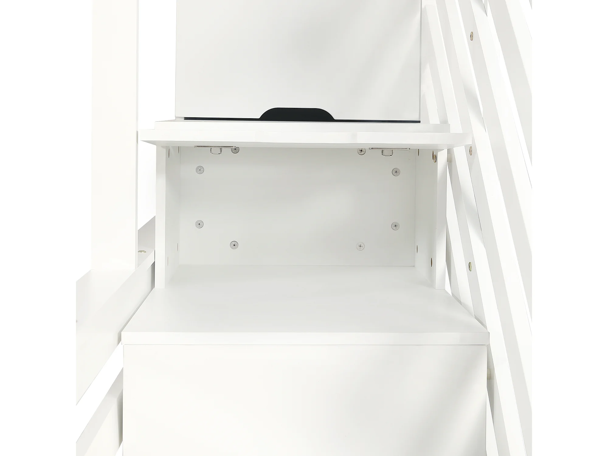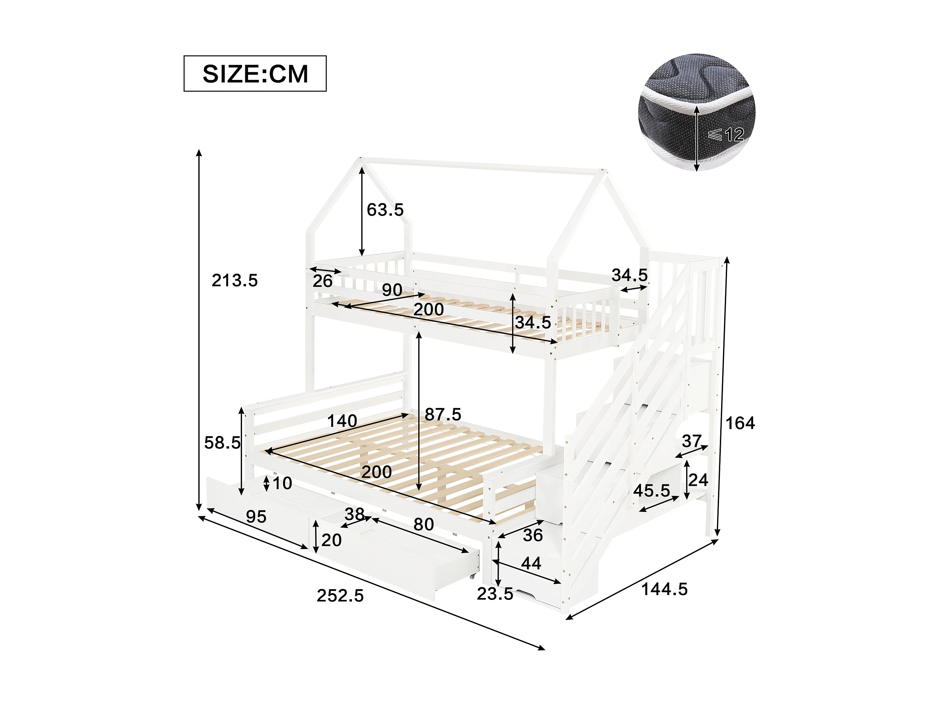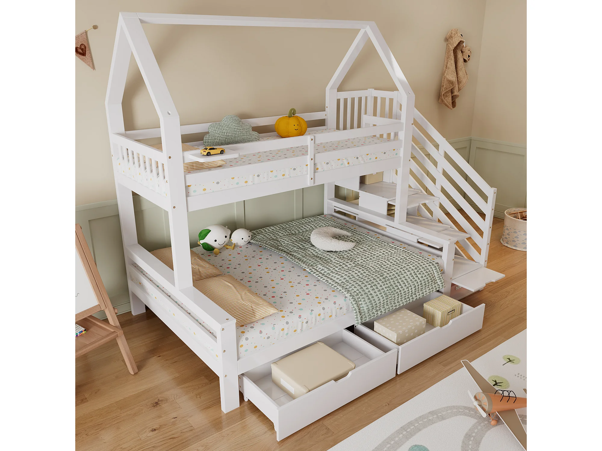 Stapelbed 140x200cm met trapkast en twee lades op wielen charmant dakdesign hout en MDF wit (Zonder matras)
