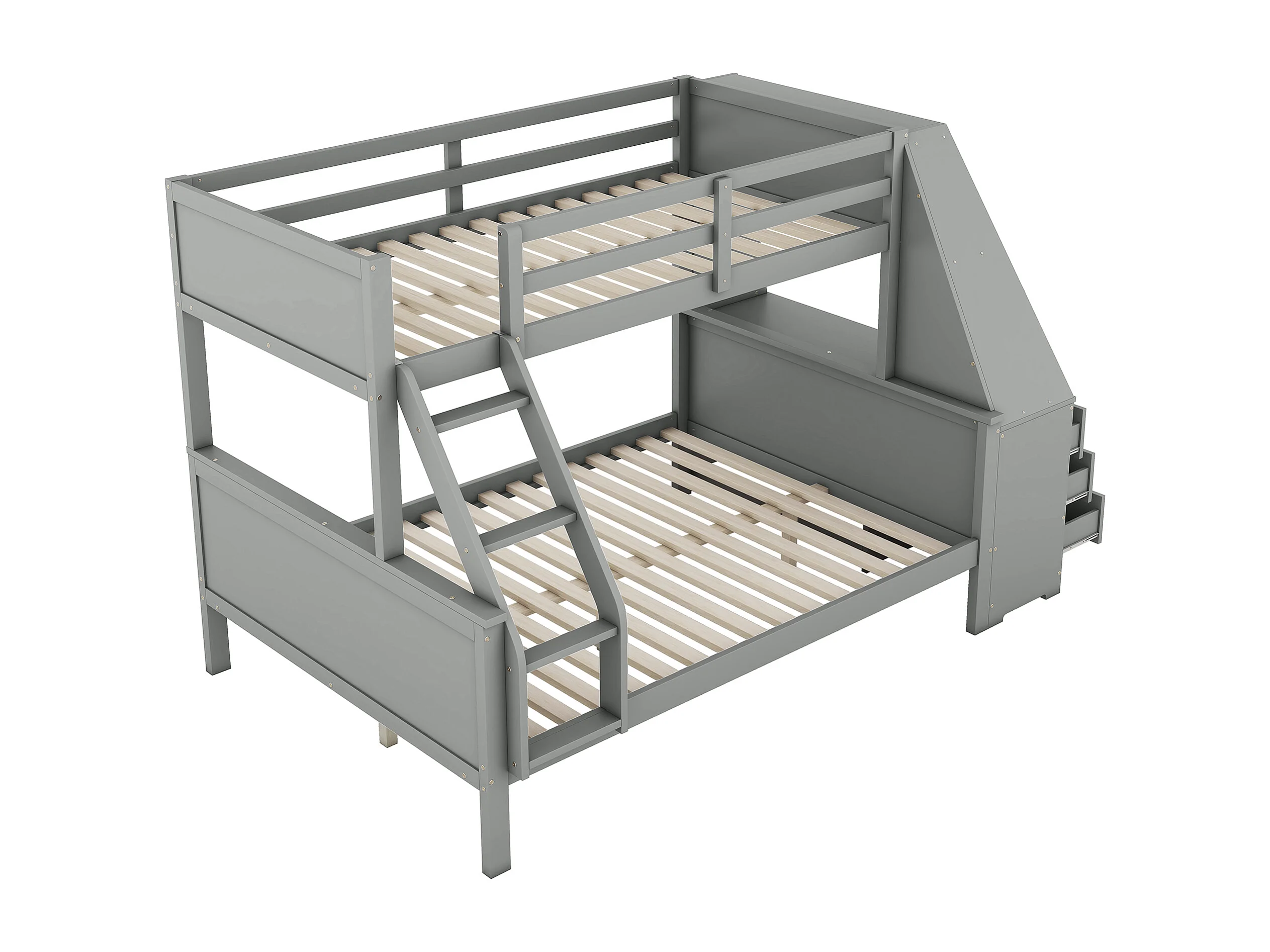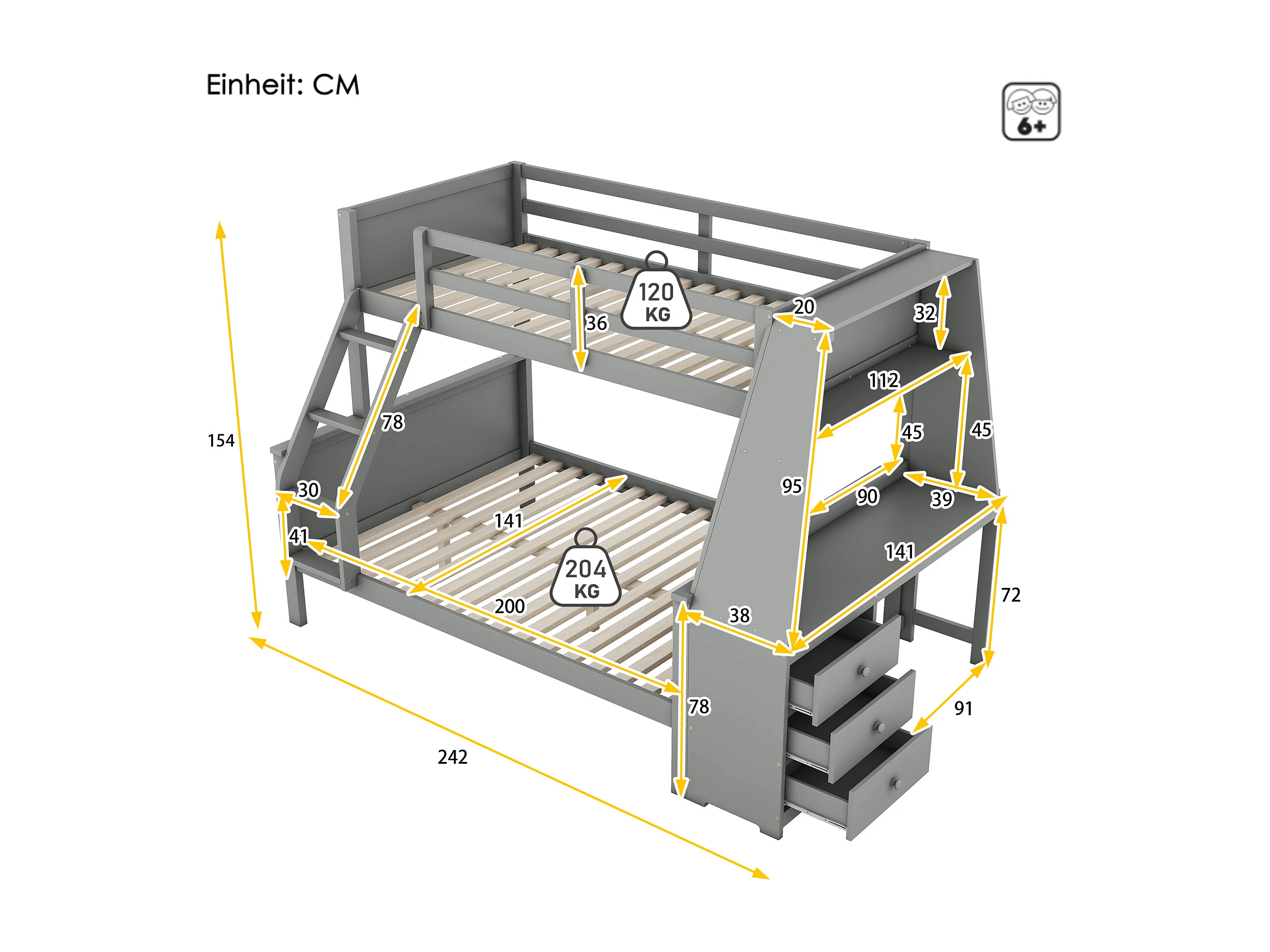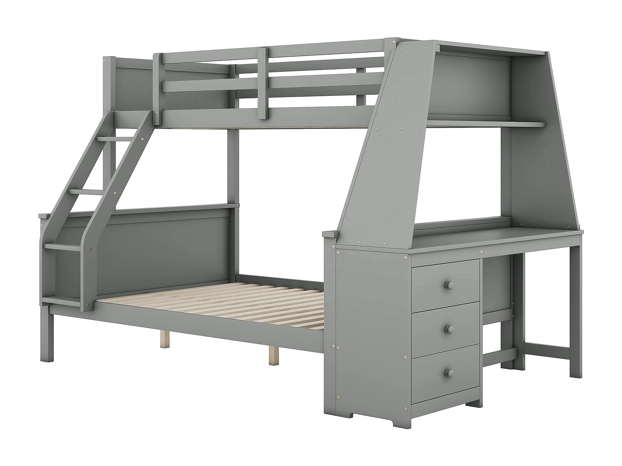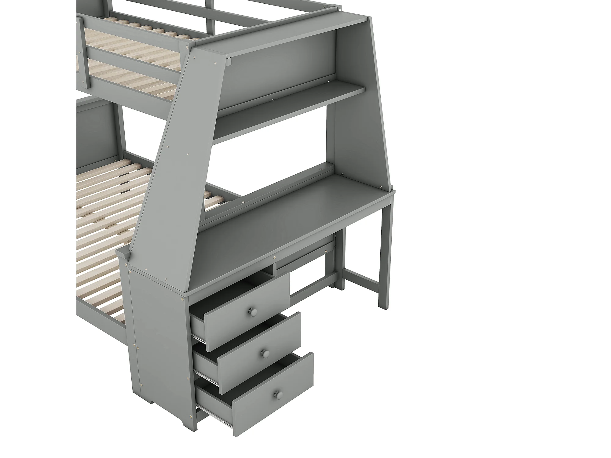 Stapelbed 90 x 200 cm en 140 x 200 cm - Kinderbed met tafel en 3 lades - Dennenhout en grijs MDF
