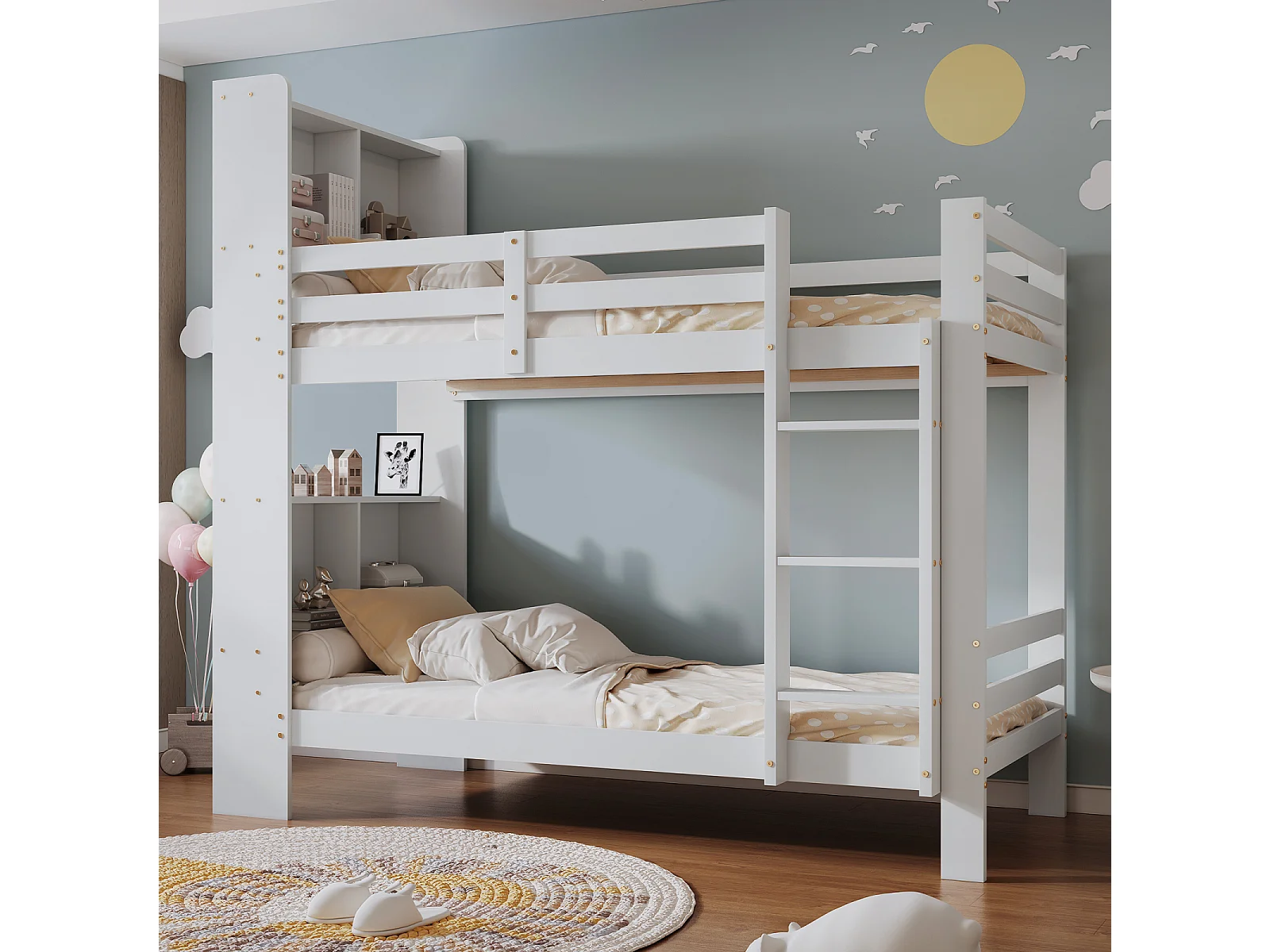 Stapelbed 90x200 cm met opbergplanken en 3-traps ladder, massief houten bedframe met boekenkast - Wit