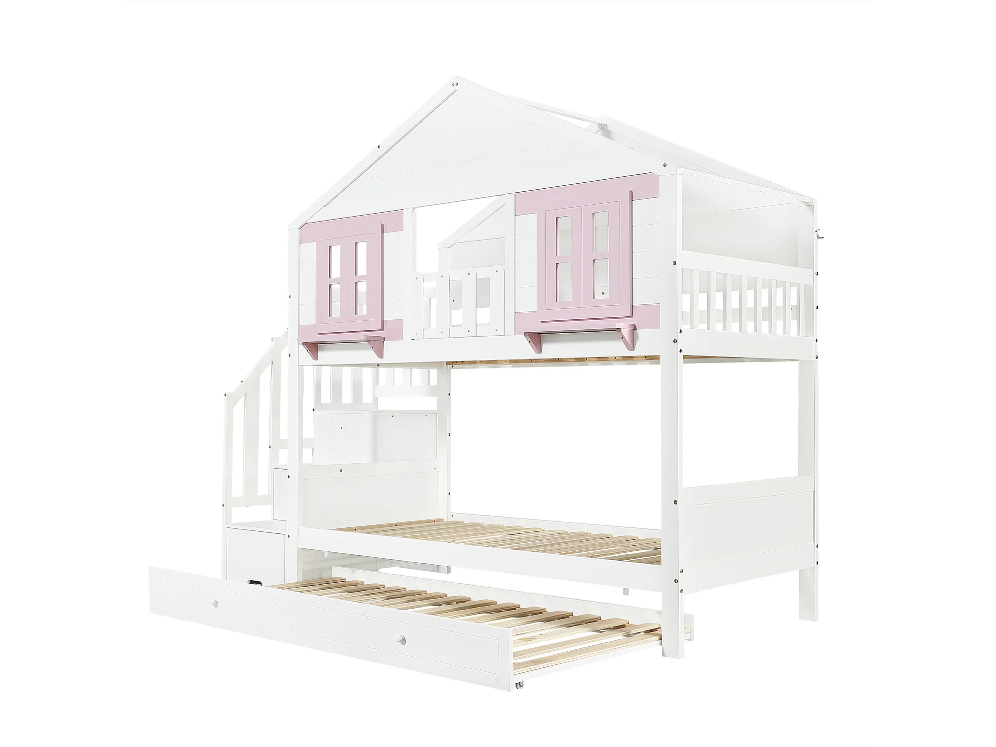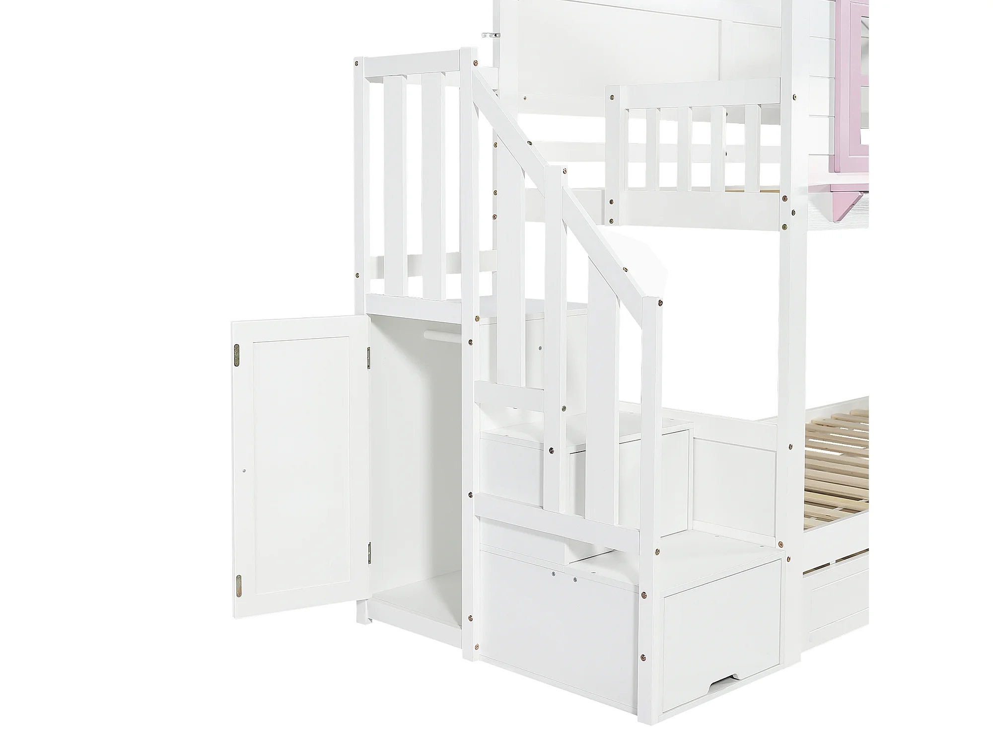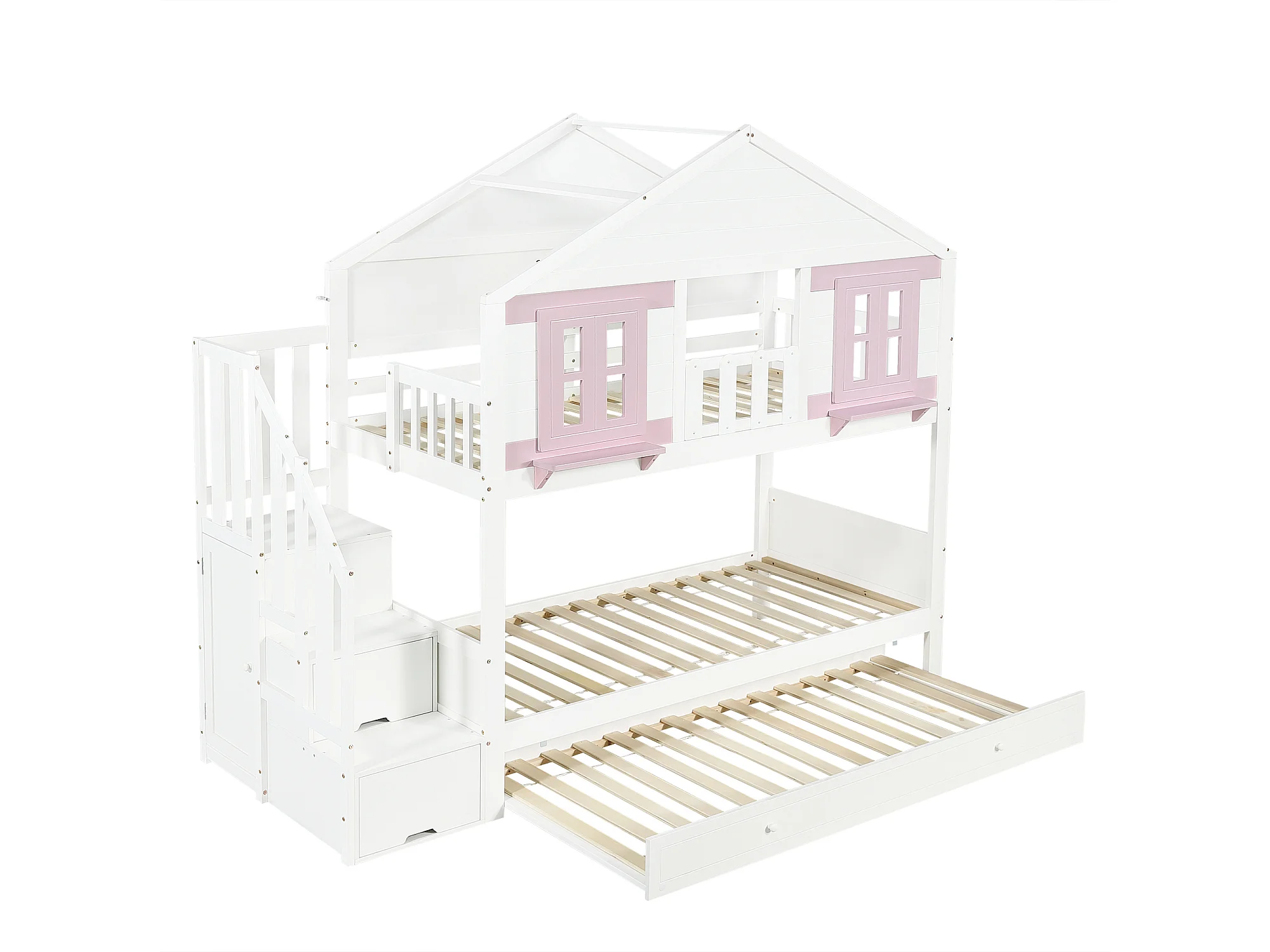 Stapelbed 90x200 cm met uitschuifbed 90x190 cm - Kajuitbed met opbergruimte - wit + roze