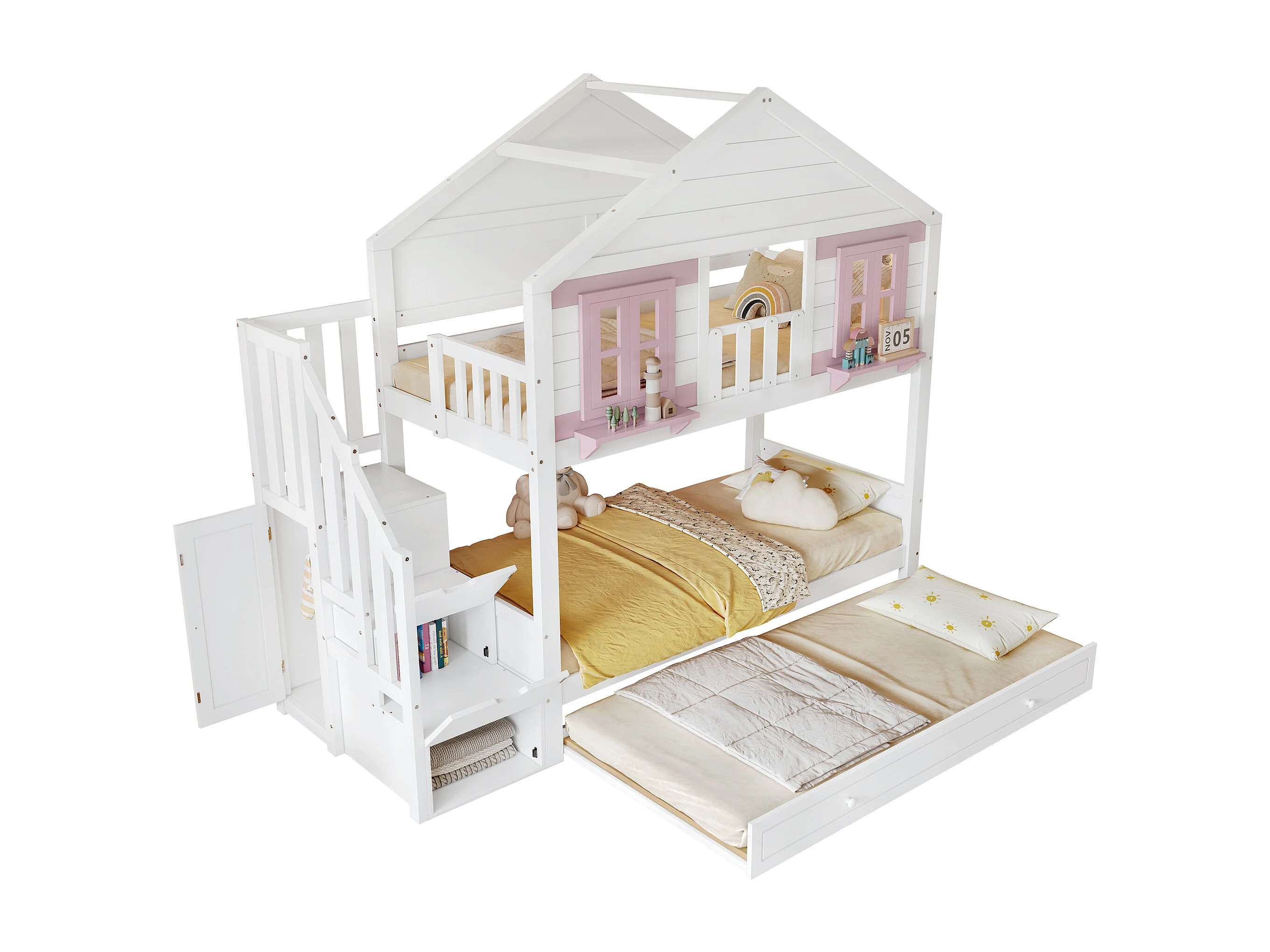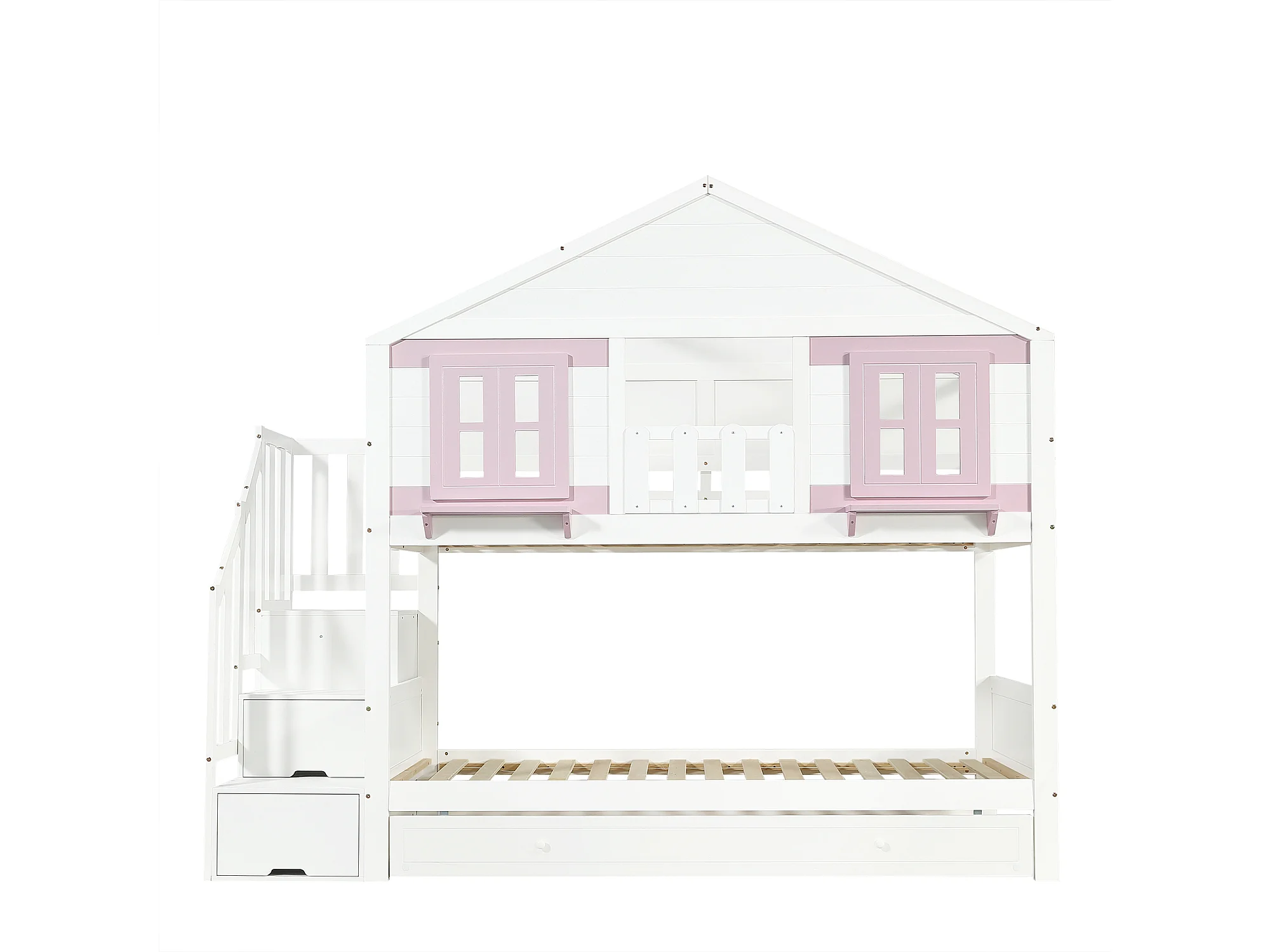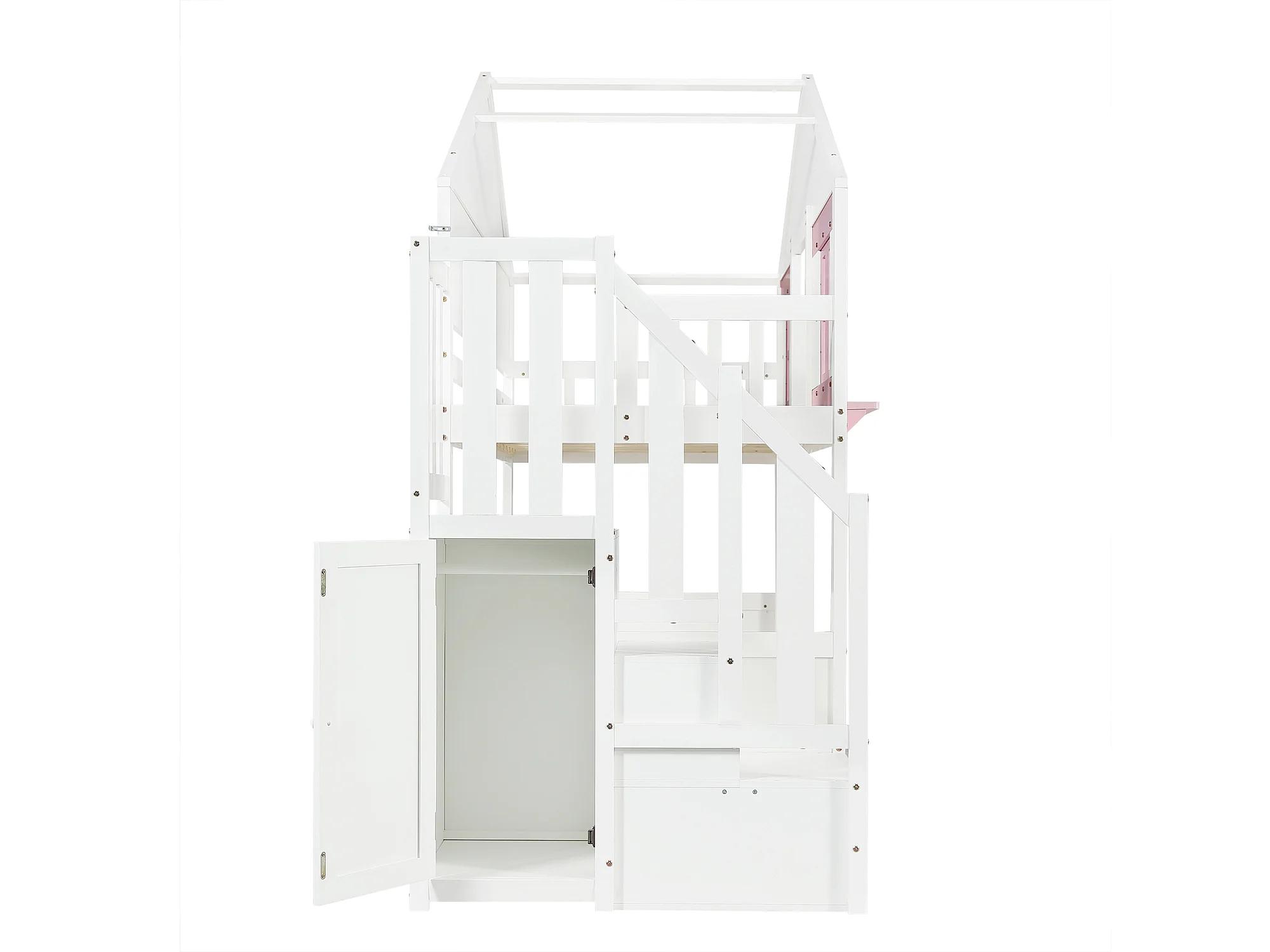 Stapelbed 90x200 cm met uitschuifbed 90x190 cm - Kajuitbed met opbergruimte - wit + roze