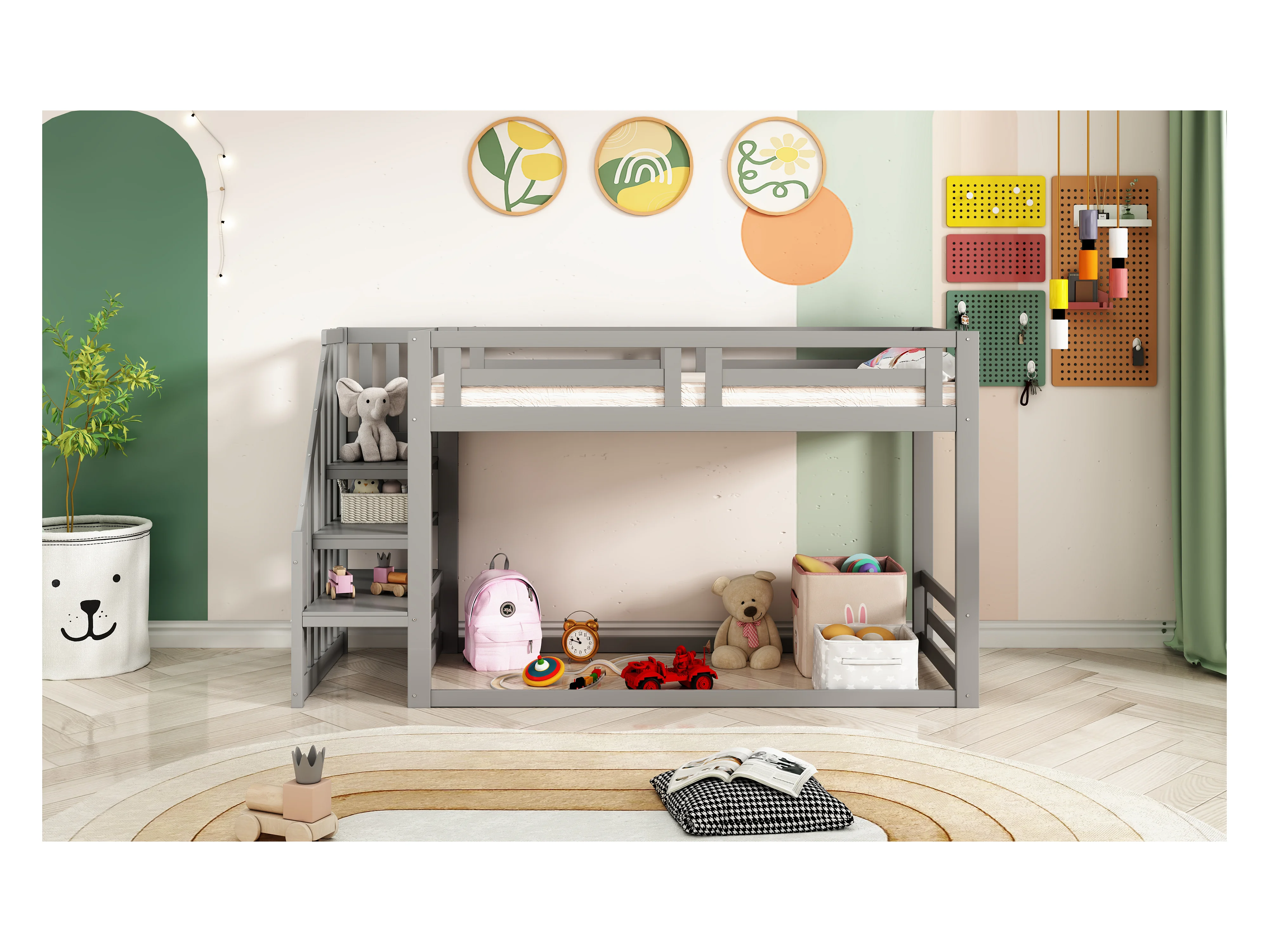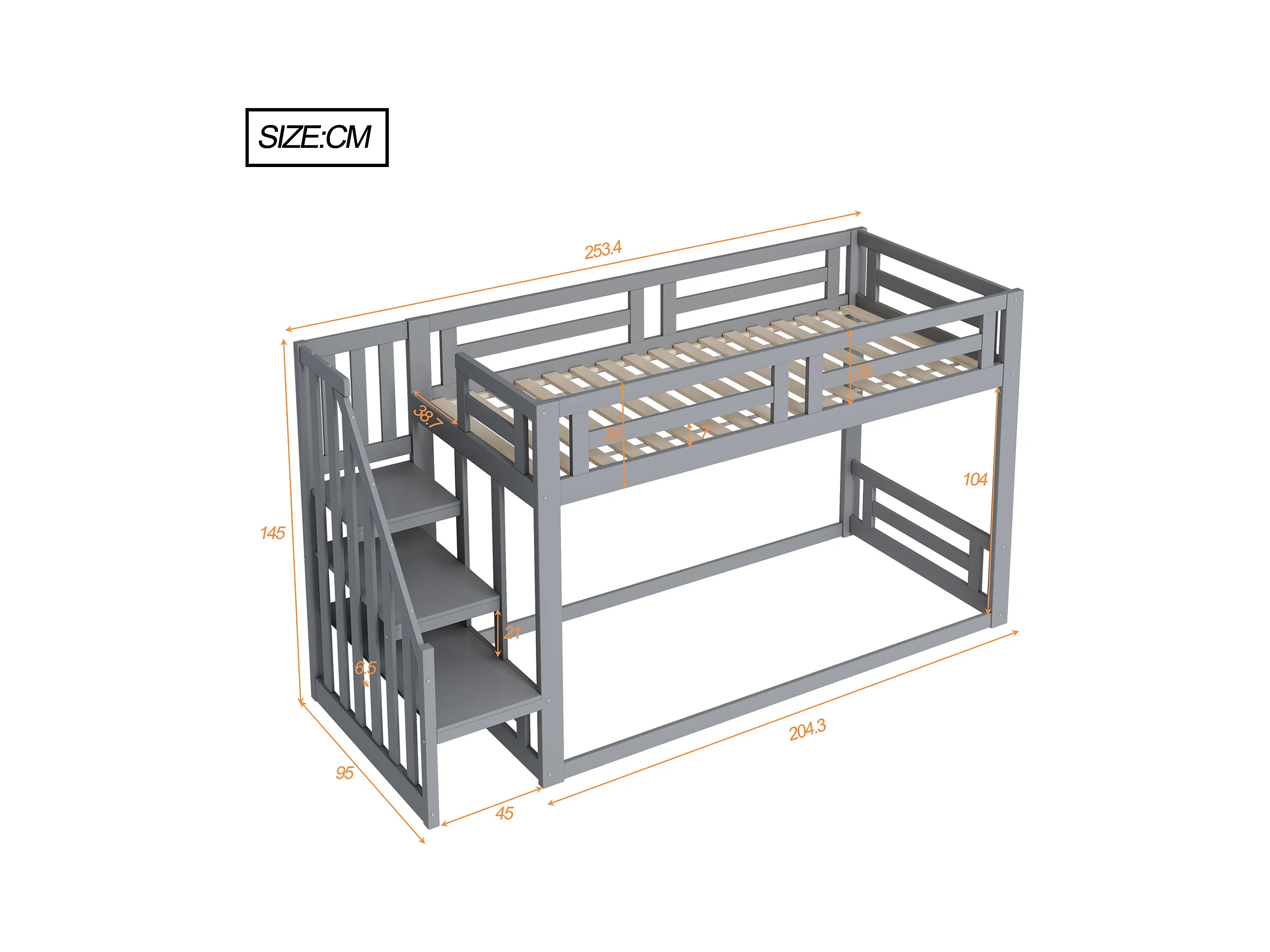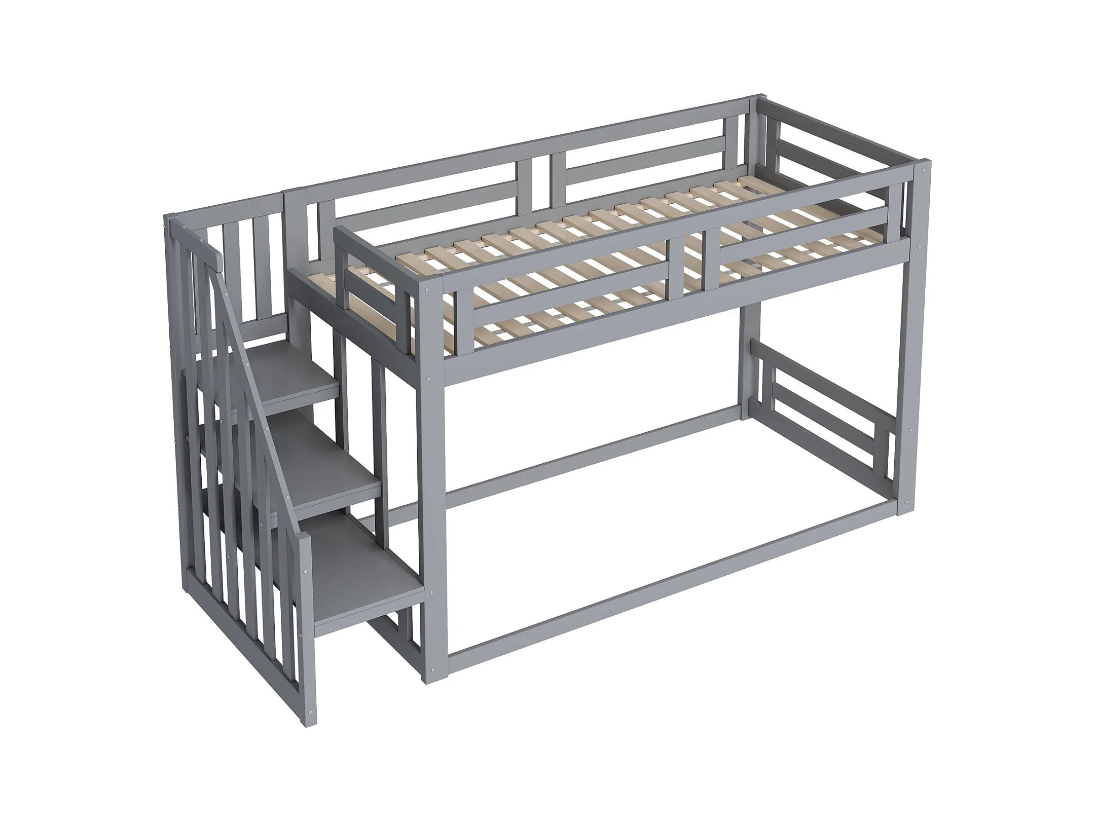 Laag stapelbed voor kinderen met veiligheidstrap, massief hout, grijs (205x95,5x221,5 cm)