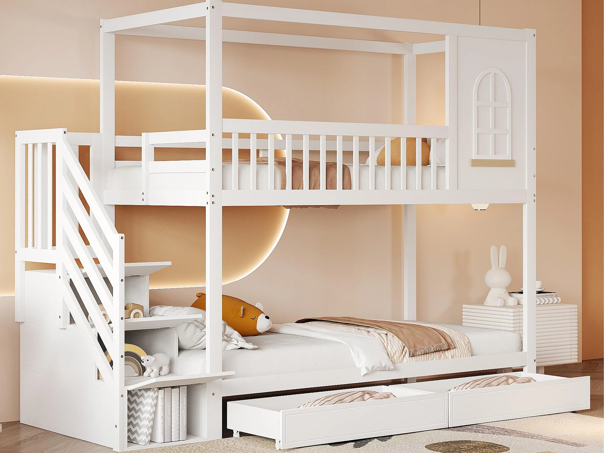 Stapelbed 90x200cm in massief hout - 2 laden en opbergtrap - Wit