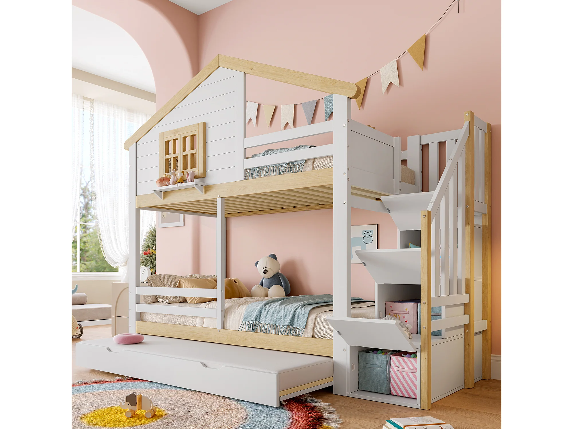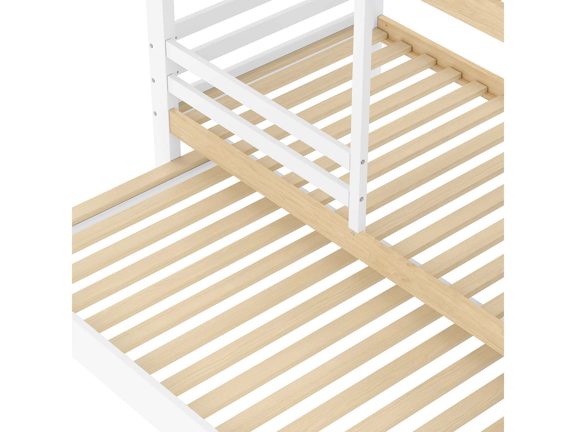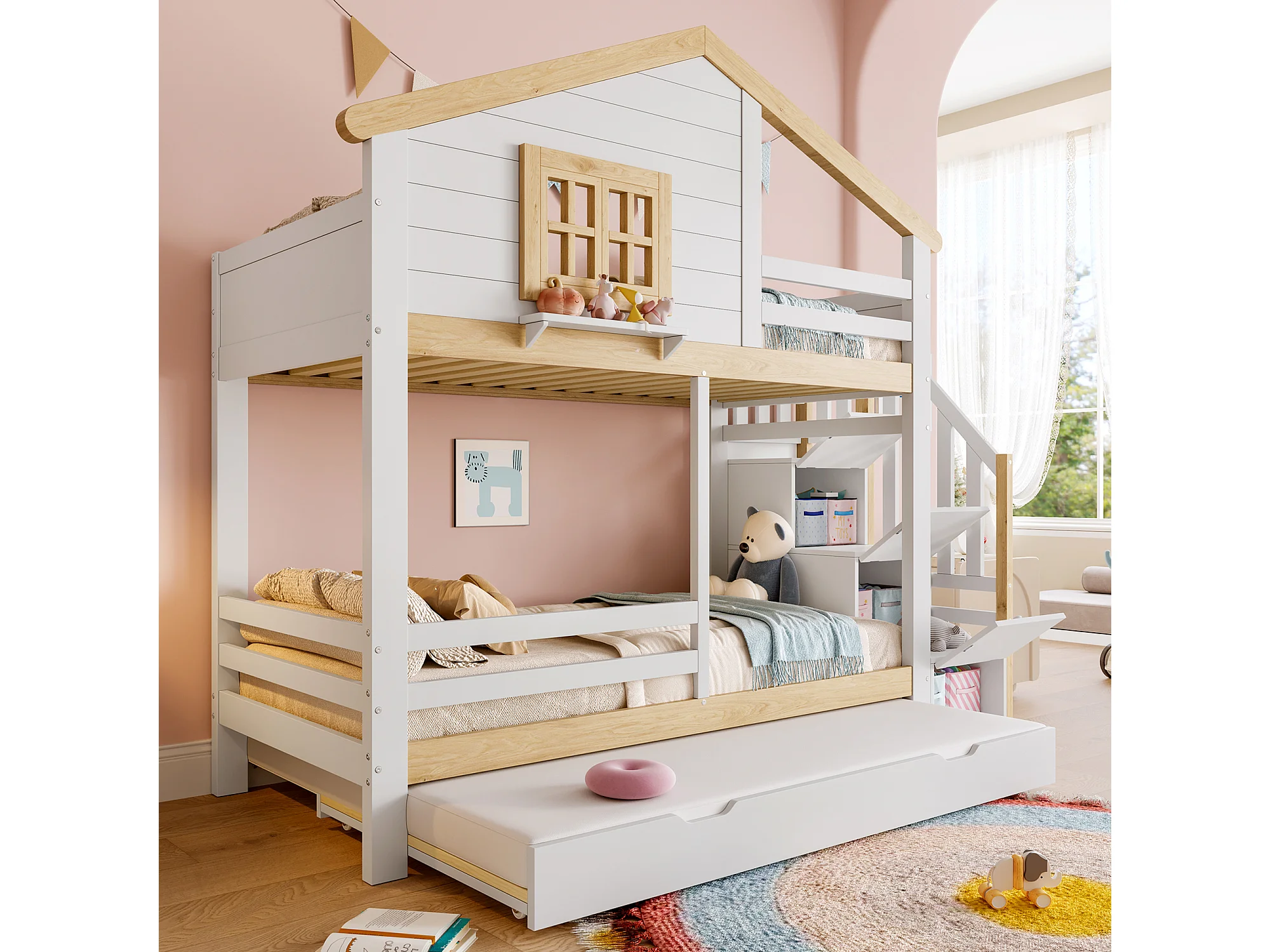 Stapelbed 90x200cm met opklapbed, planken, ramen en leuningen, huisontwerp, MDF, wit en naturel (254x105x200 cm)