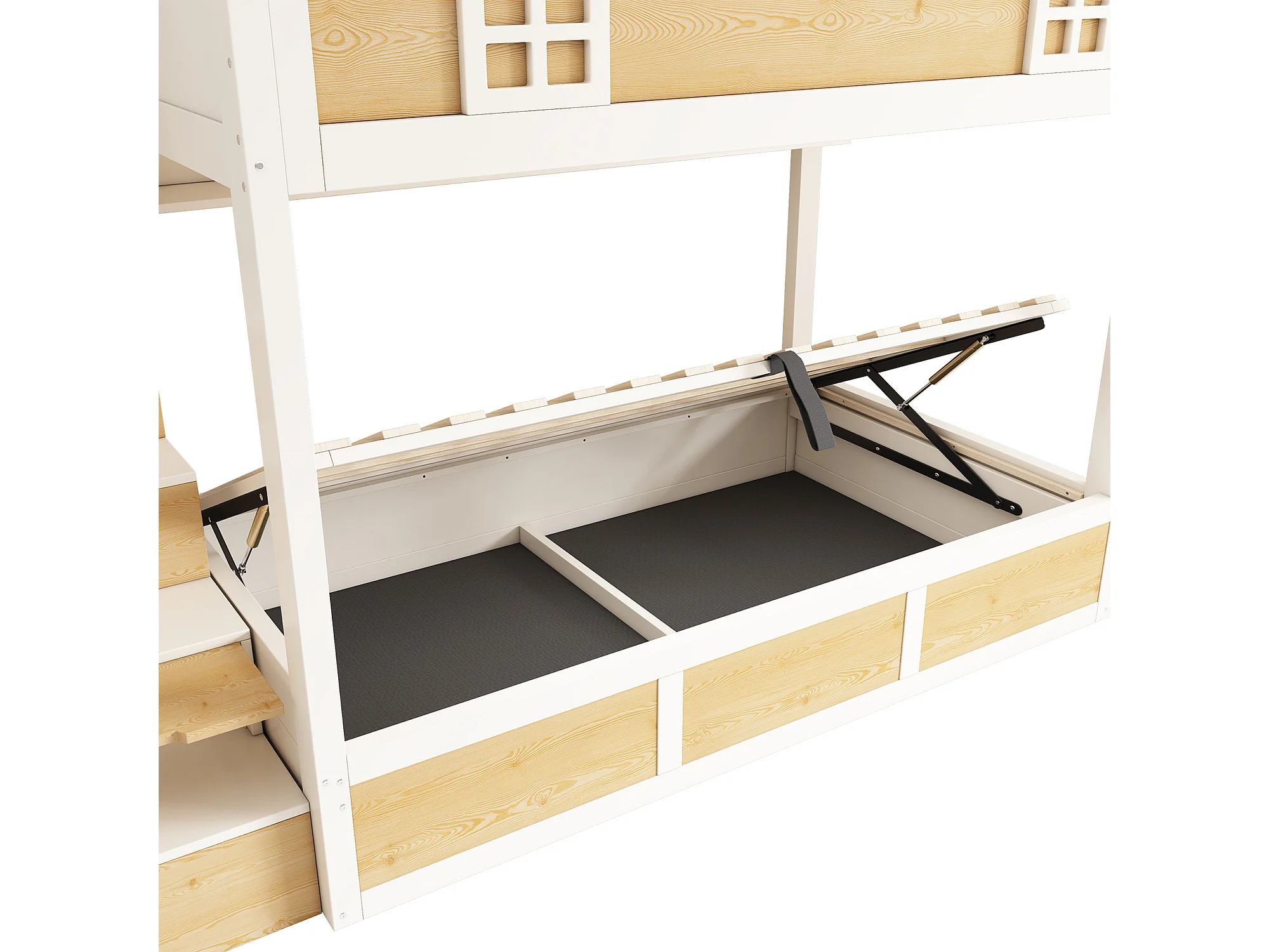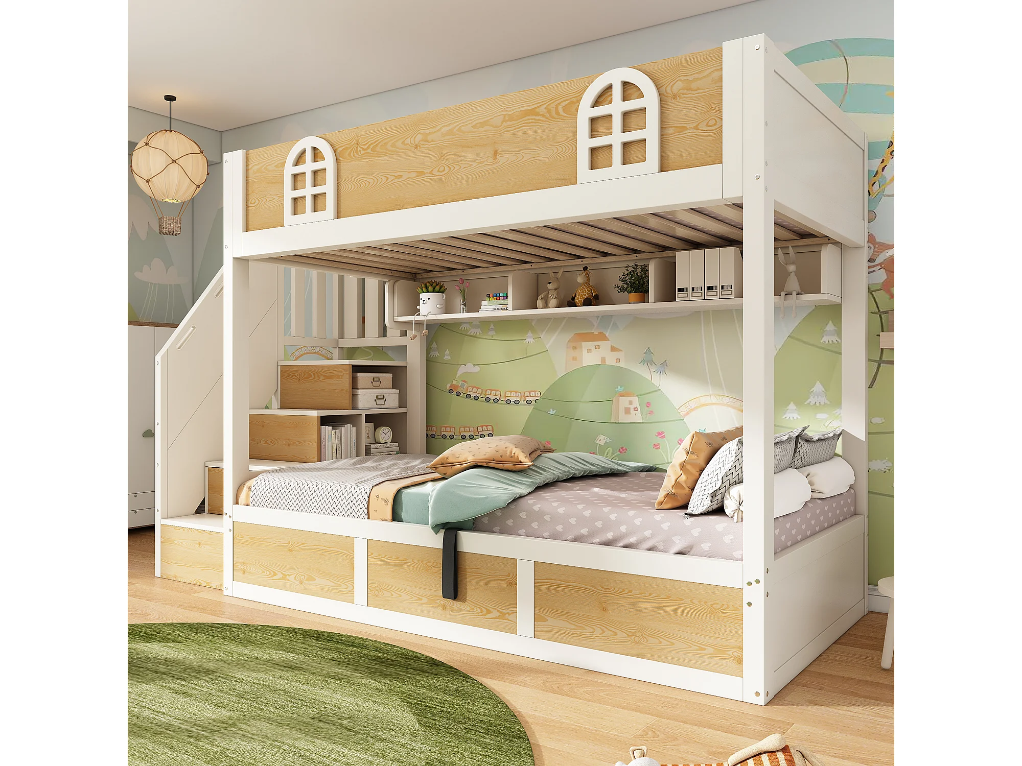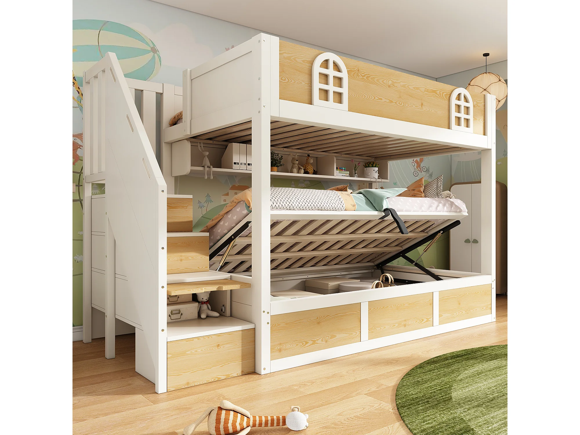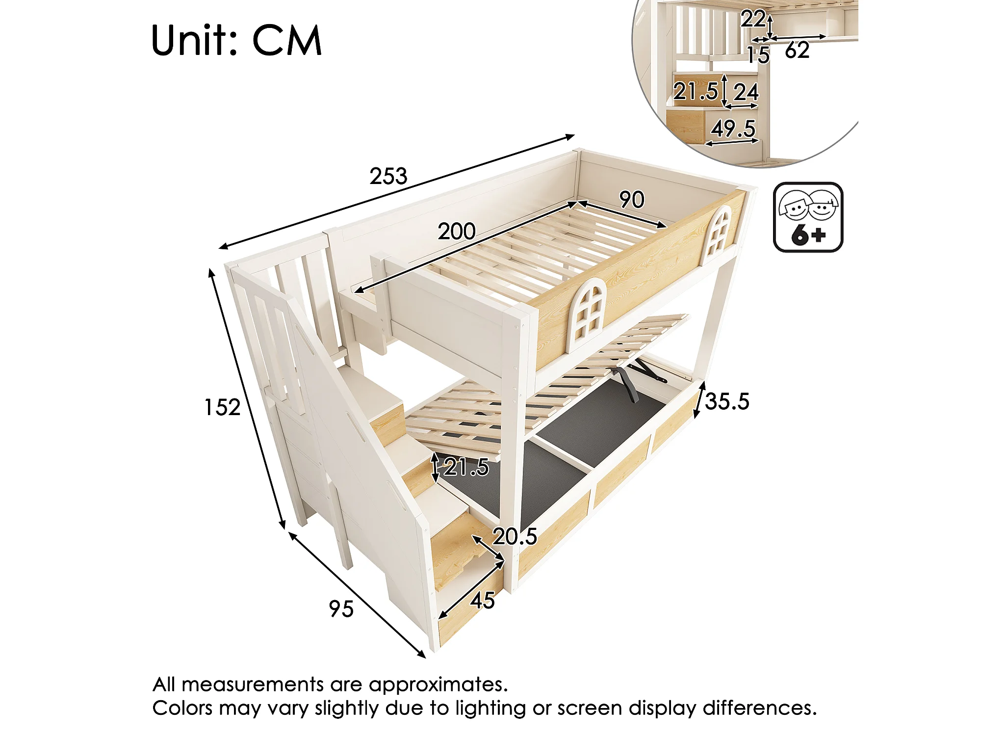 Stapelbed 90x200cm - Onderbed met opbergruimte - trap met opbergruimte - met veiligheidshek - Wit + Natuur
