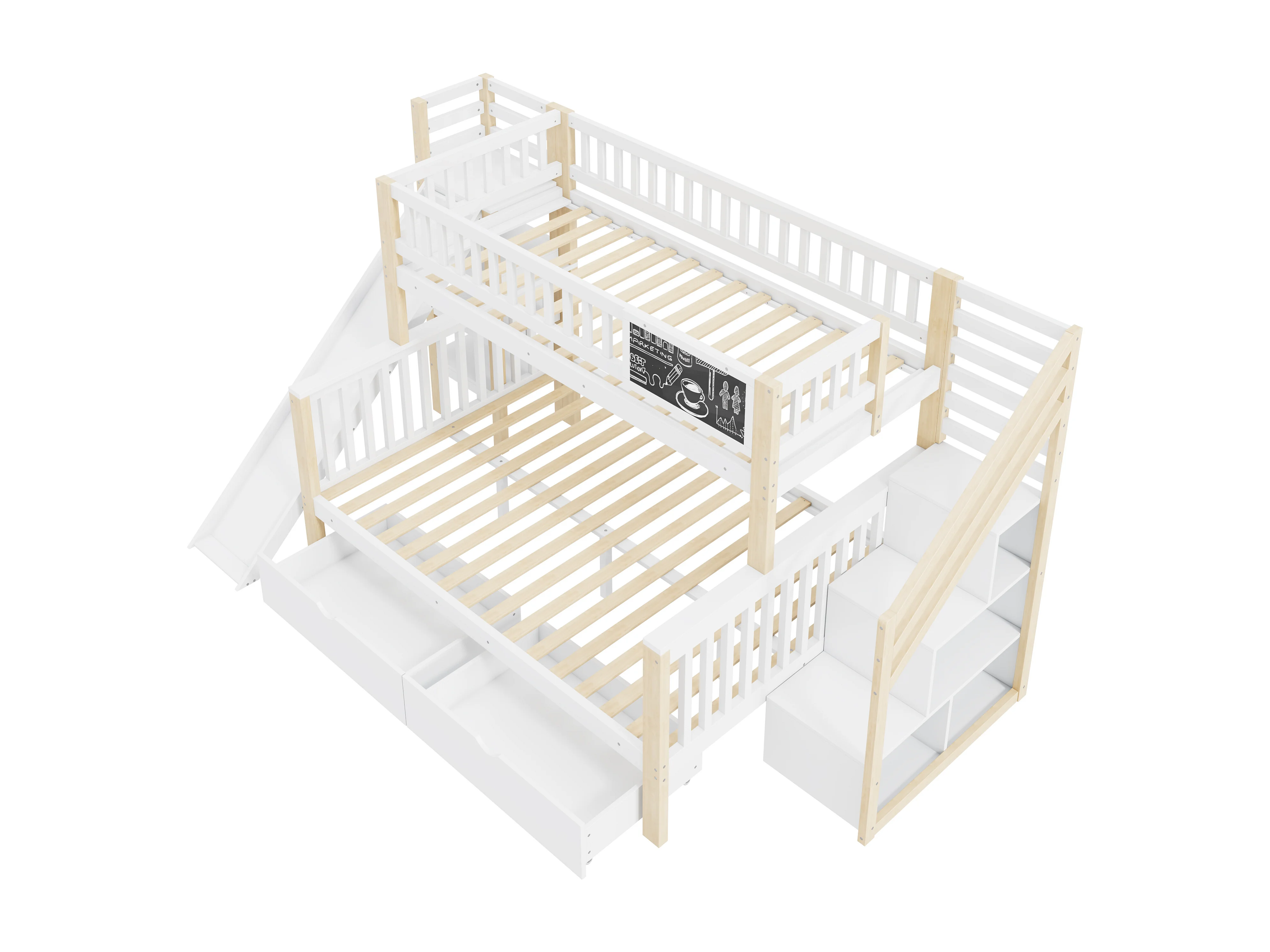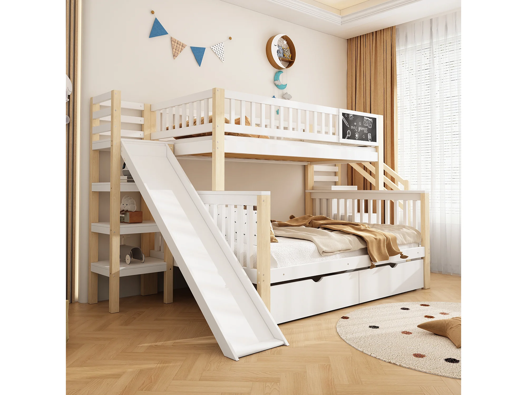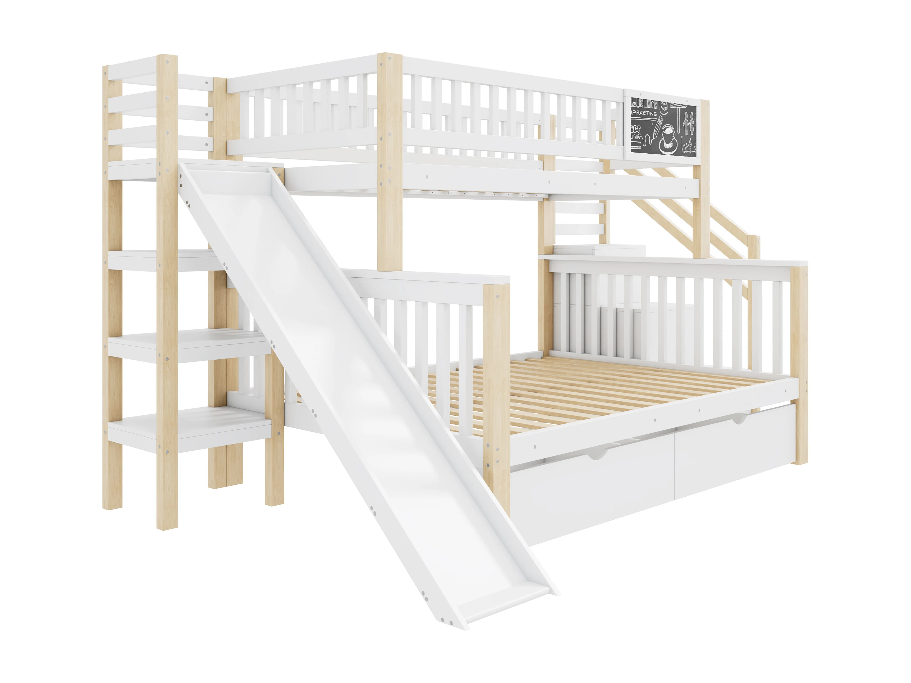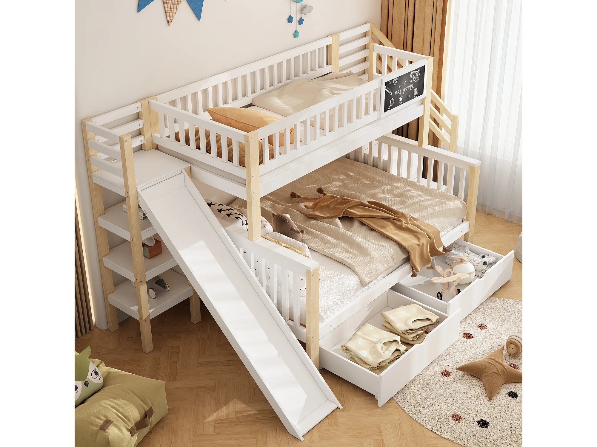 Stapelbedden 140 x 200 cm + 90 x 200 cm - 2 laden, glijbaan, opbergplanken - Massief hout - Wit (zonder matras)