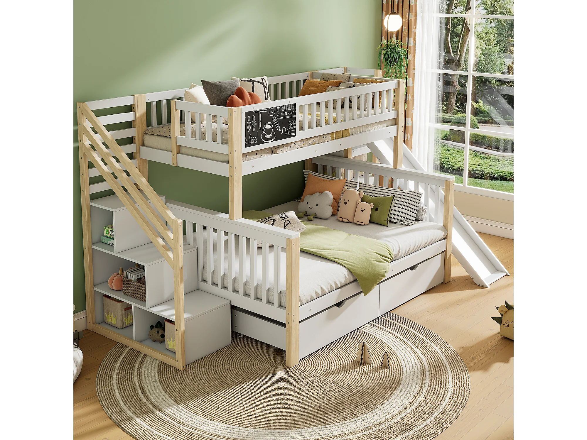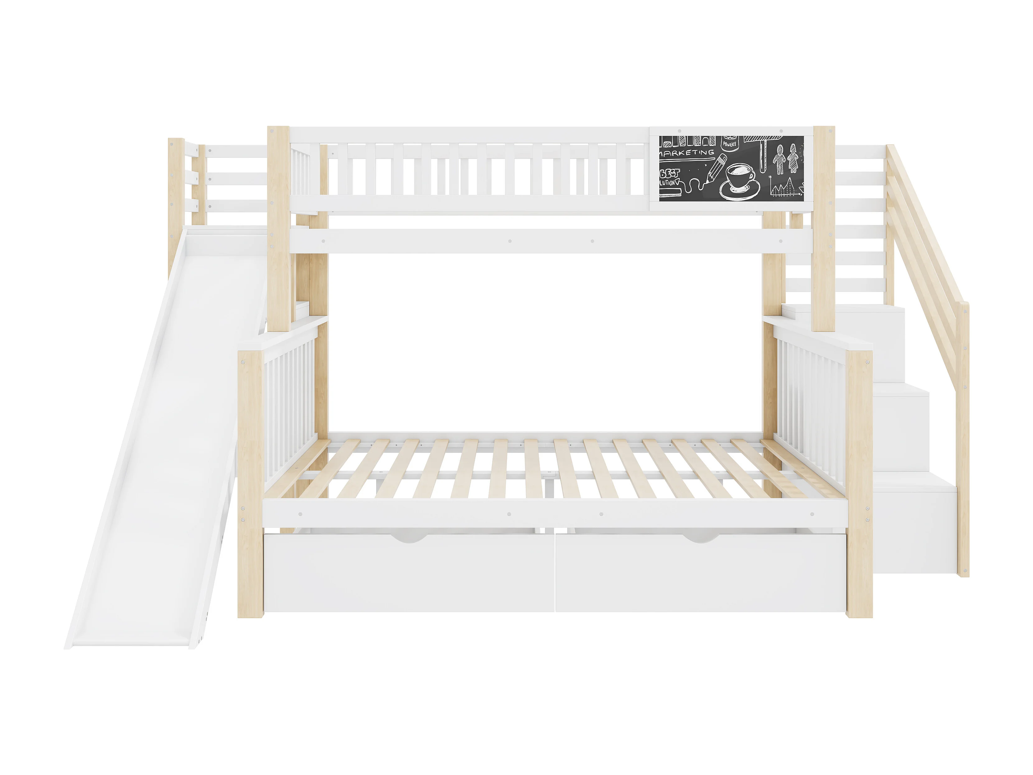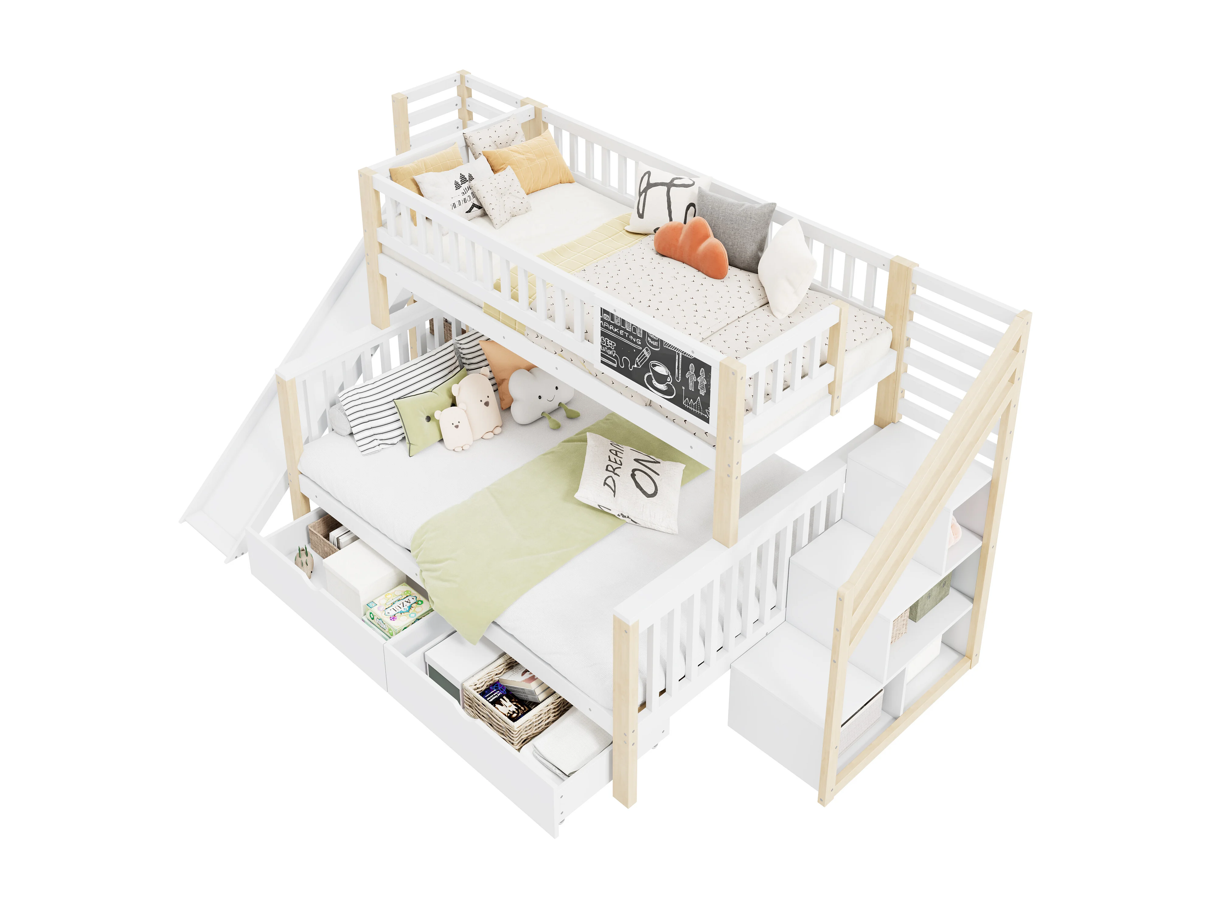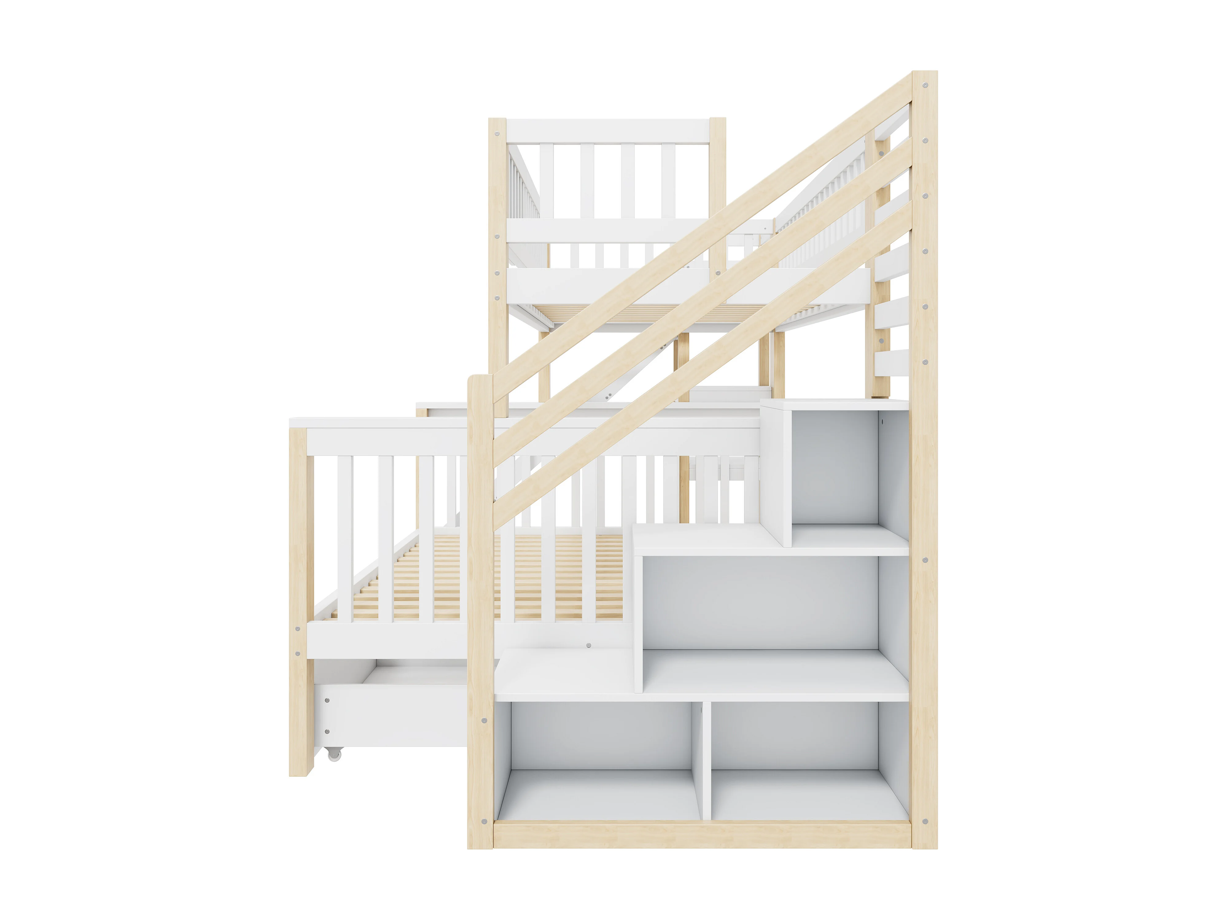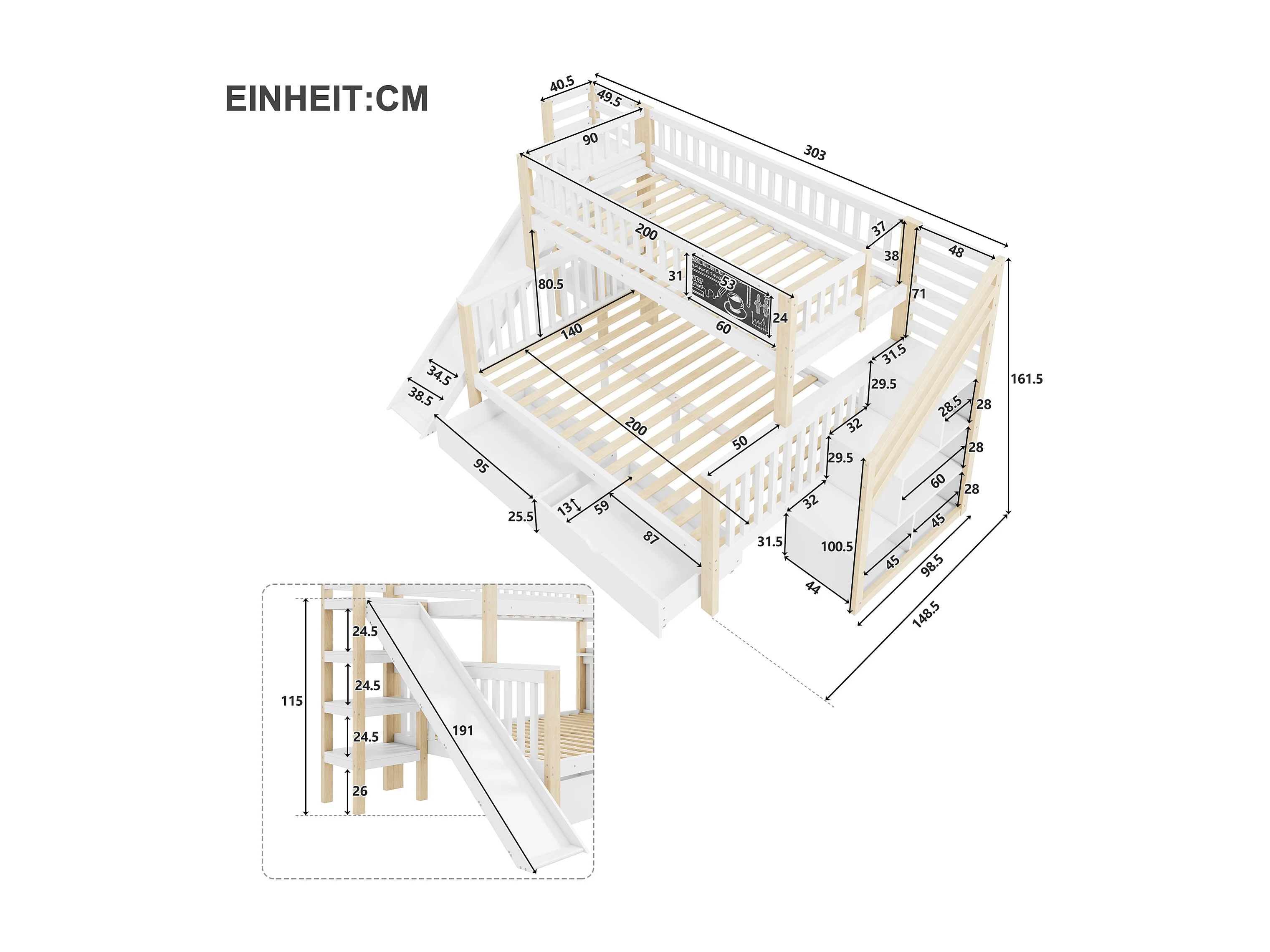 Stapelbedden 140 x 200 cm + 90 x 200 cm - 2 laden, glijbaan, opbergplanken - Massief hout - Wit (zonder matras)