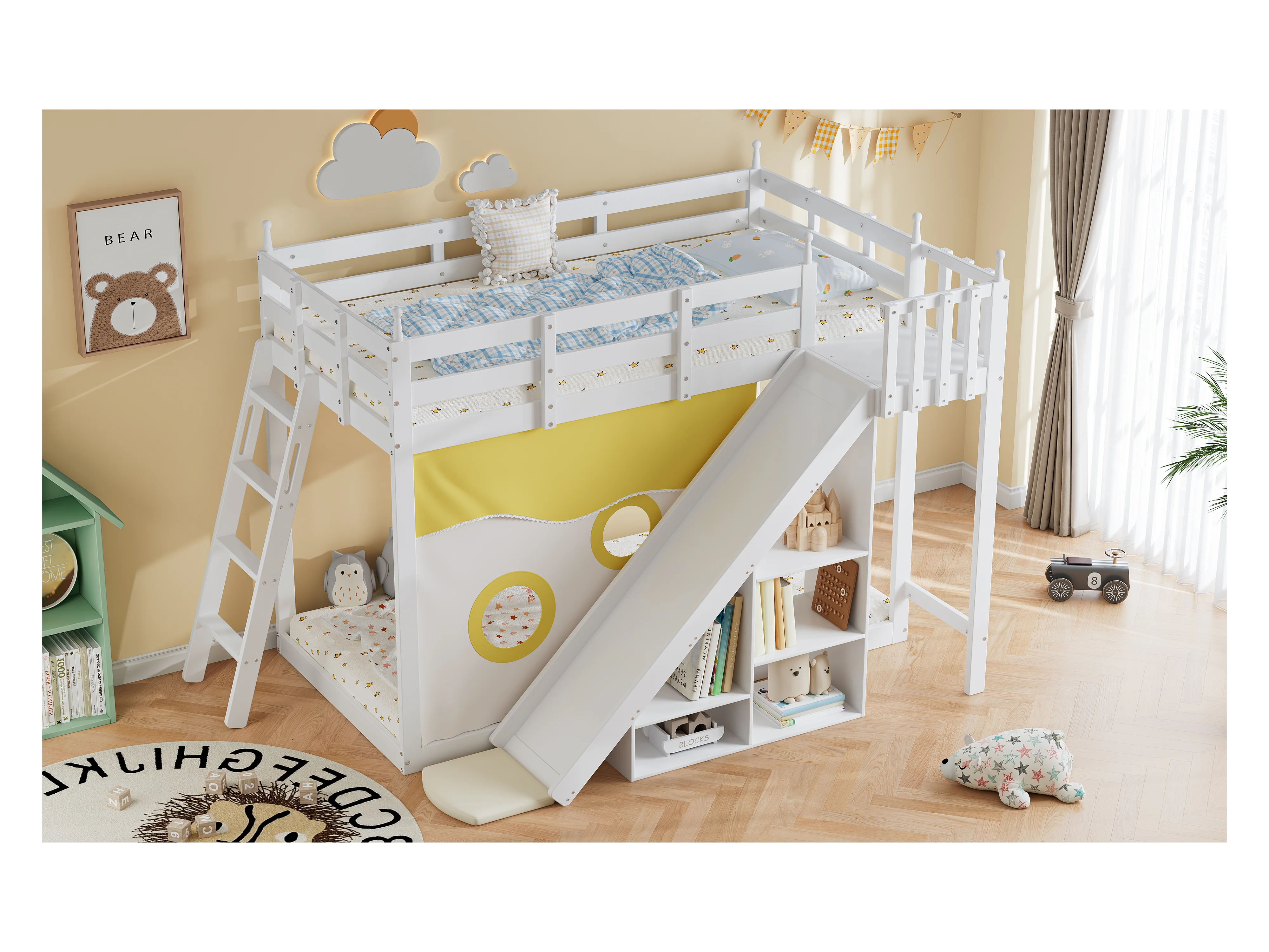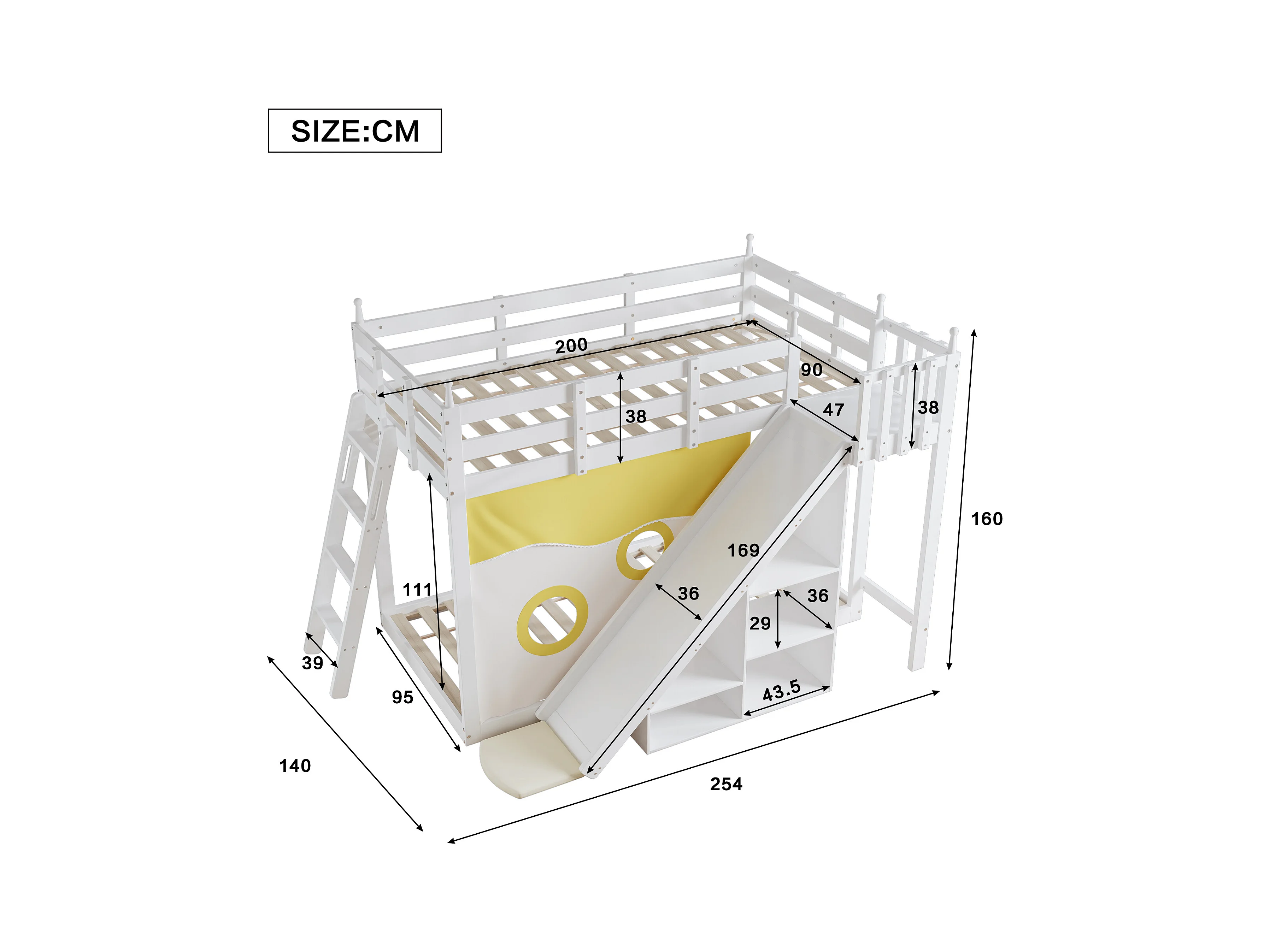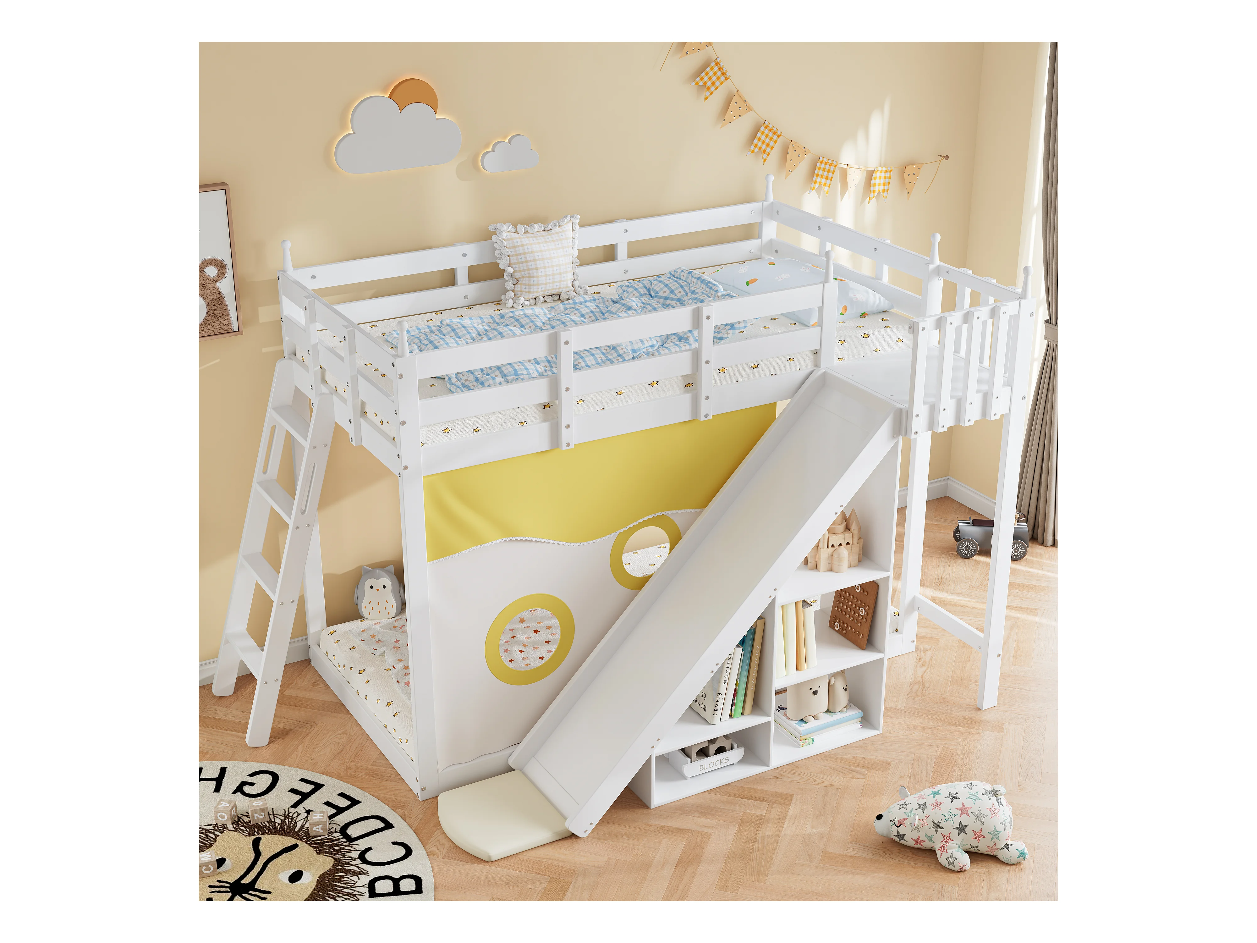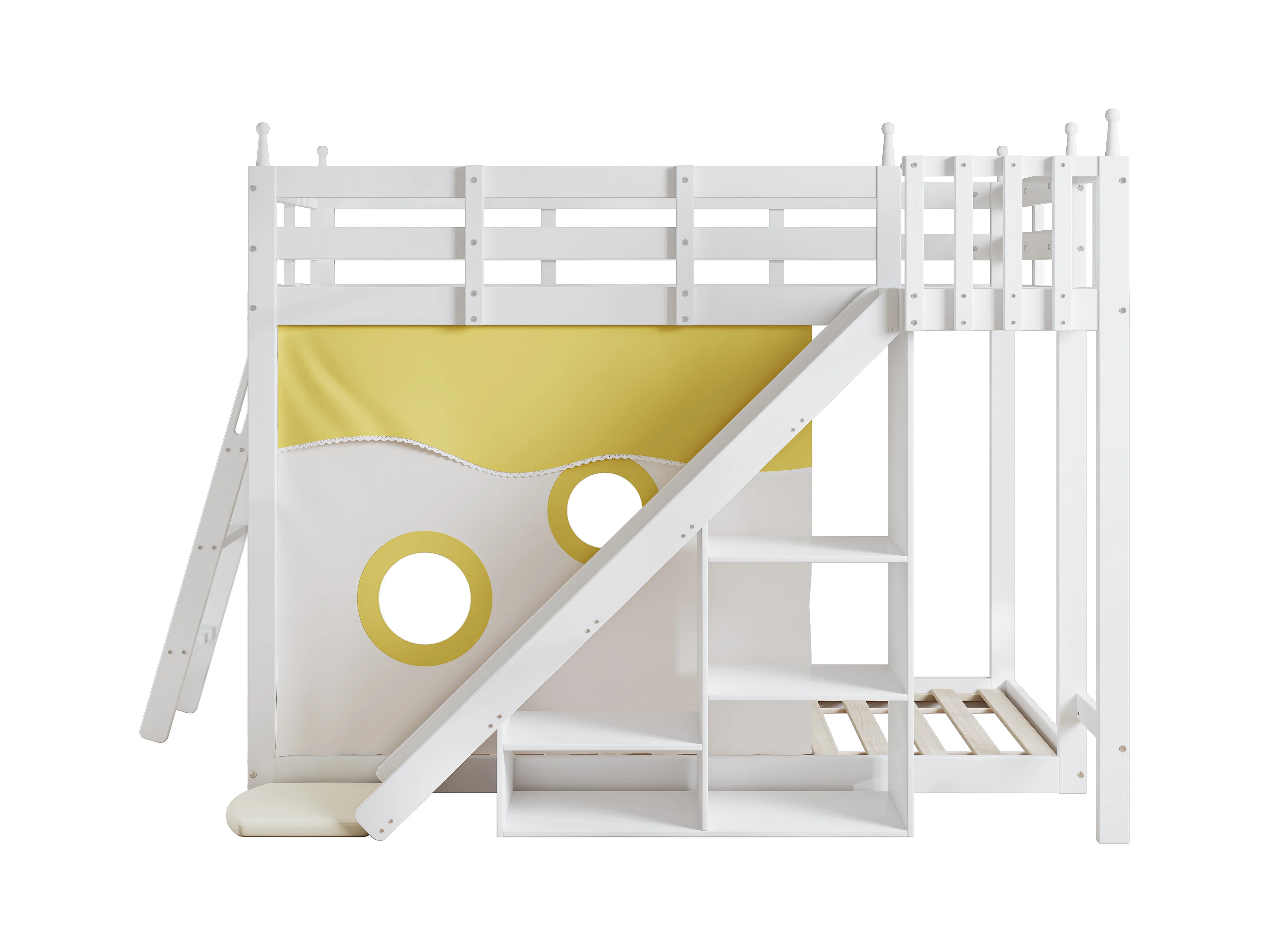 Stapelbedden 2 x 90 x 200 cm met opbergplanken, glijbaan & bedgordijn - grenen + MDF - wit (zonder matras)
