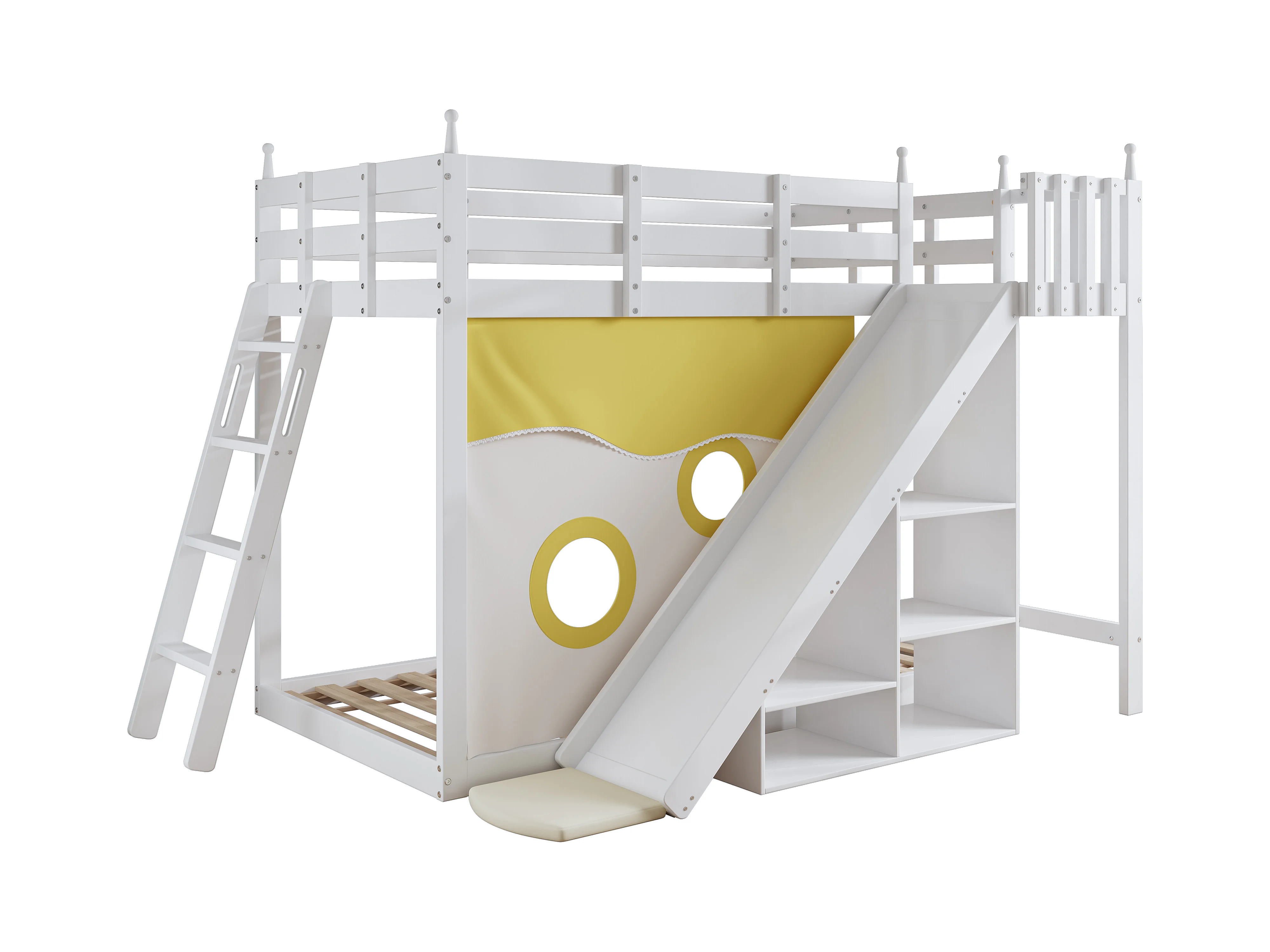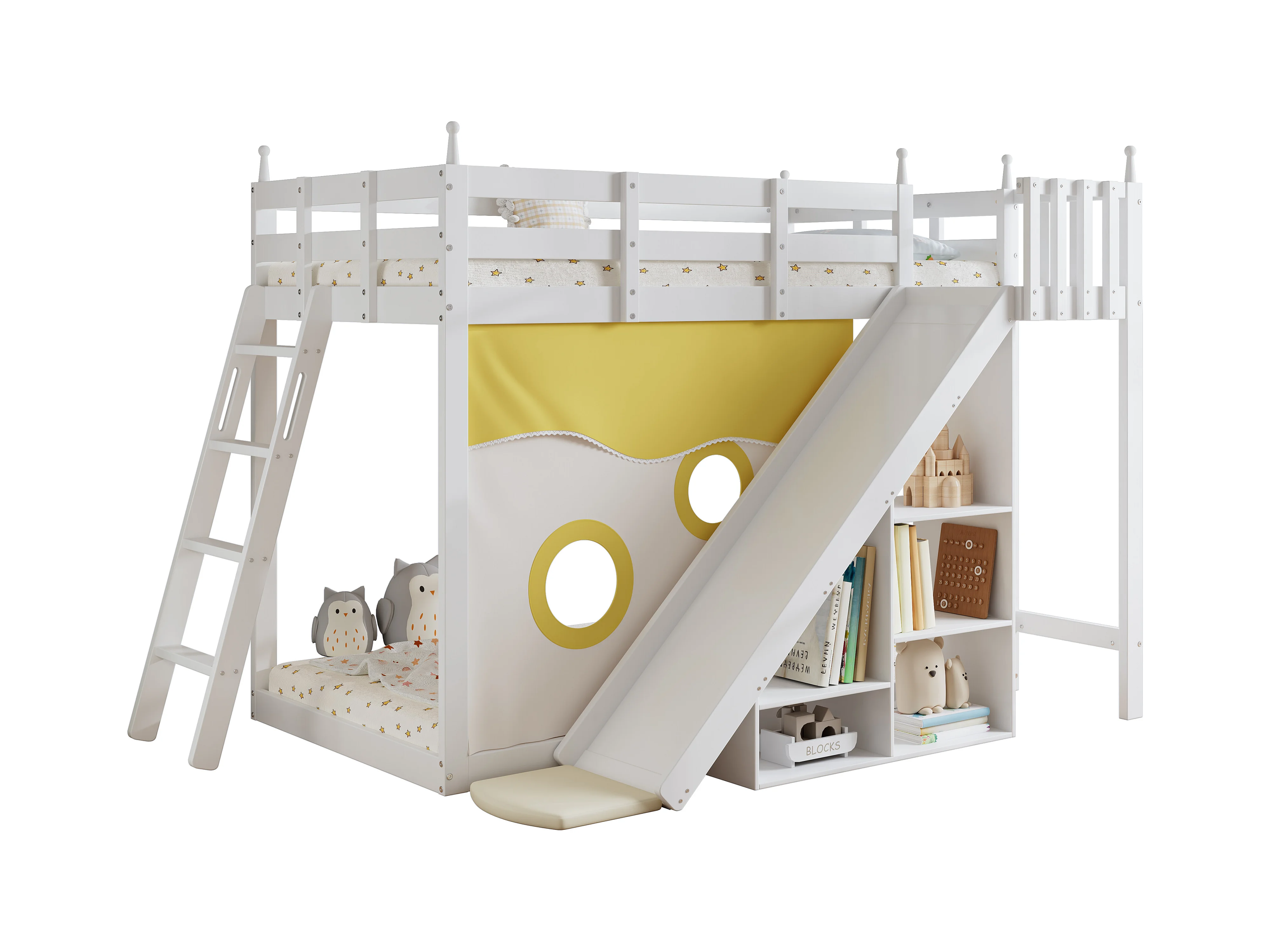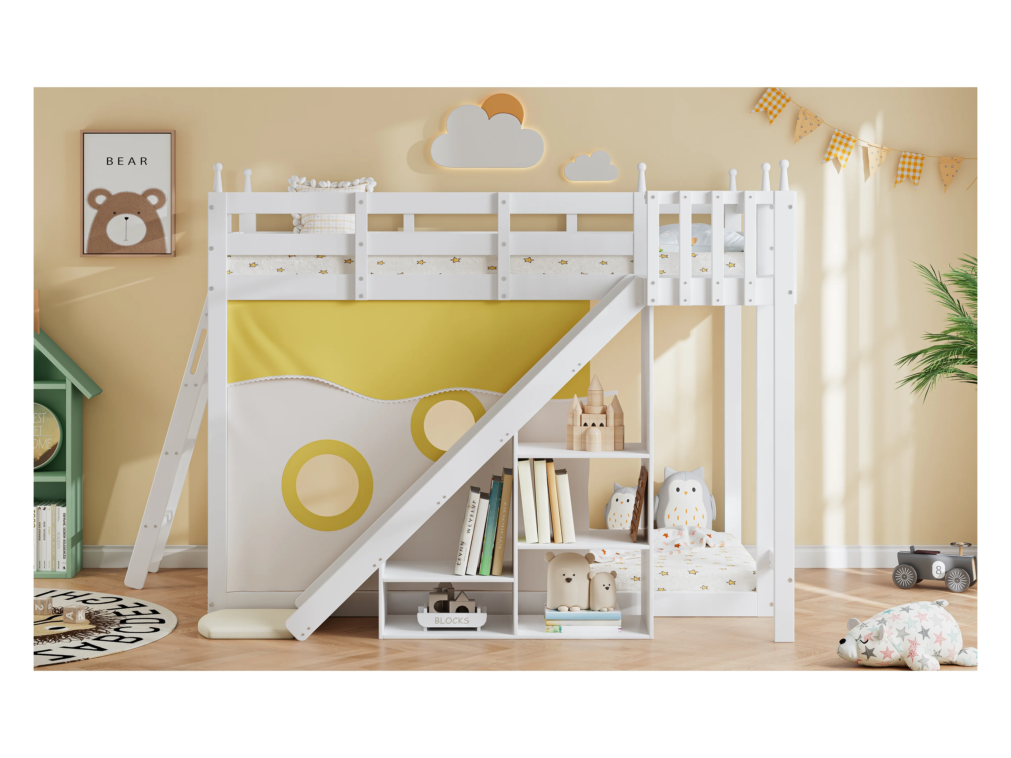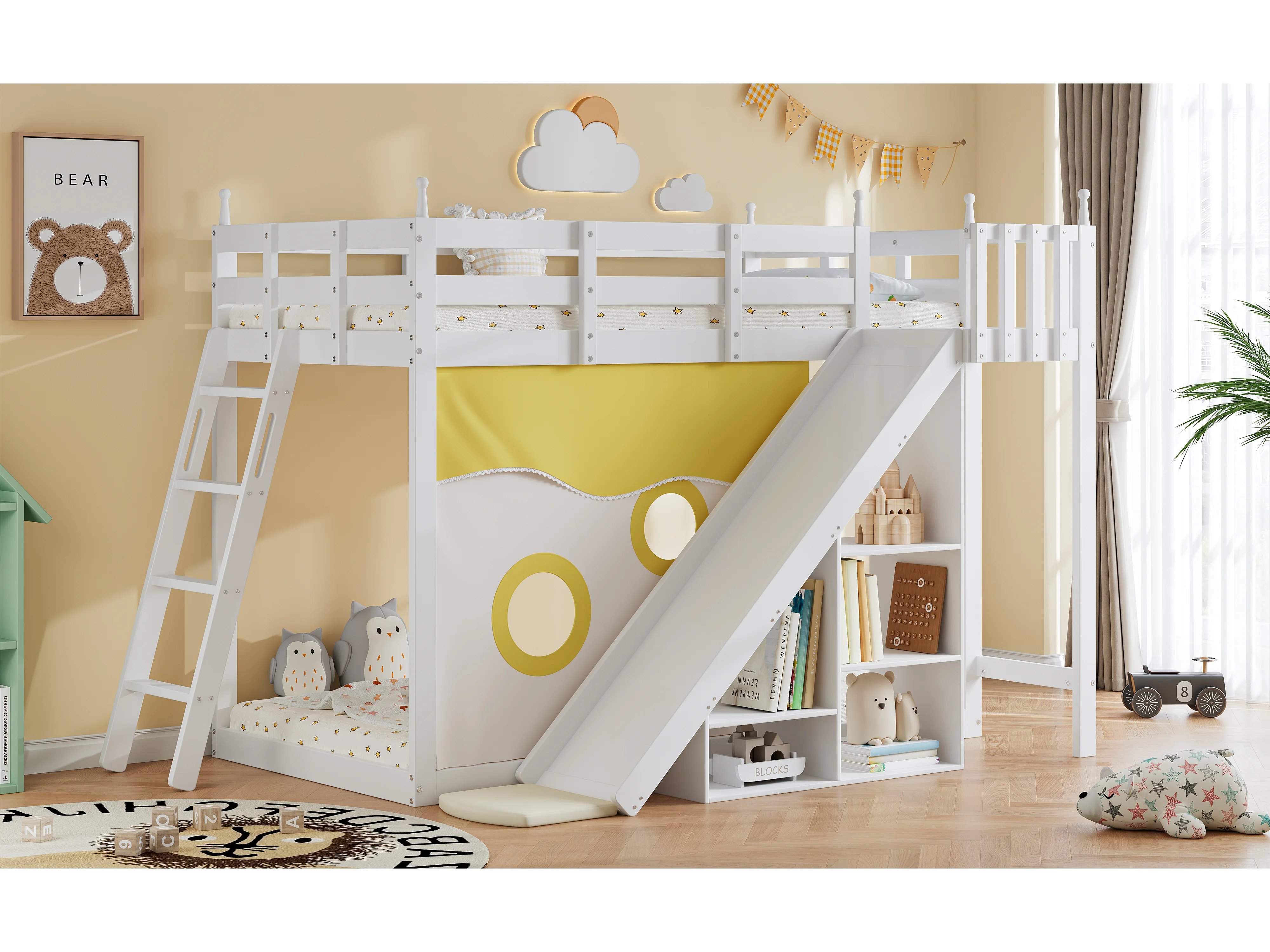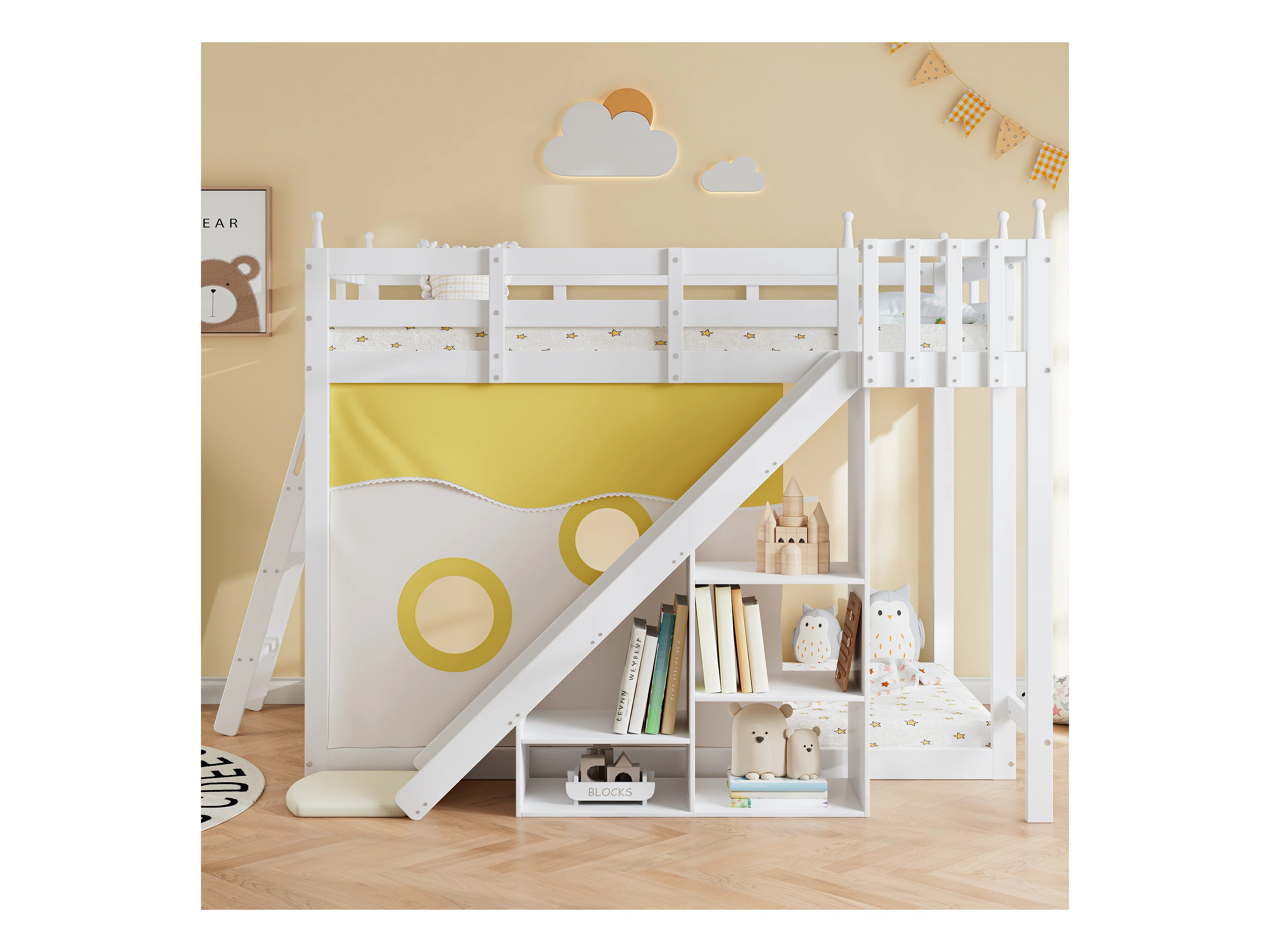 Stapelbedden 2 x 90 x 200 cm met opbergplanken, glijbaan & bedgordijn - grenen + MDF - wit (zonder matras)