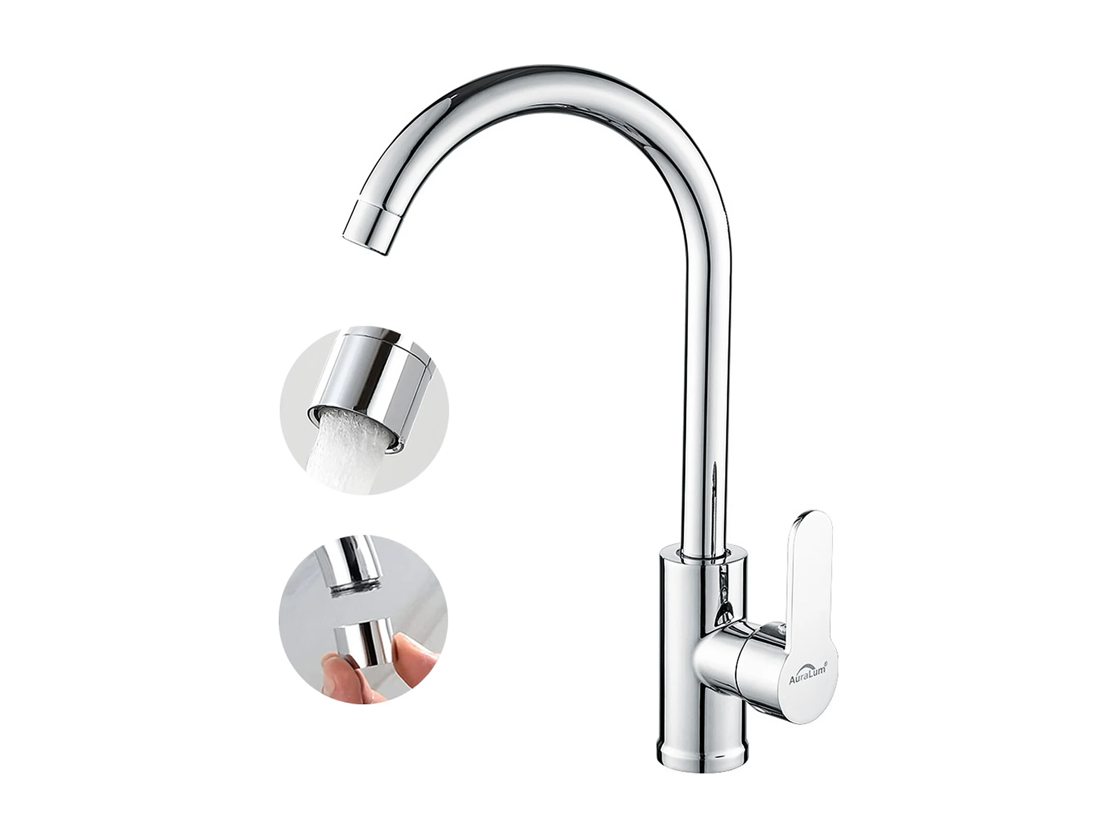 Auralum MAX Verchroomde keukenmengkraan, 360° draaibare hoge uitloop, gootsteenkraan met afneembare opschuimer RVS spoelbakmengkraan koud/warm water