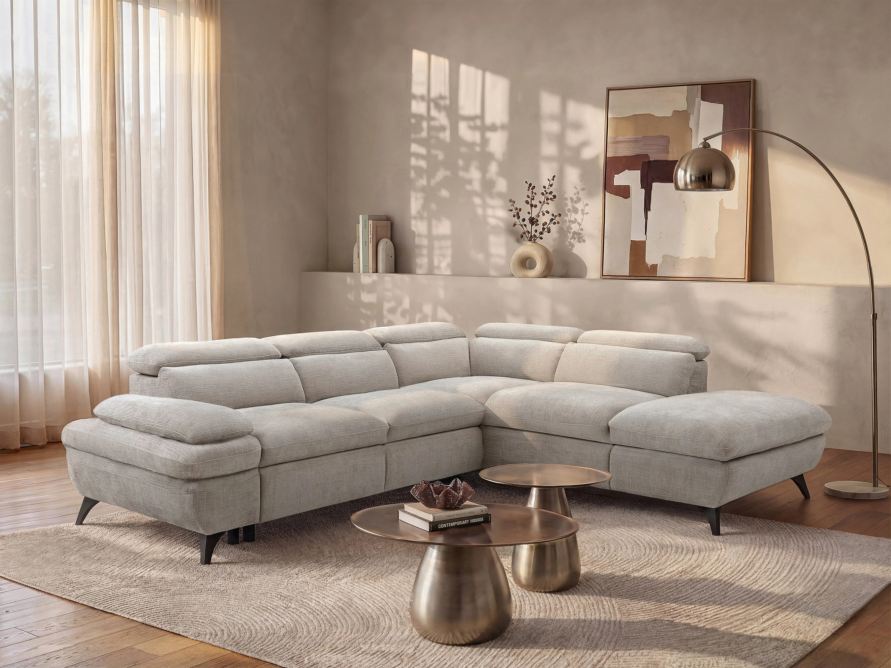 Omkeerbare hoekslaapbank met hoek rechts van beige stof met structuur SURDELI
