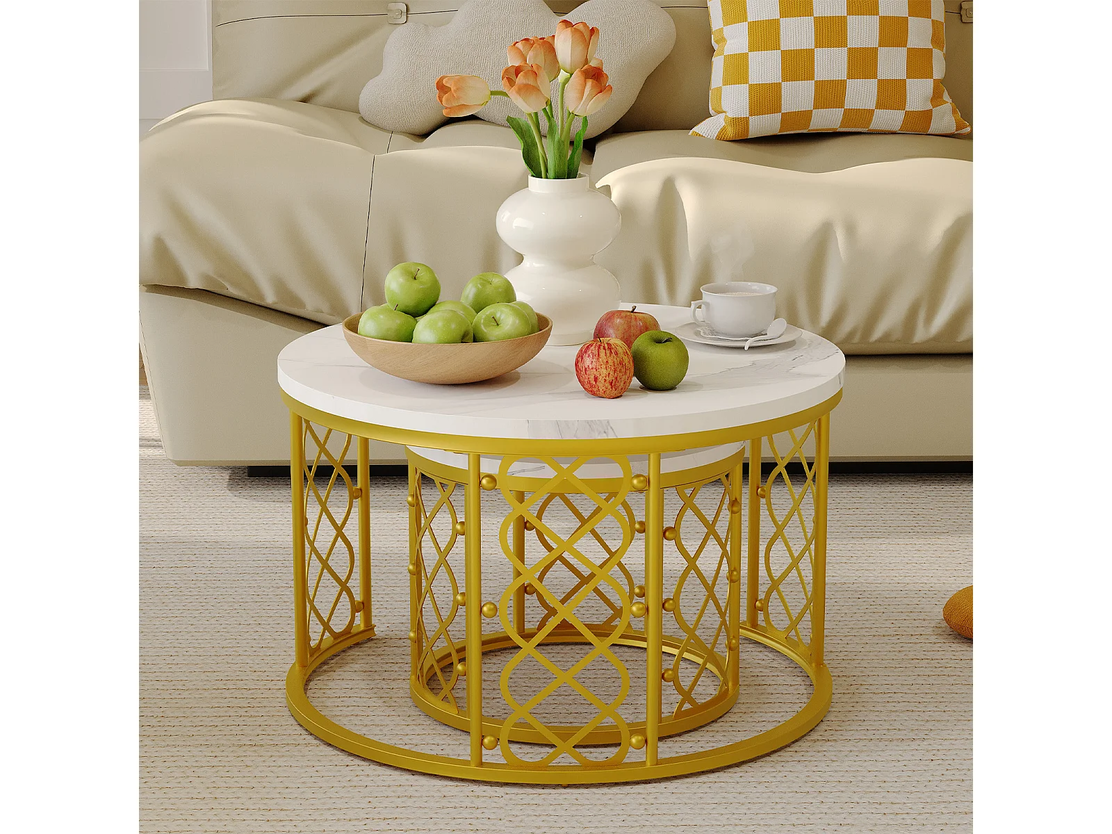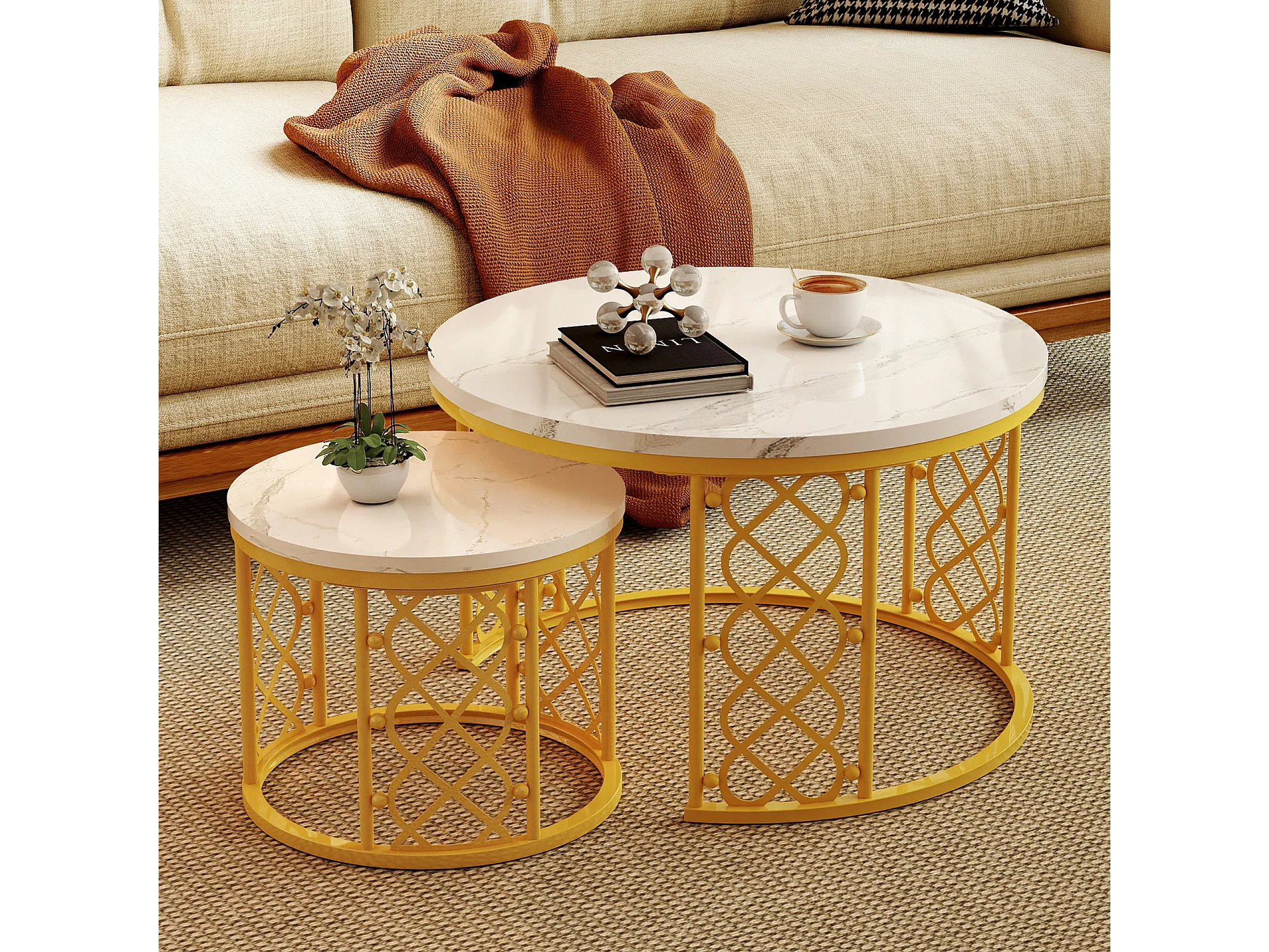 Table basse Maisentiel Gigogne ronde 2 pièces effet marbre plateau metaal or motif cœur ajouré empilable