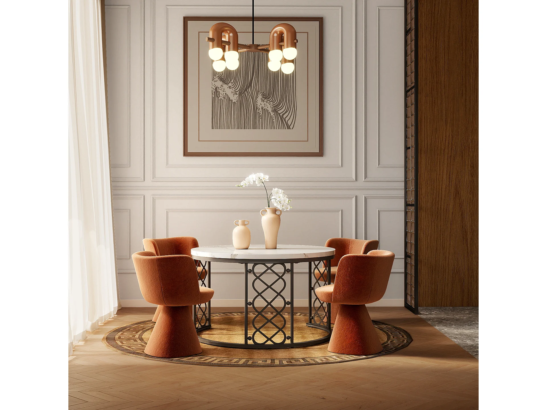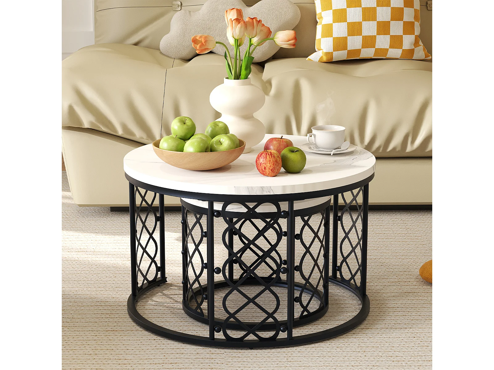 Table basse Maisentiel Gigogne ronde 2 pièces effet marbre plateau metaal zwart motif cœur ajouré empilable wit et zwart