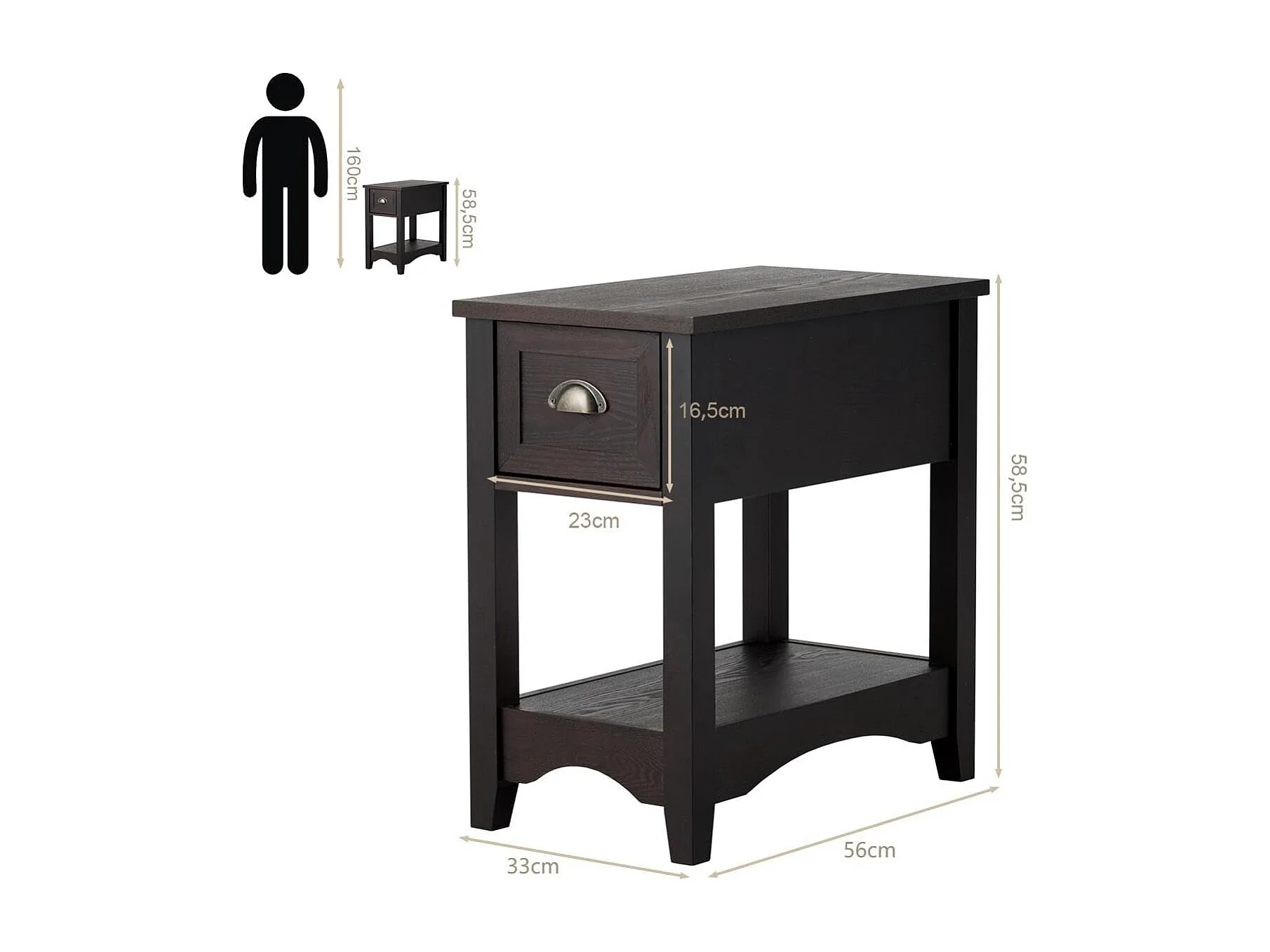 Nachtkastje met lade, bijzettafel met poten van rubberhout, retro bijzettafel voor slaapkamer of woonkamer, 56 x 33 x 58,5 cm (walnoot, set van 2)