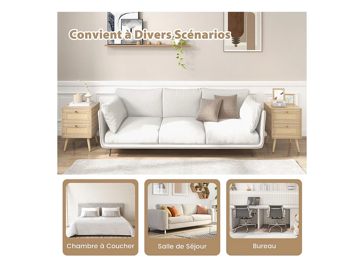 Set van 2 rotan nachtkastjes, houten nachtkastje met lade, 4 grenen poten, Cannage-ontwerp, open vak, Boheemse stijl, Scandinavische bijzettafel voor woonkamer, slaapkamer
