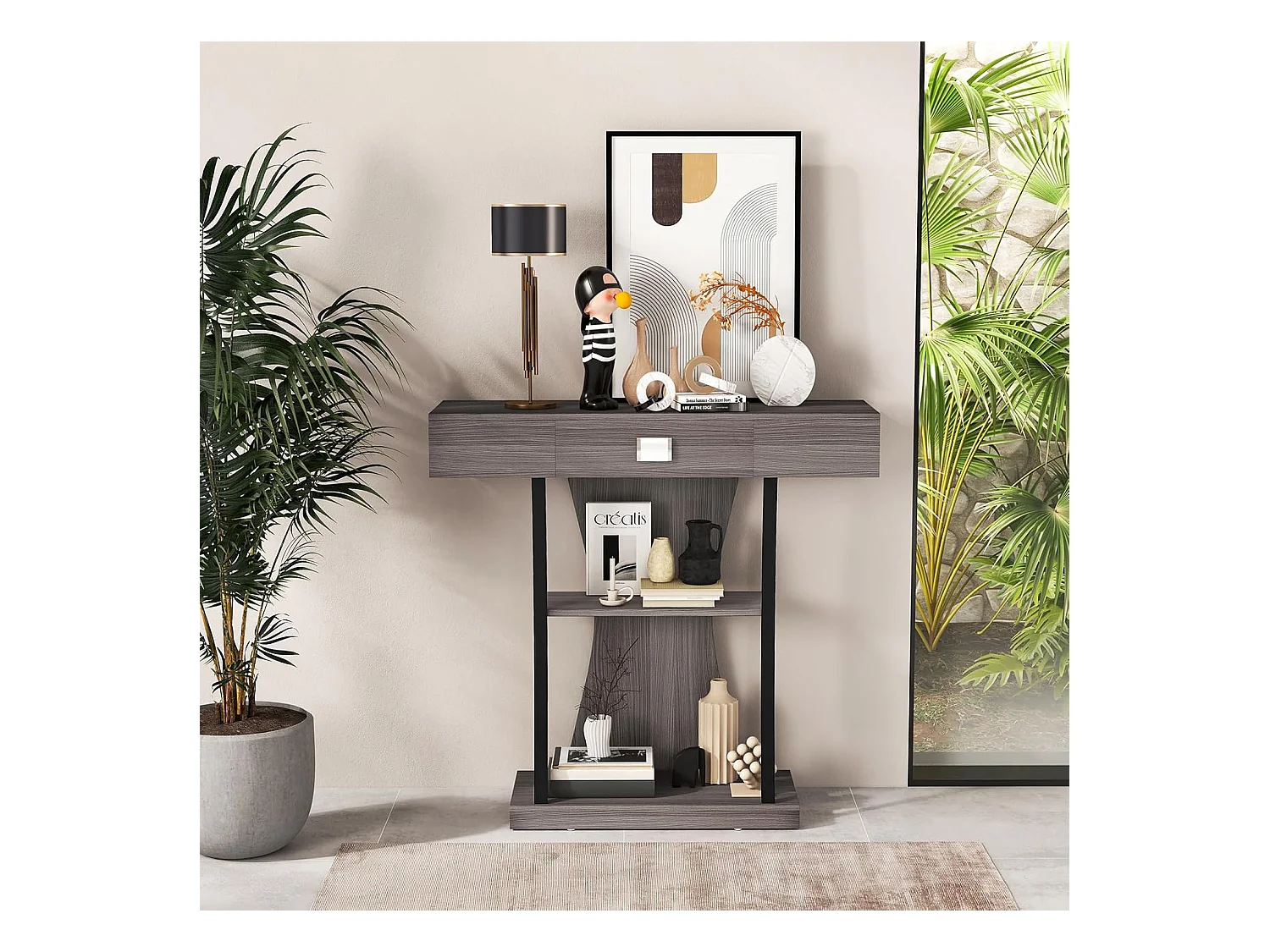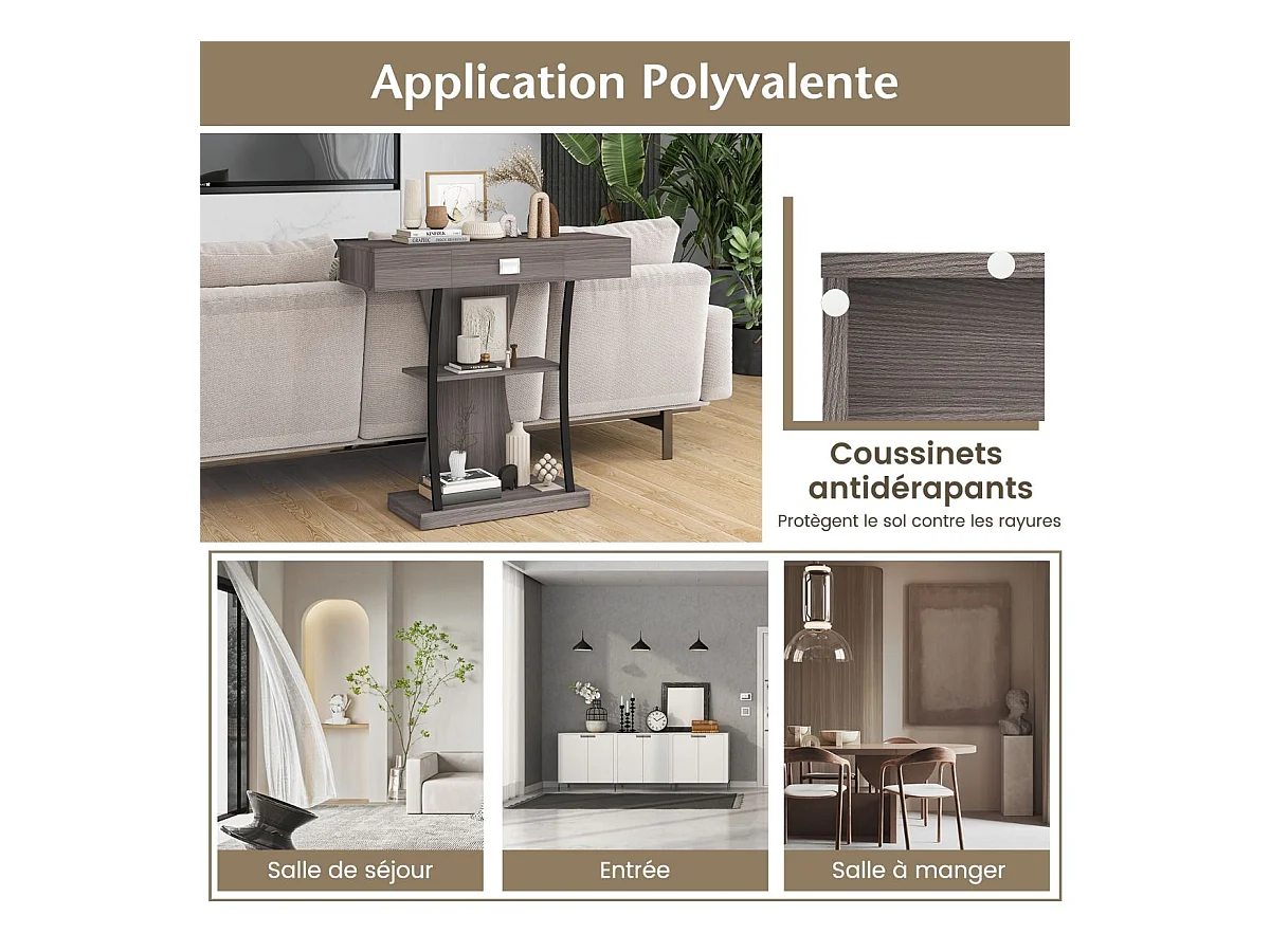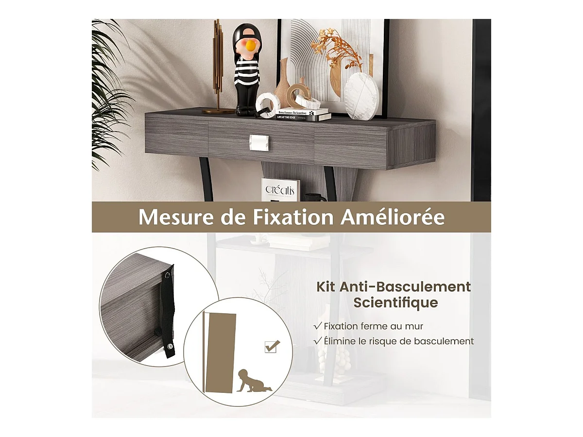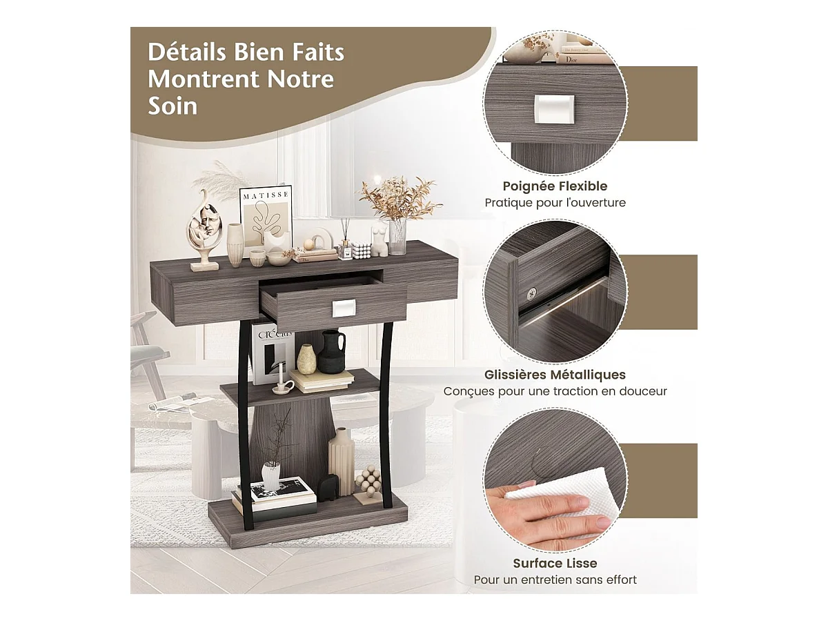 Industriële consoletafel met 3 planken en lade, 91 x 30 x 88 cm (grijs)
