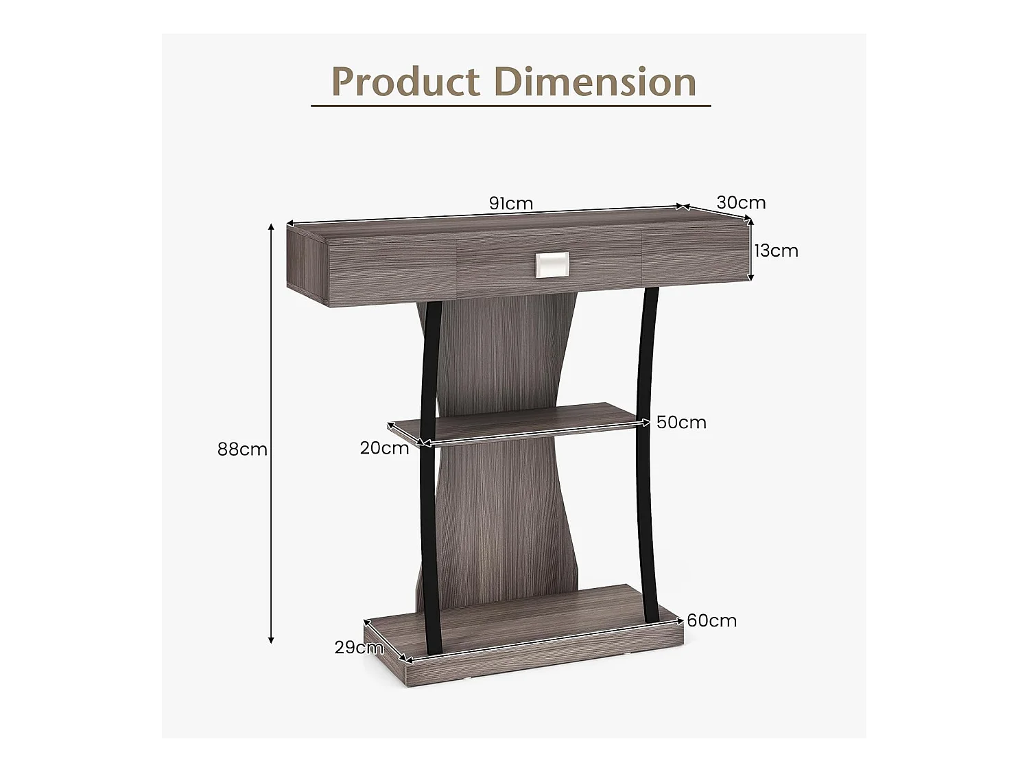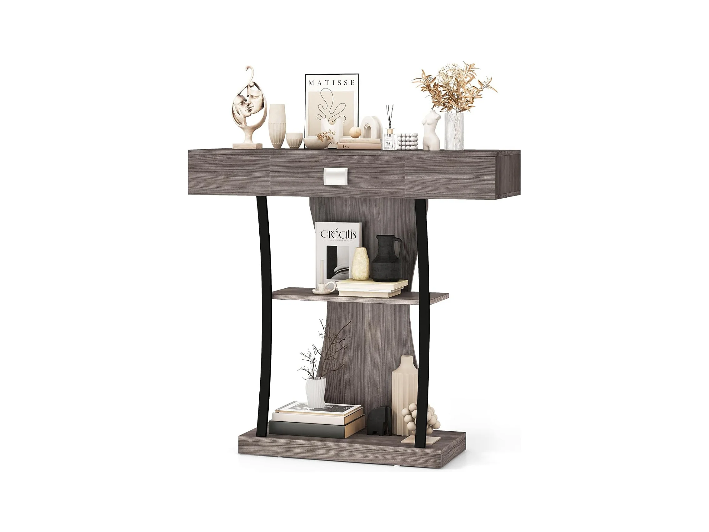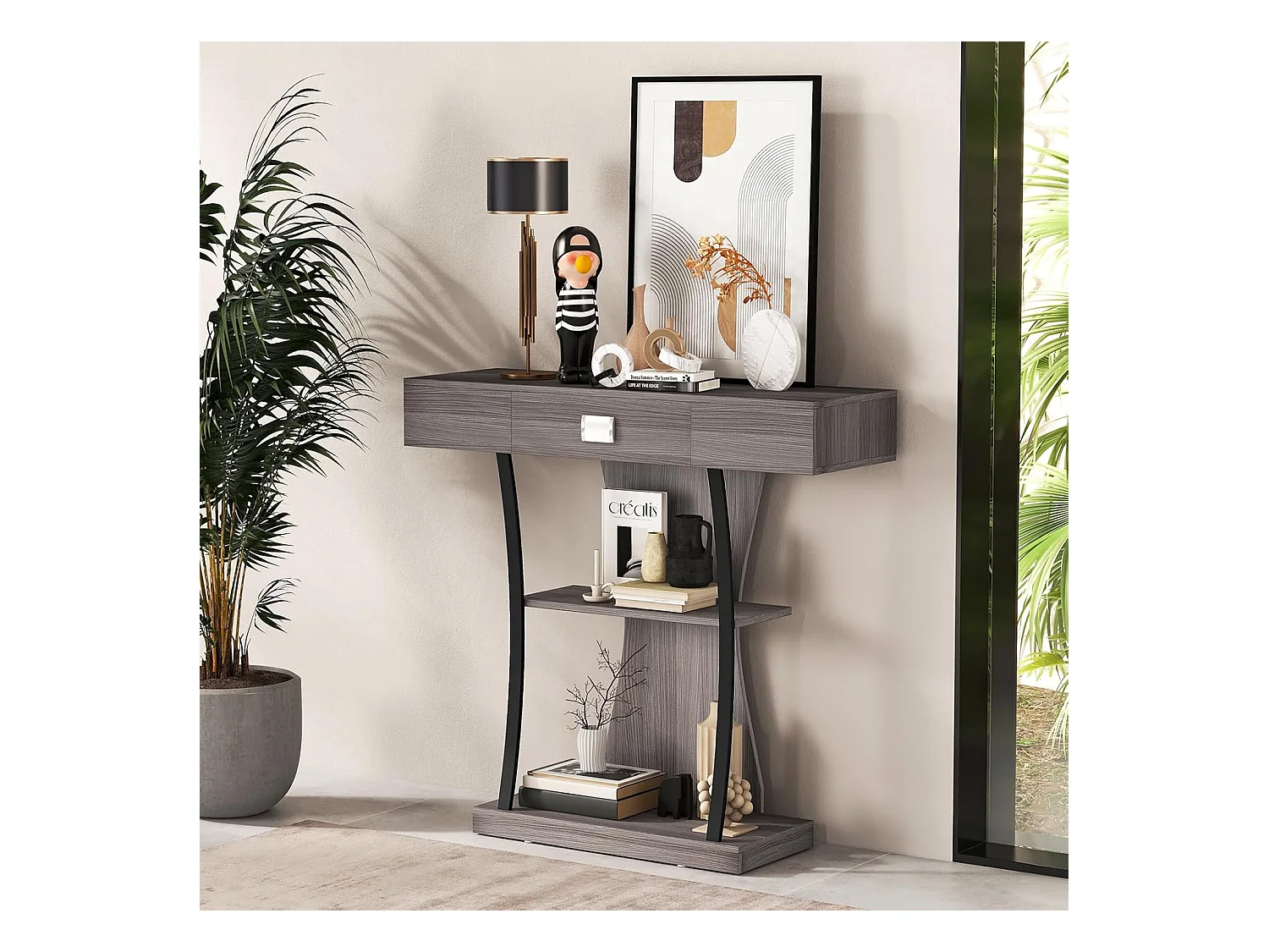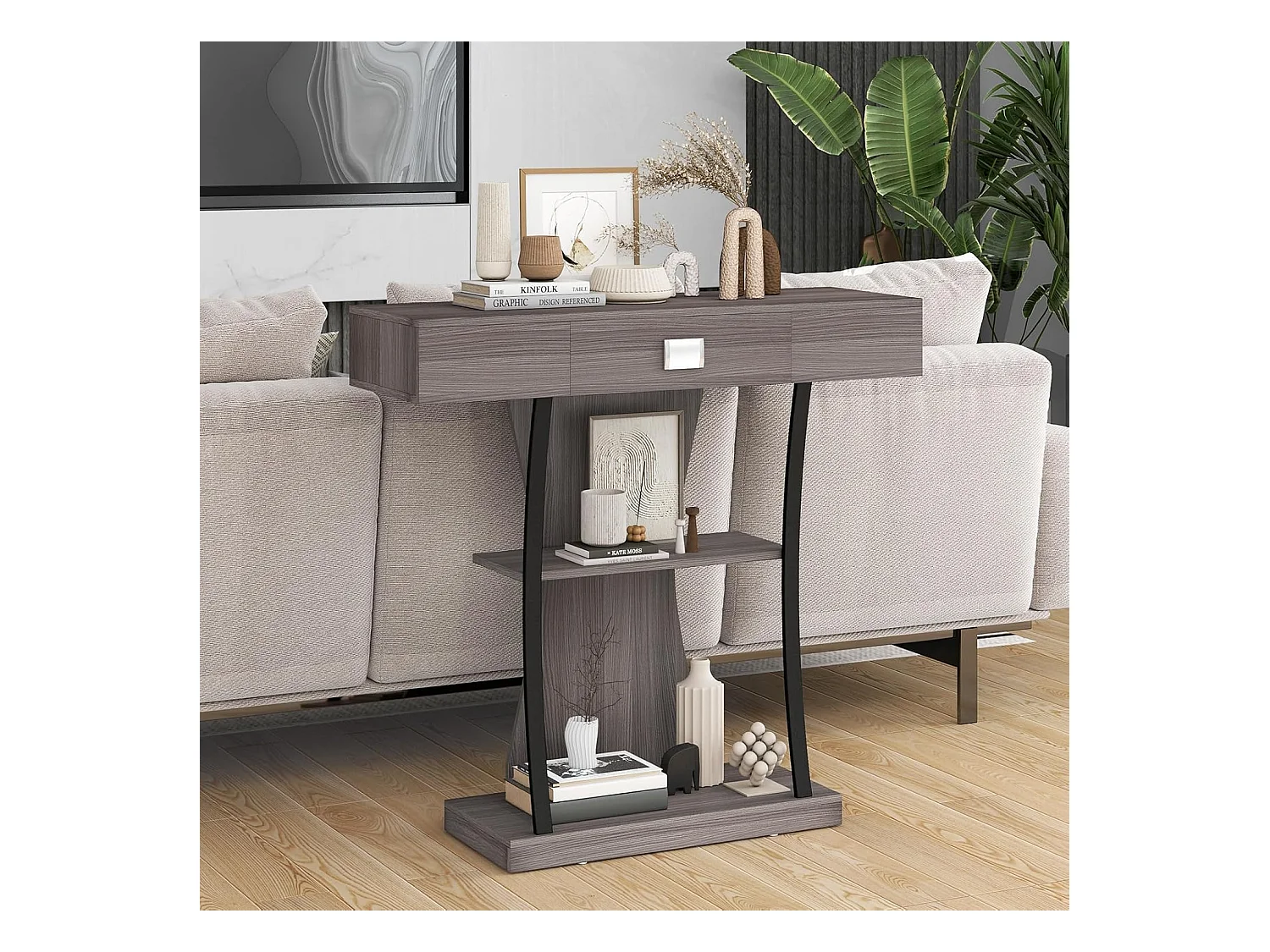 Industriële consoletafel met 3 planken en lade, 91 x 30 x 88 cm (grijs)