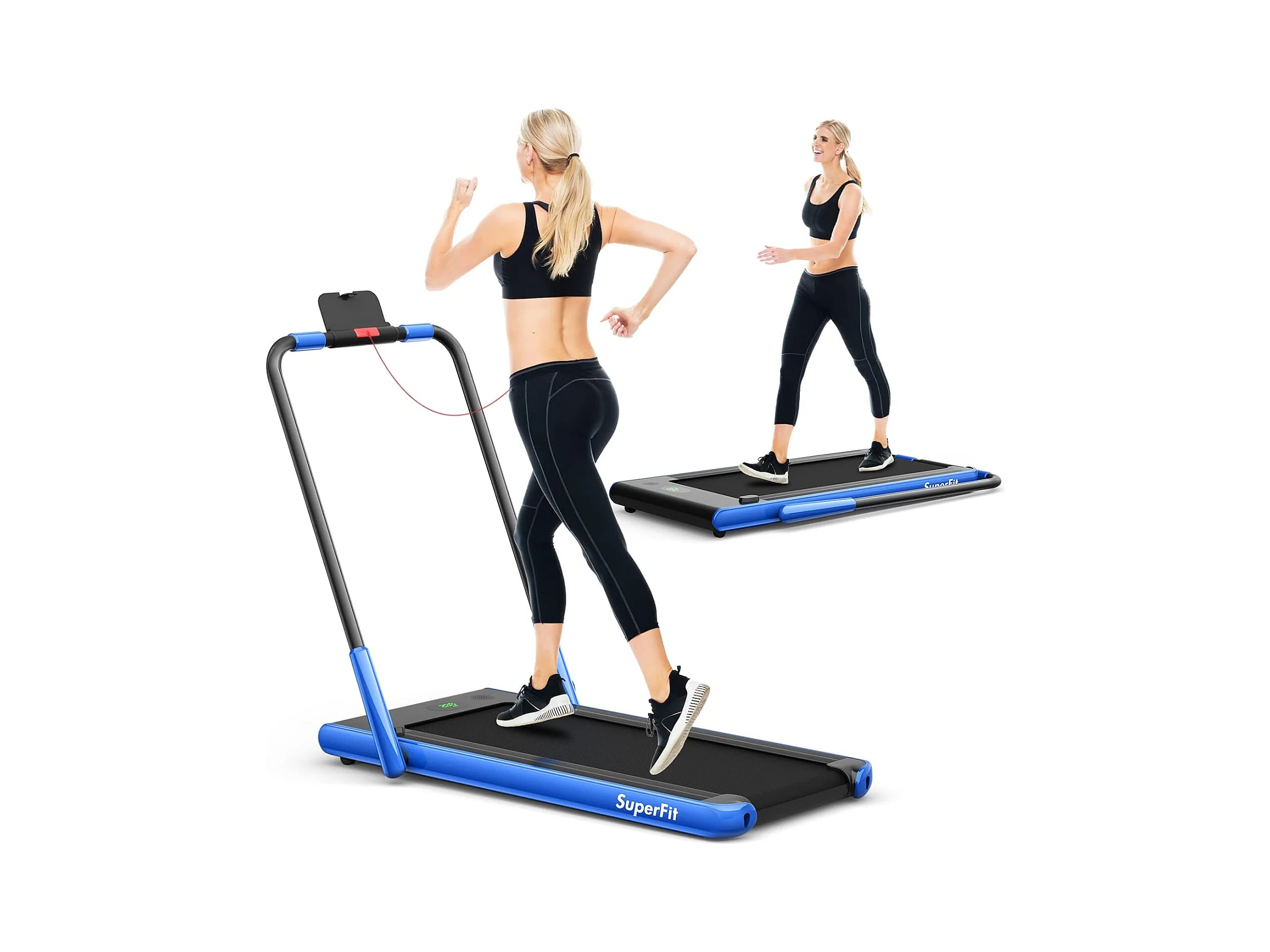 2 in 1 opvouwbare loopband/elektrische gemotoriseerde loopband 1-12 km/u met app, afstandsbediening, led-display, voor thuis en kantoor, blauw