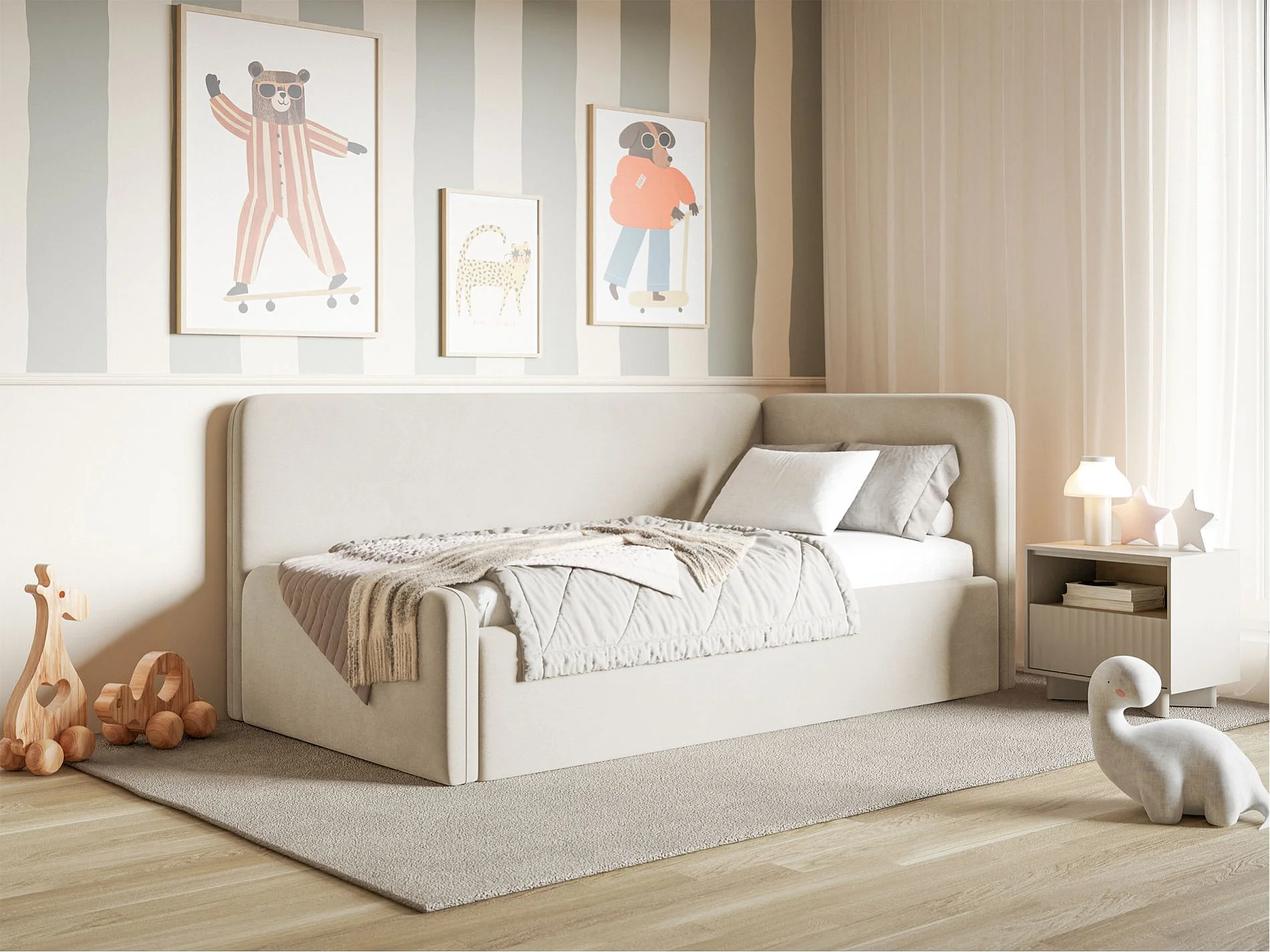 Tienerbed met hoofdbord rechts – matras en opbergruimte – lichtbeige – 90x200 cm – FANKO