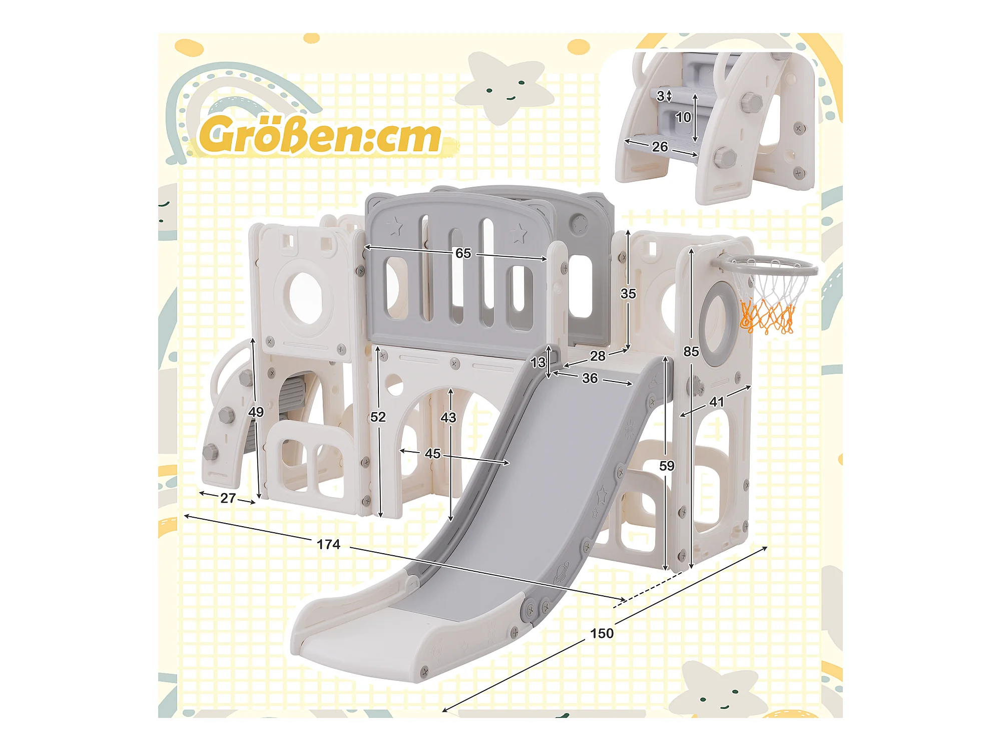 6-in-1 HDPE-glijbaan voor kinderen met platform, trap, 2 opbergruimtes, arcade, basketbalring, grijs