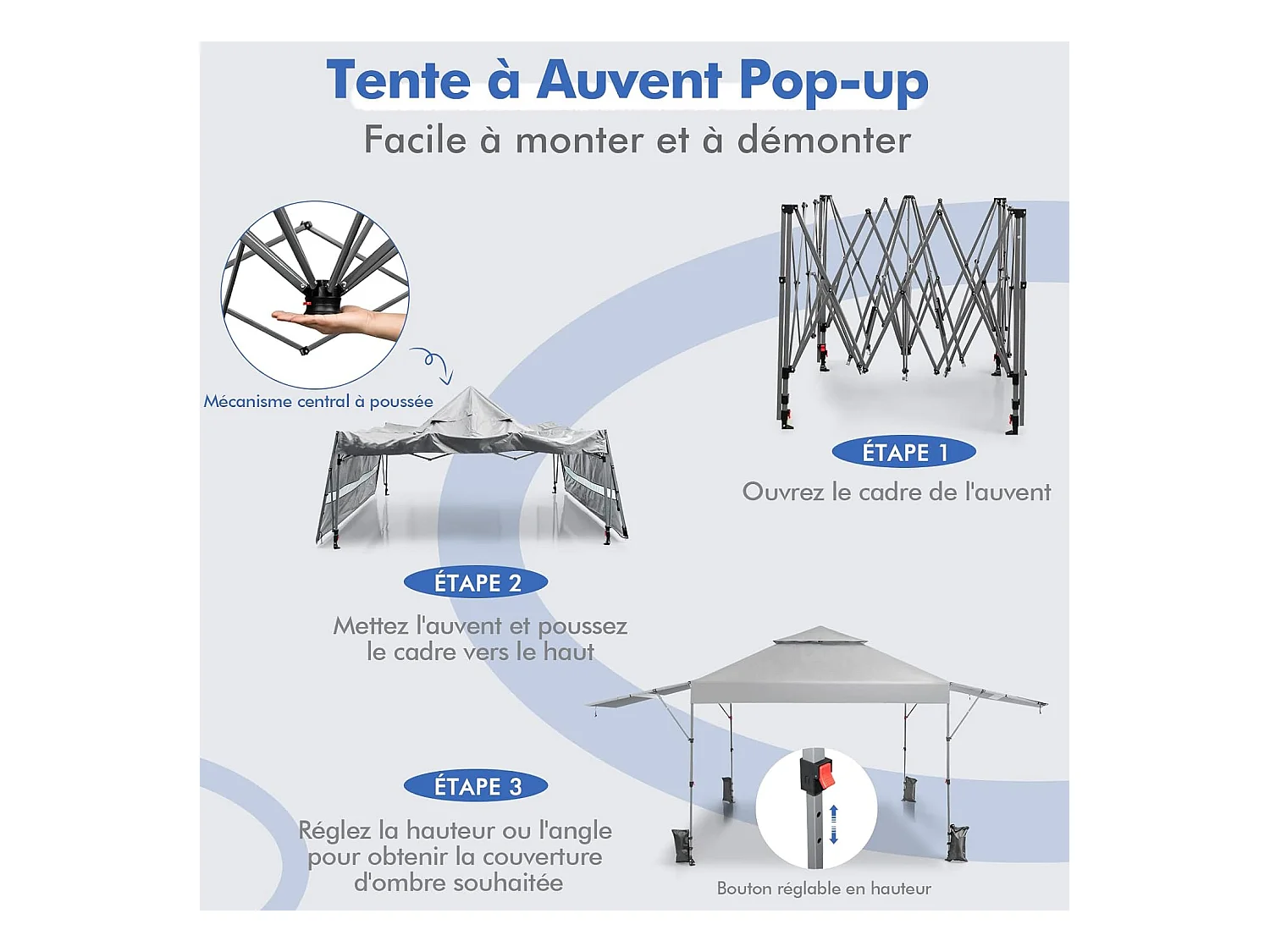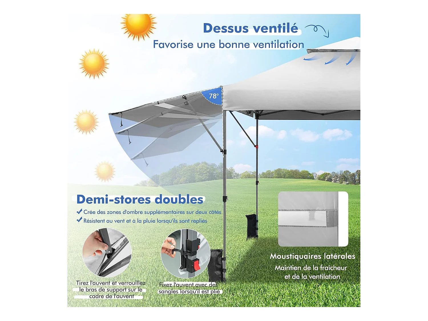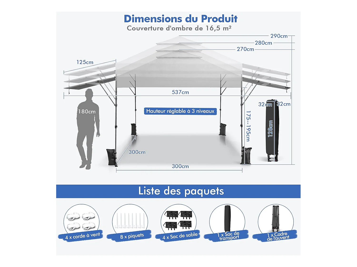 Tonnelle de Jardin Pliable 3x3m avec Double Auvents 1,25x3cm, Tente de Jardin 2 Roulettes Sacs de Sable 3 Hauteurs Réglable pour Marché Patio CamBoisg (Blanc)