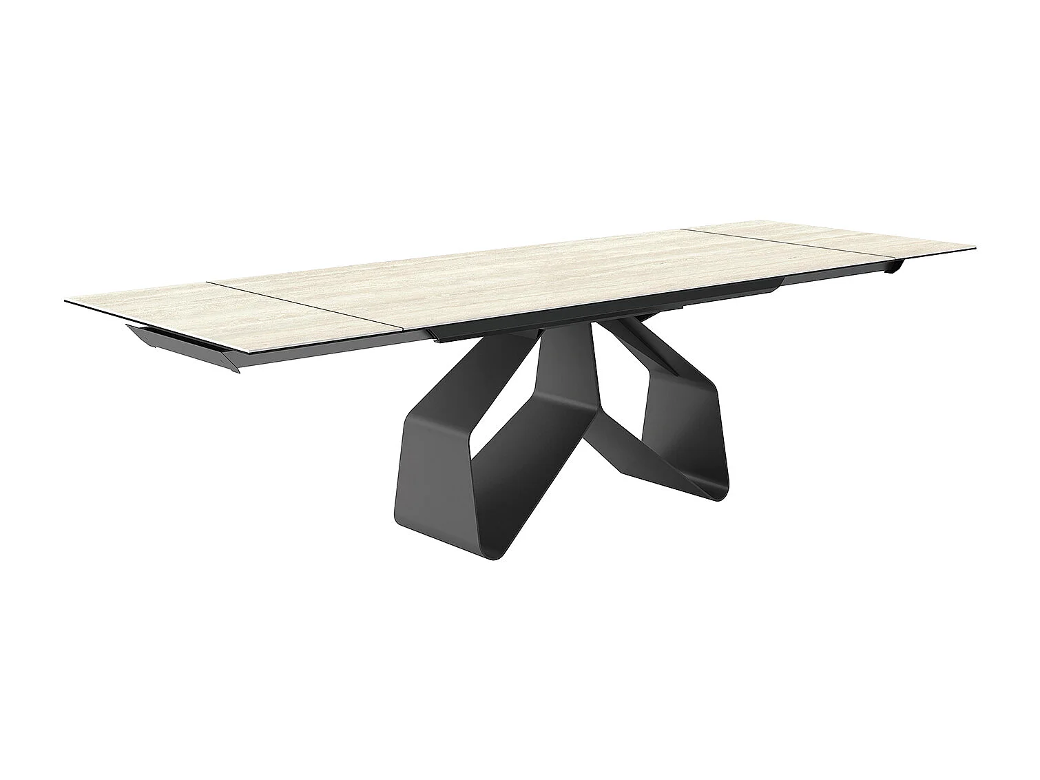 Travertijnlint uitschuifbare tafel - antracietgrijs, rechthoekige regelmatige rand, wit travertijn steengoed