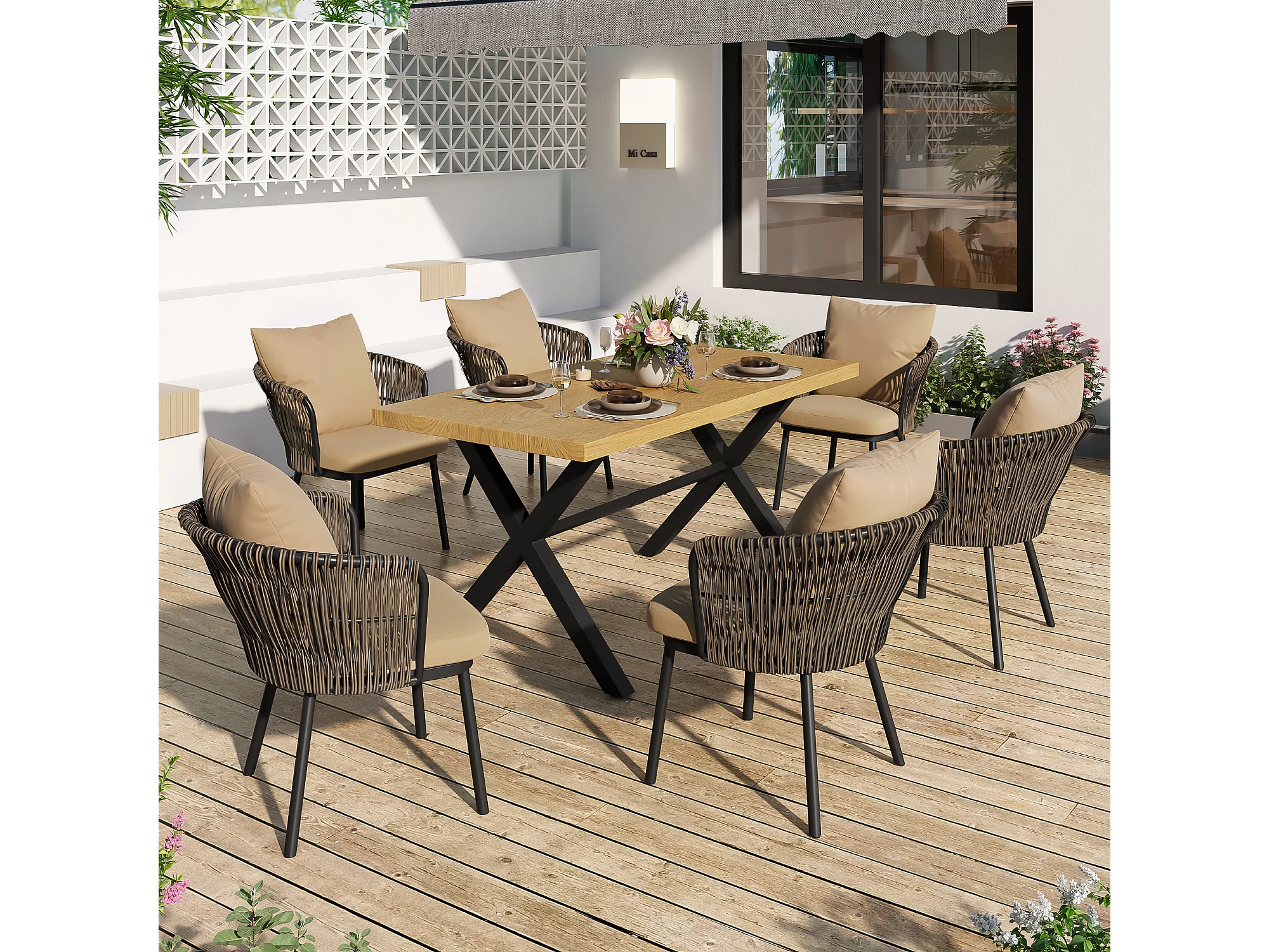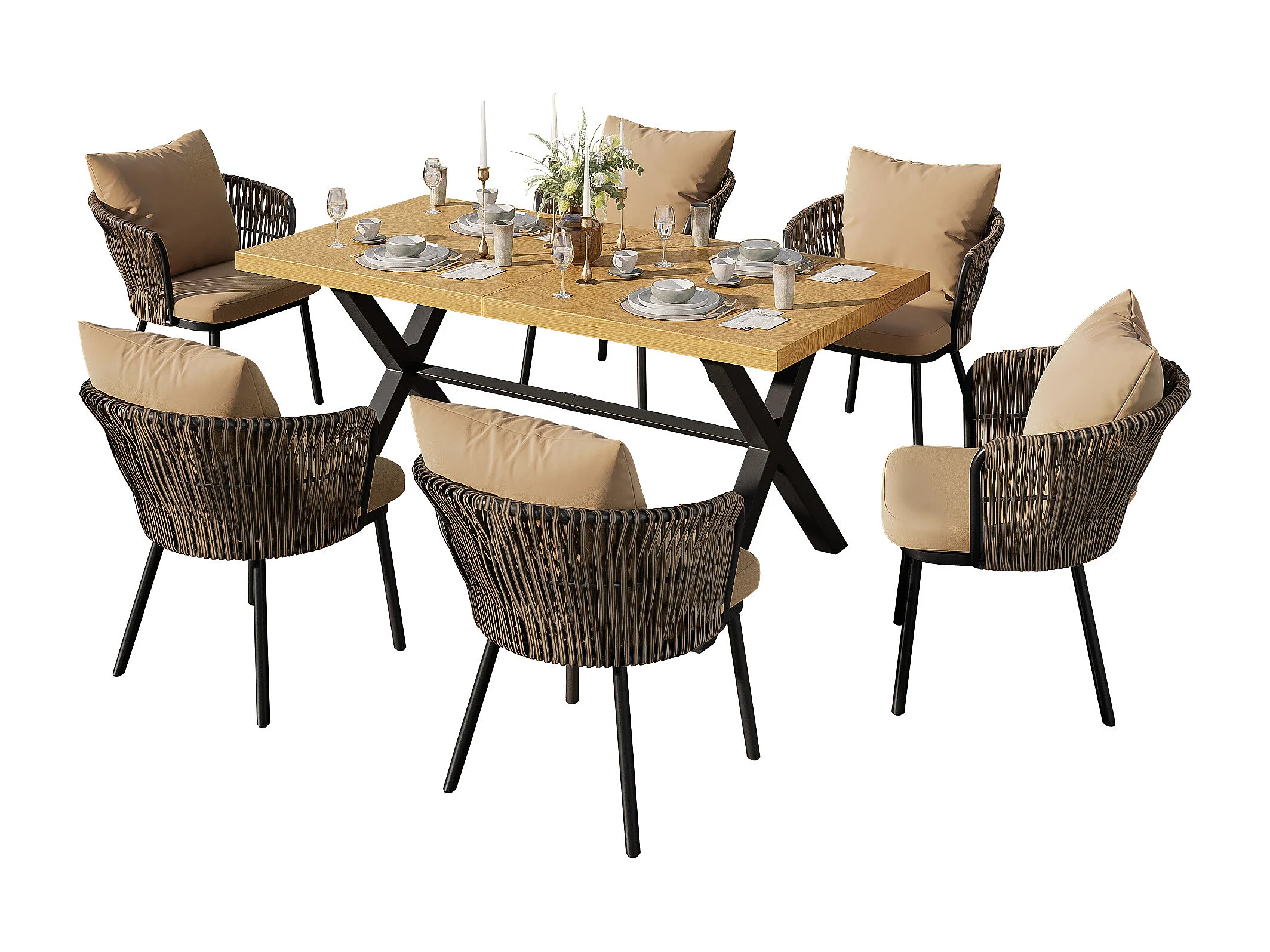 Tuin eetkamer set voor 6 personen, eettafel van ijzer, frame van gegalvaniseerd ijzer, 6 rotan stoelen, Natuur