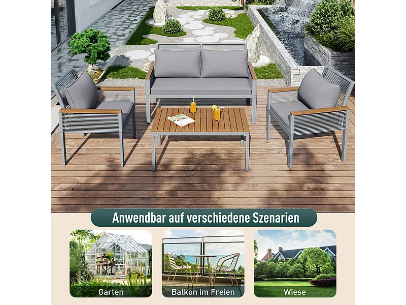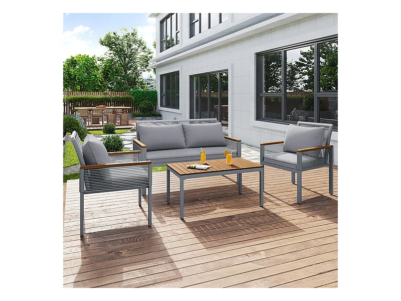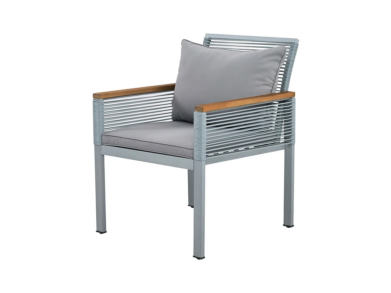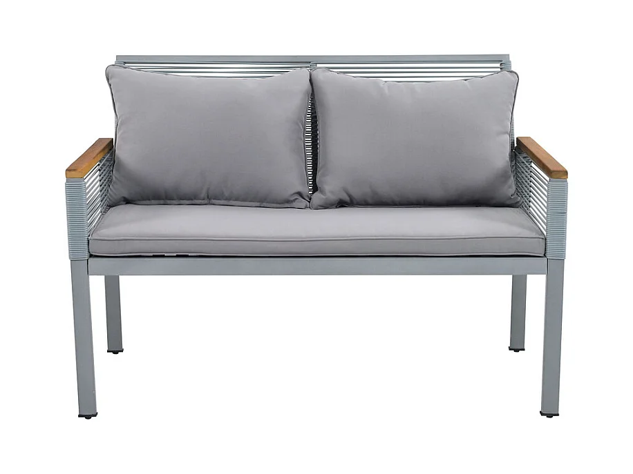 Tuin staal set: Bijzettafel + 2 fauteuils en 2-zits bank, met kussens, Grijs