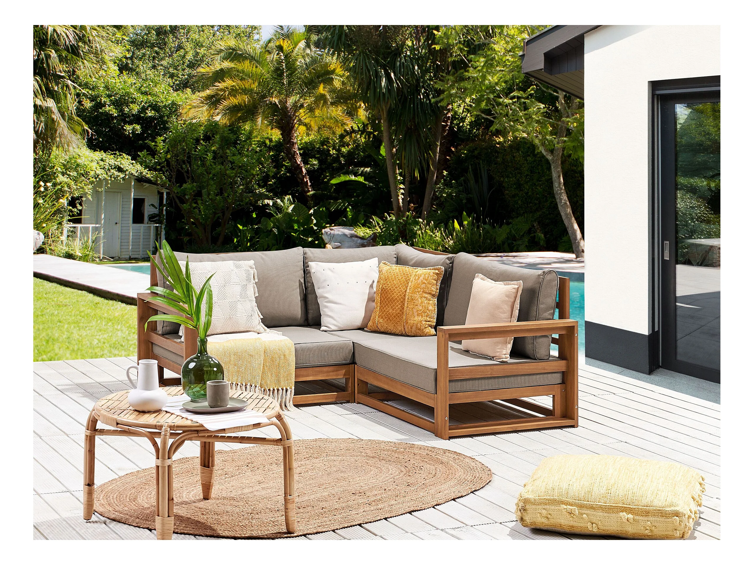 Hoekbank sectioneel met taupe kussens massief acaciahout