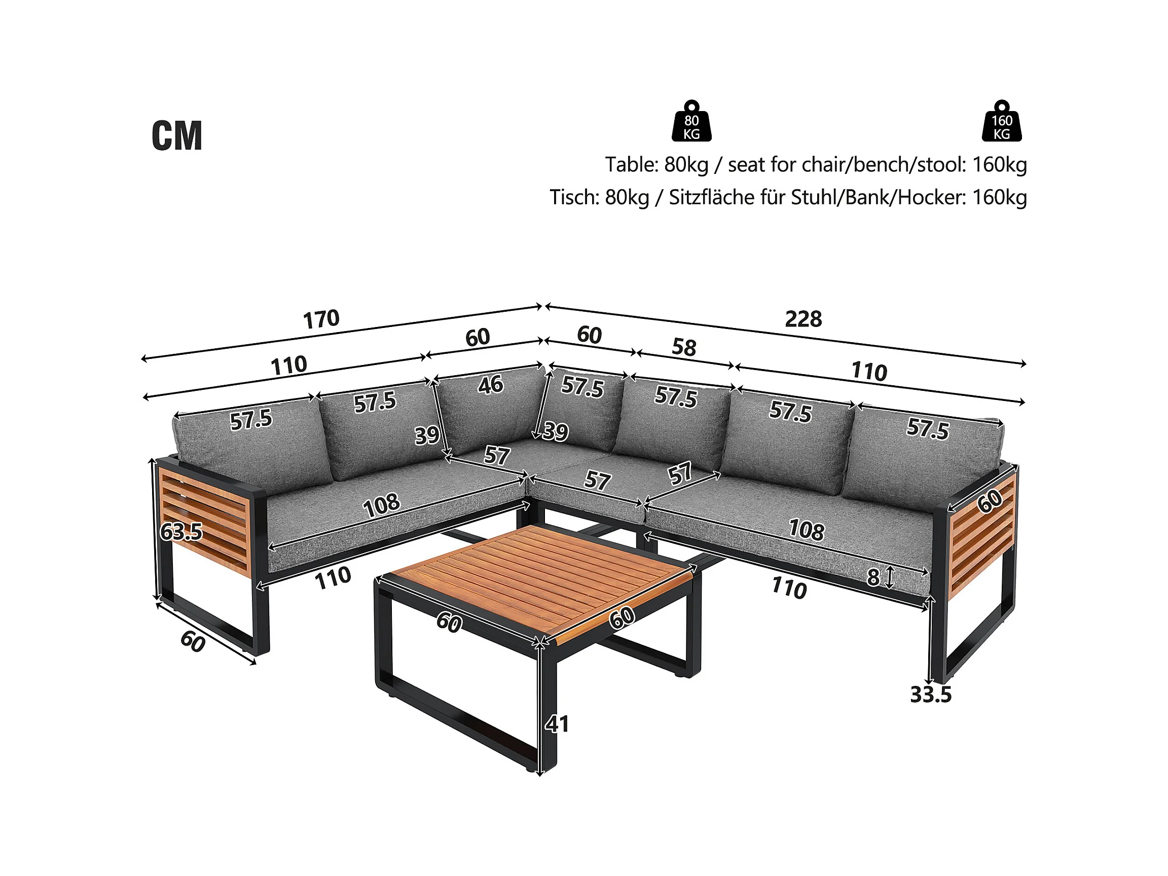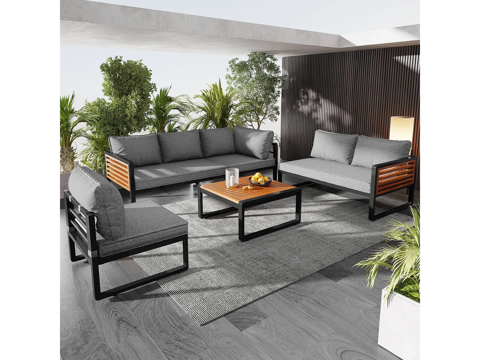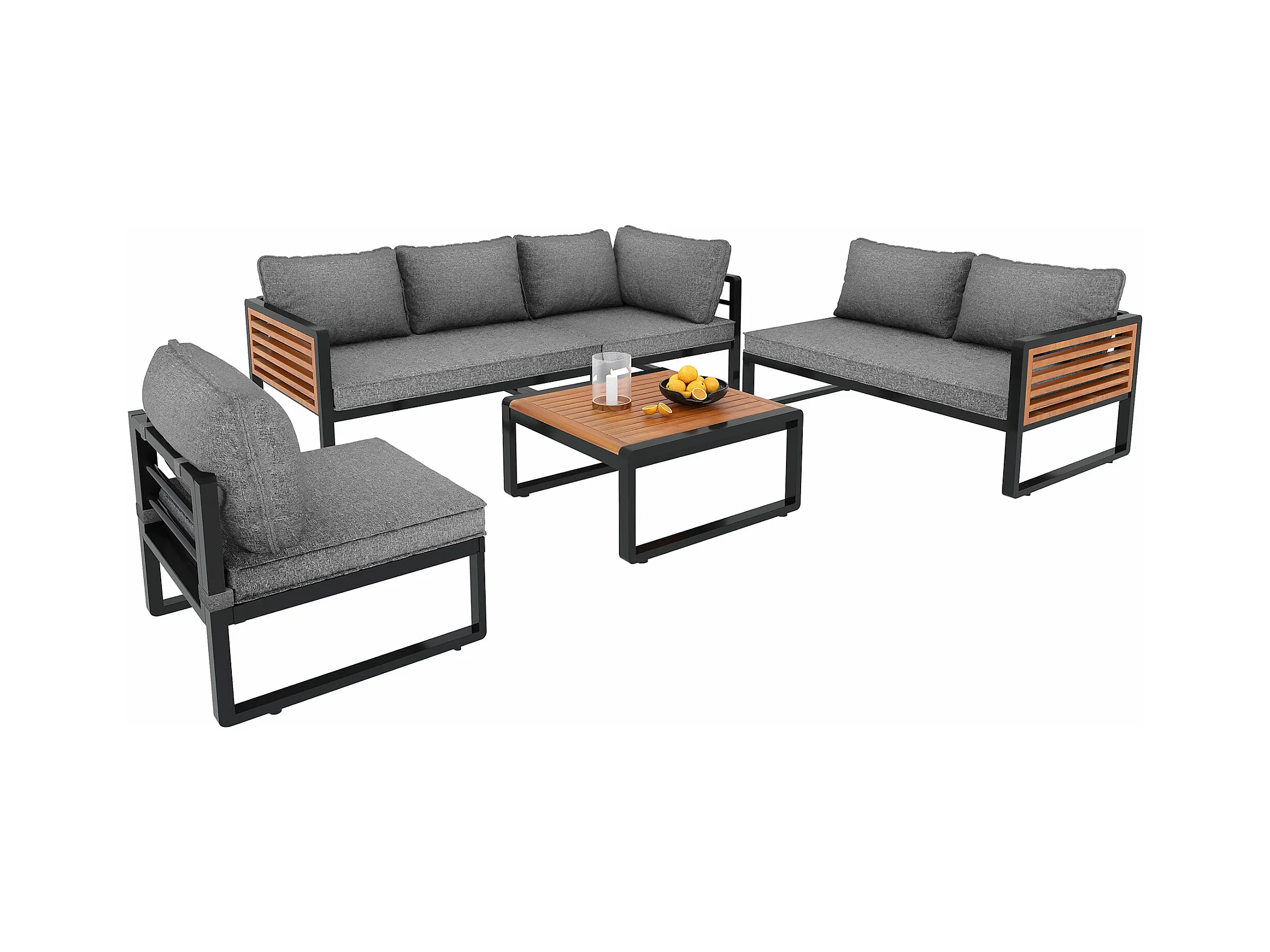 Tuinbank voor 5-6 personen met gegalvaniseerd ijzeren frame, decoratieve houten armleuningen, loungemeubels, grijs
