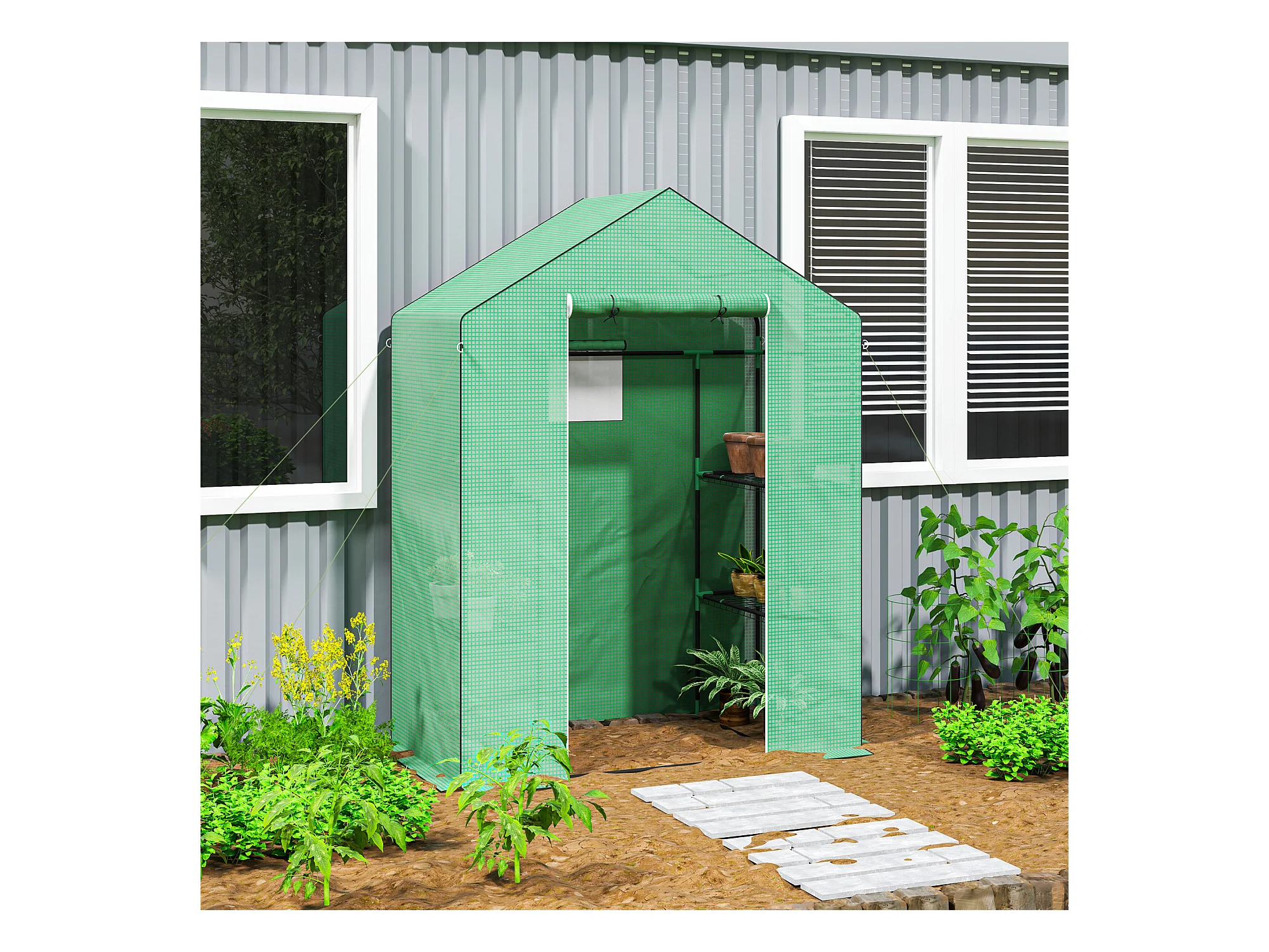 Tuinkas met roldeur, ramen en planken, kunststof winterkas, metalen frame, voor balkon en tuin (143x74x190 cm)