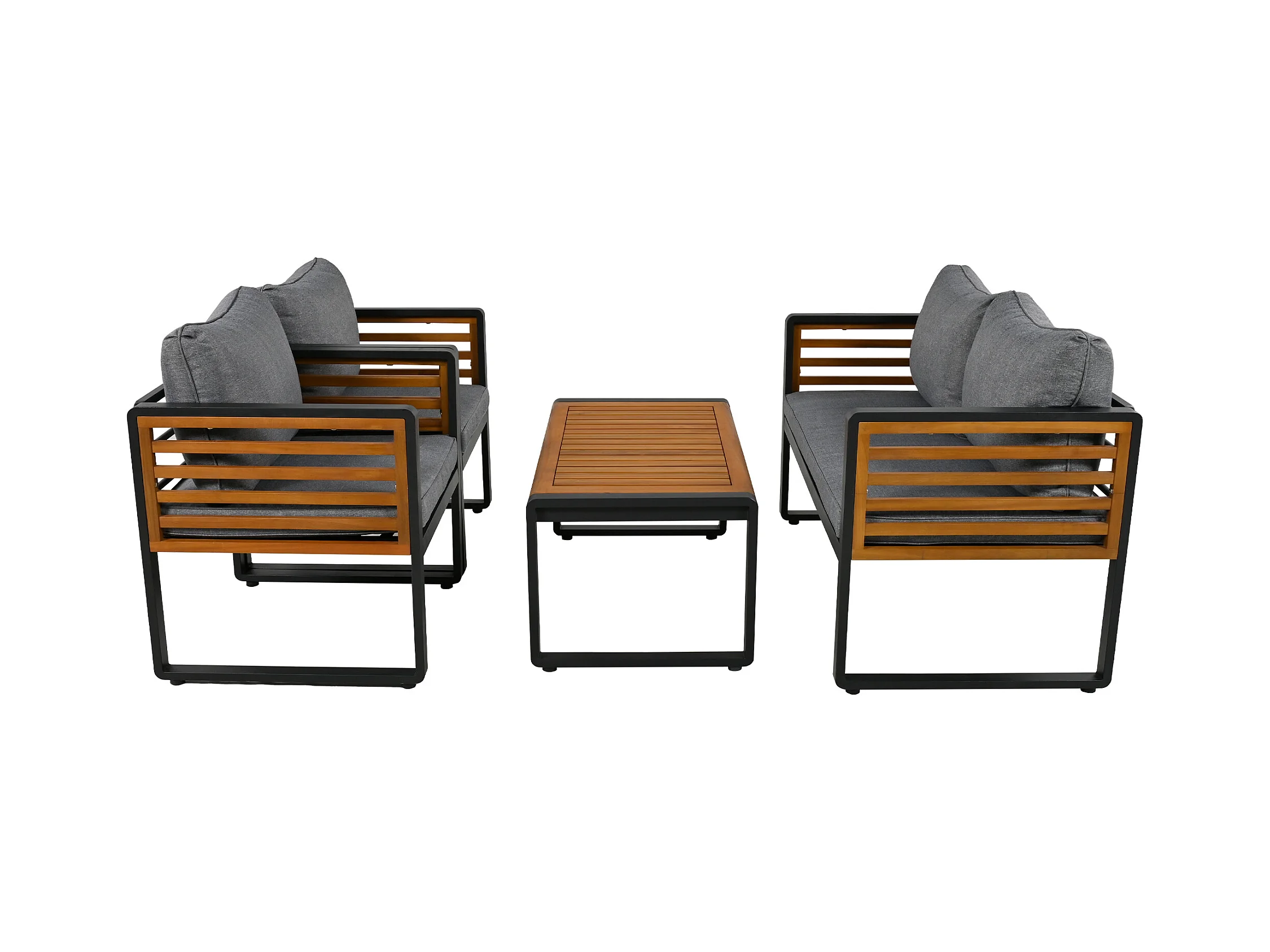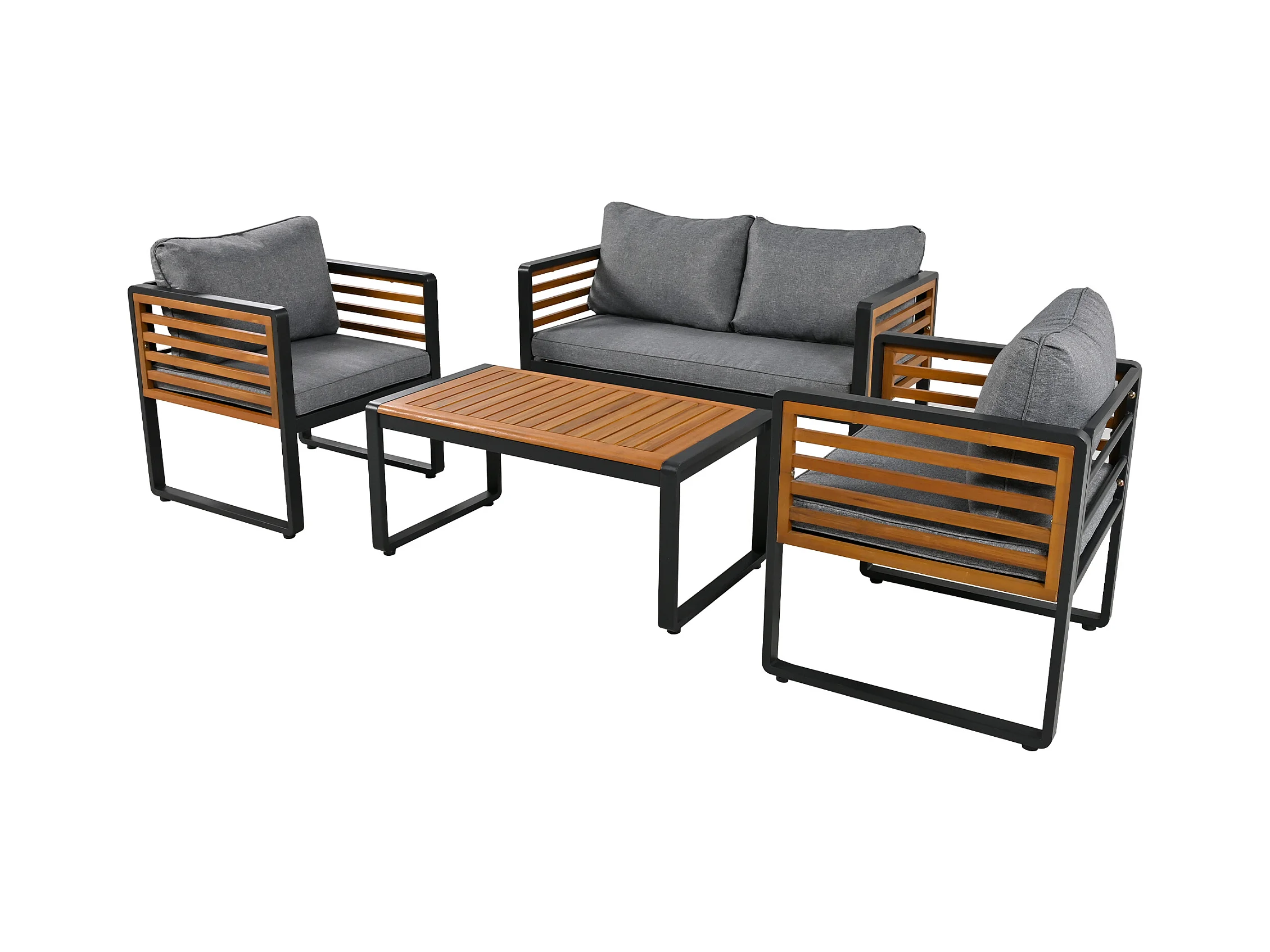 Tuinmeubelset - 2-zitsbank + 2 fauteuils + rechthoekige salontafel - zit- en rugkussens - ijzer en hout - bruin en grijs