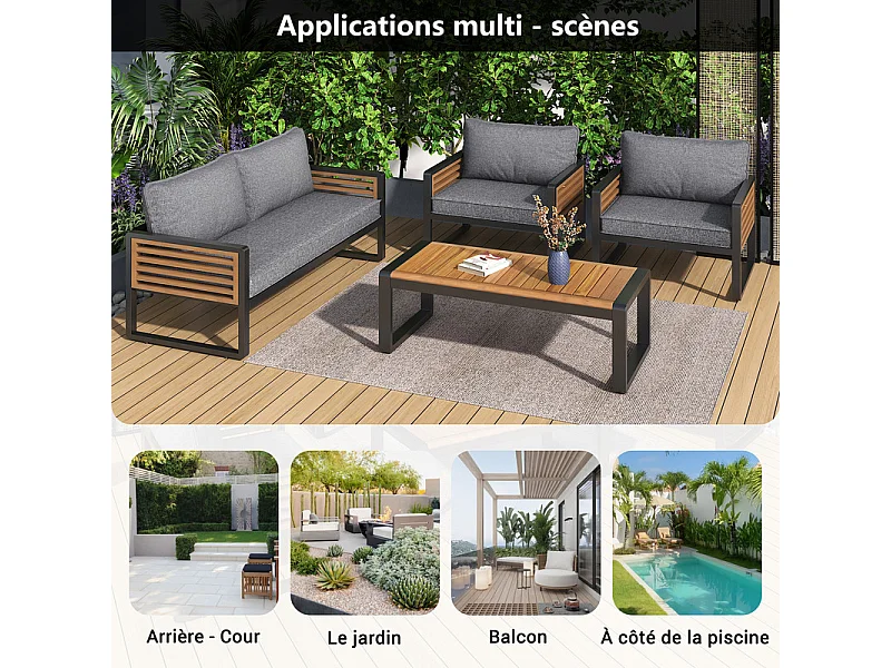 Tuinmeubelset - voor 8 personen - 2 salontafels, 2 banken en 4 fauteuils - houten armleuningen - Grijs