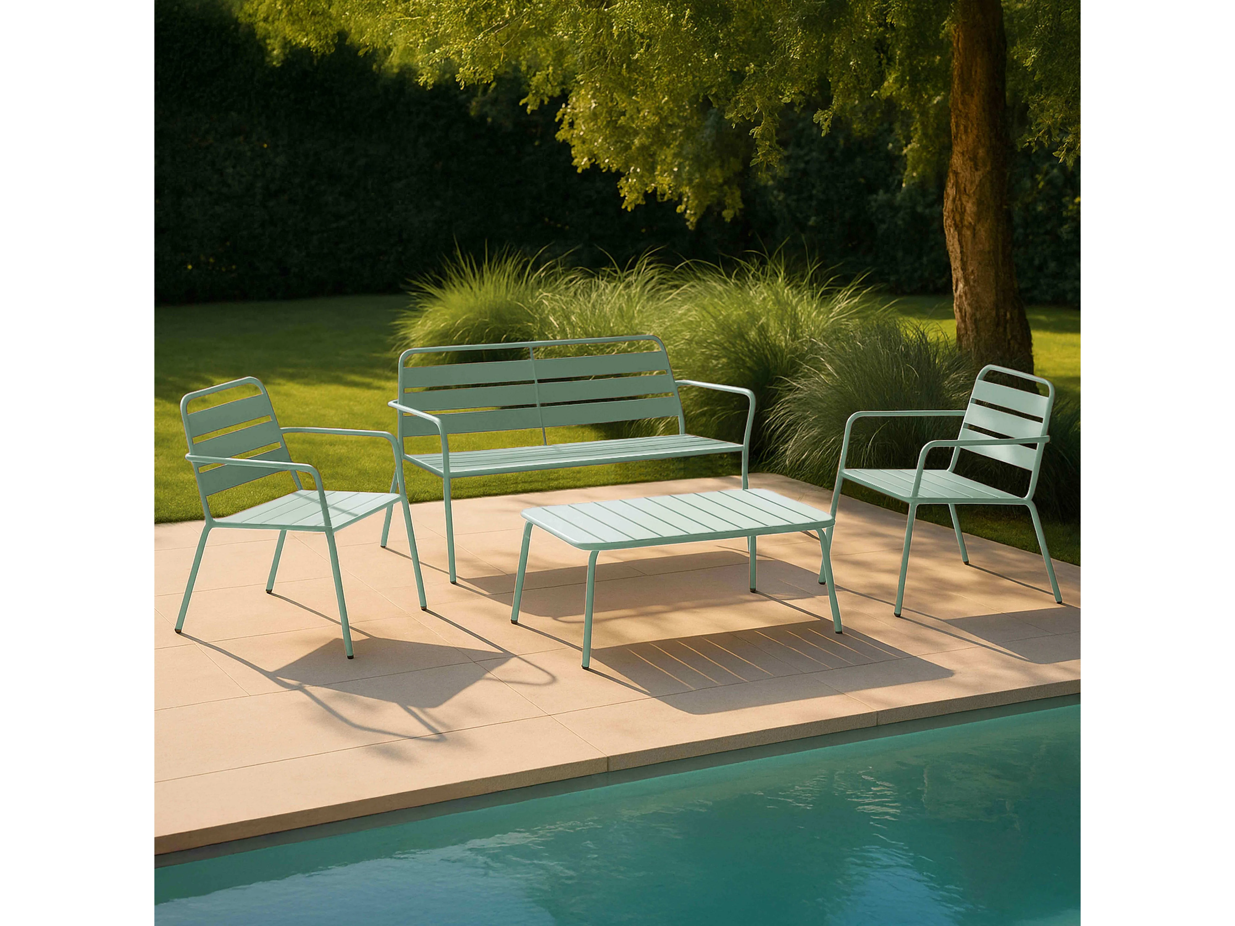 Tuinset met 4 stoelen en 1 salontafel van groen salie staal