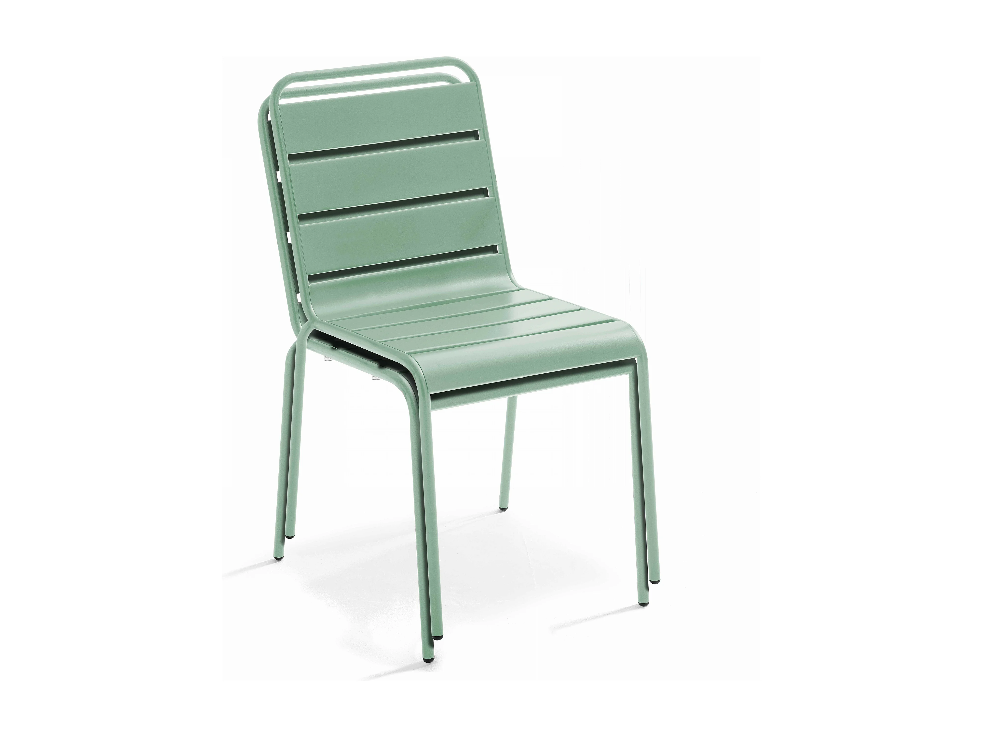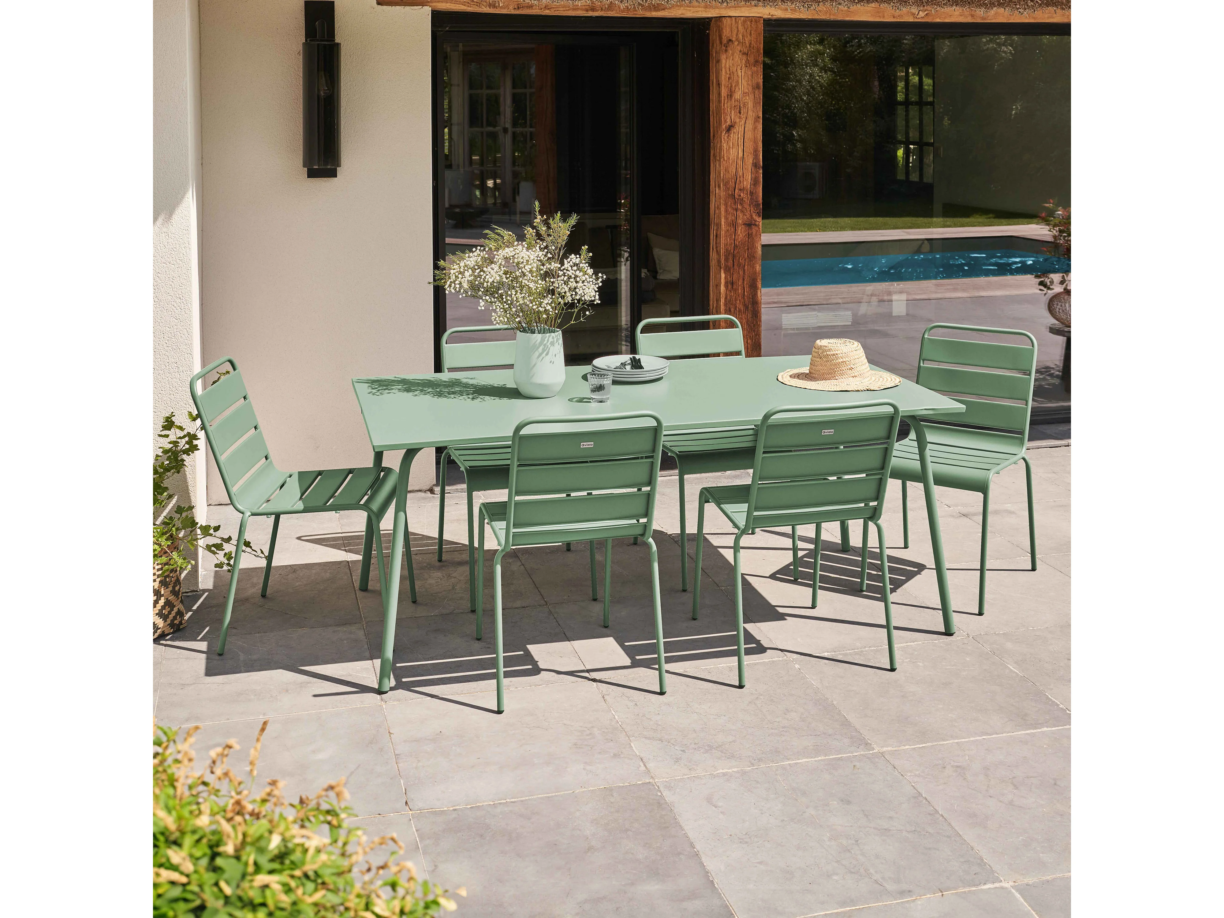 Tuinset met tafel en 6 groene salie stoelen