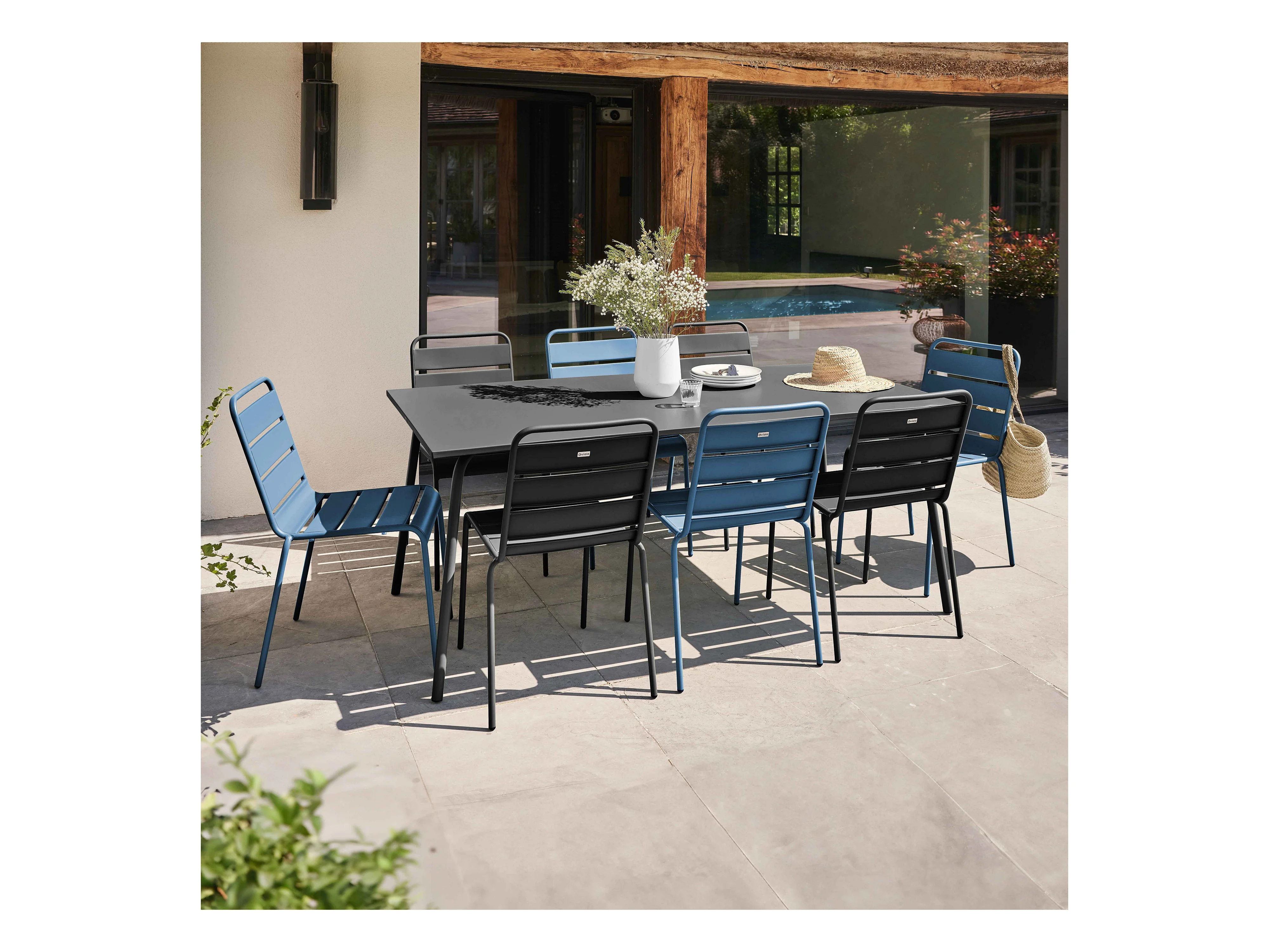 Tuinset met tafel en 8 stoelen in grijs metaal en Pacific blauw