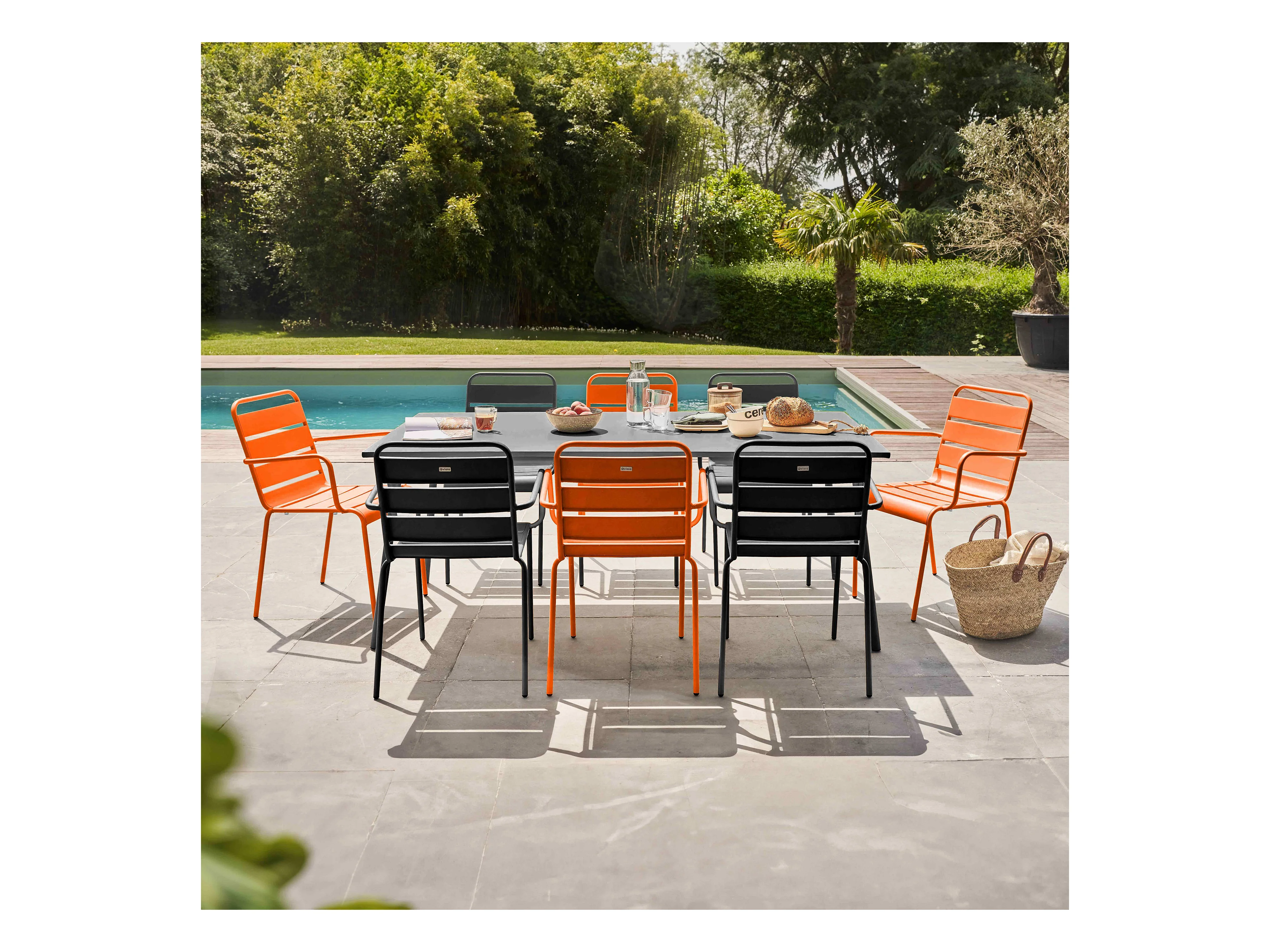 Set van een vierkante tuin tafel en 8 oranje stoelen