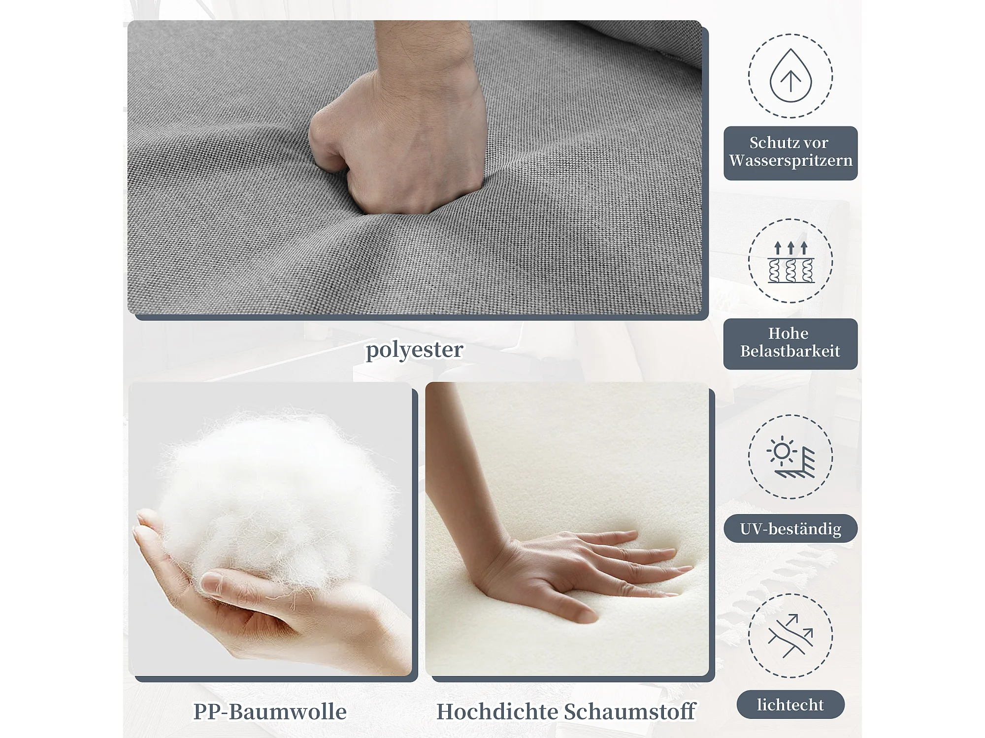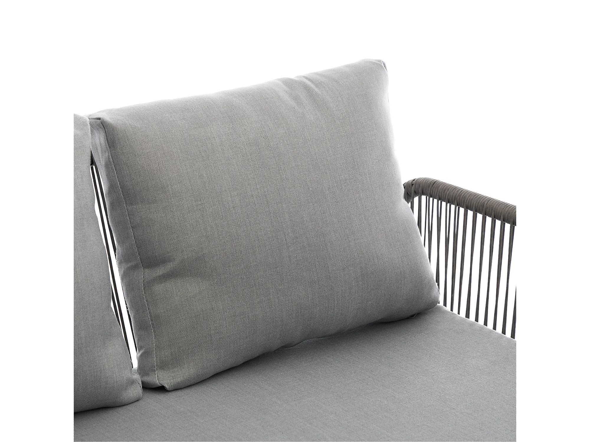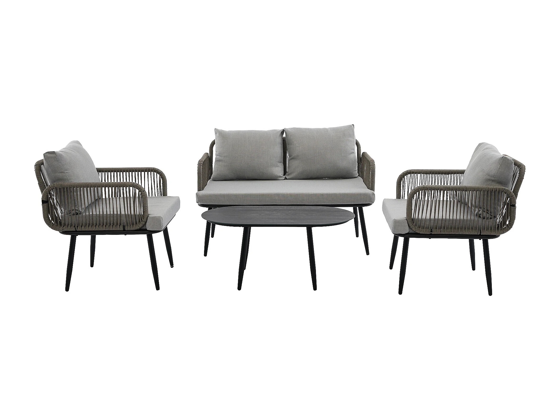 Tuinstoelset met comfortabele kussens, bestaande uit een tweezitsbank, twee fauteuils en een salontafel, grijs