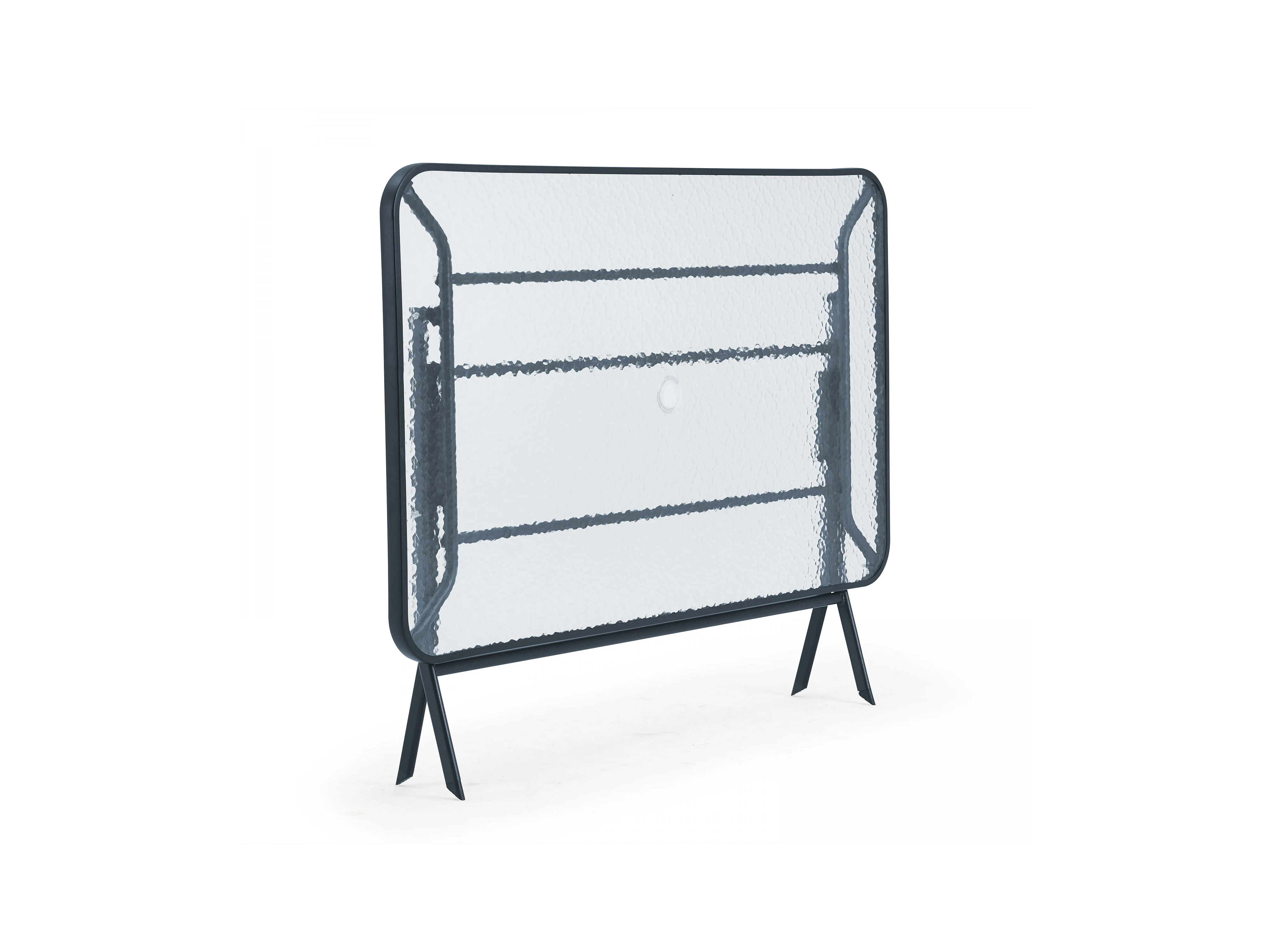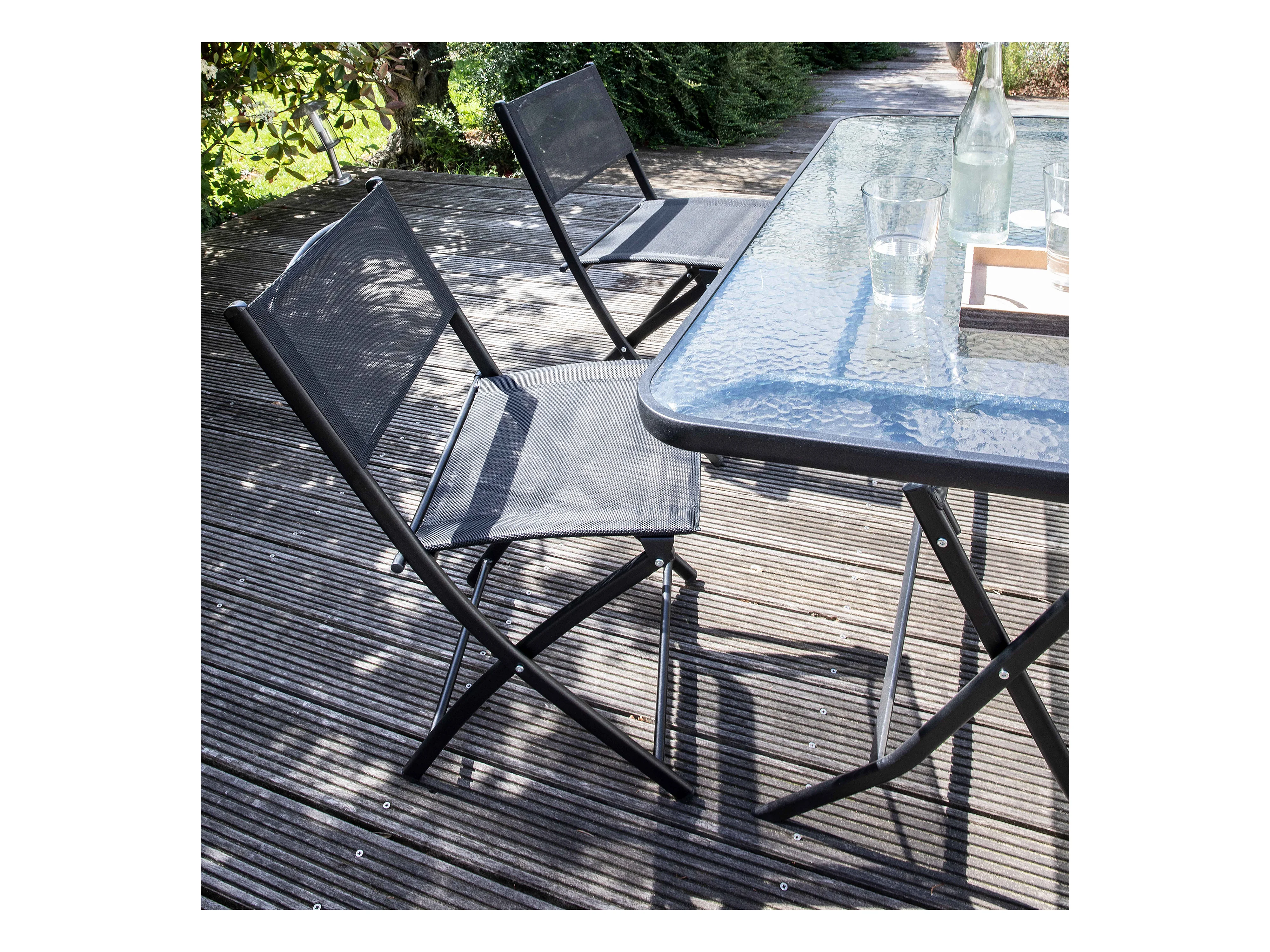 Tuintafel en 4 inklapbare stoelen van staal en zwart glas