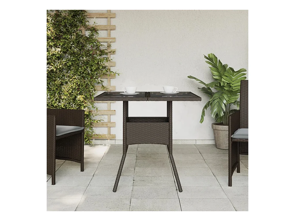 Tuintafel met glazen blad 80x80x75 cm poly rattan bruin