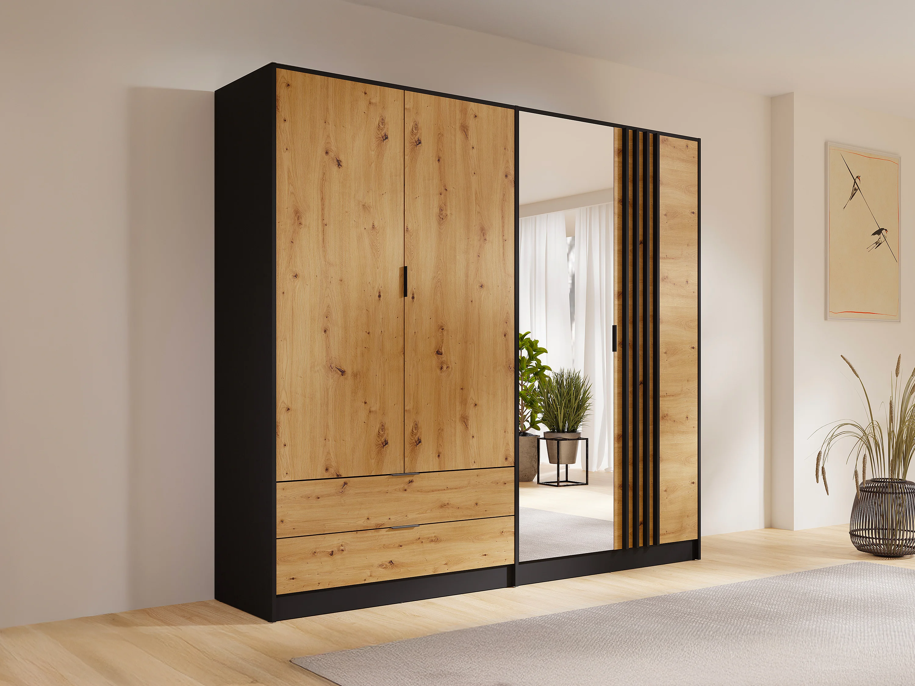Kast met 4 deuren en 2 lades - Met spiegel - L220 cm - Kleur: zwart en naturel - TUNALO
