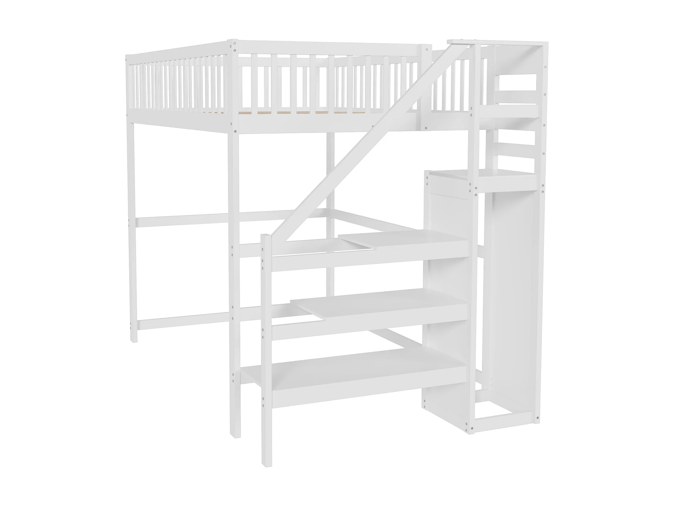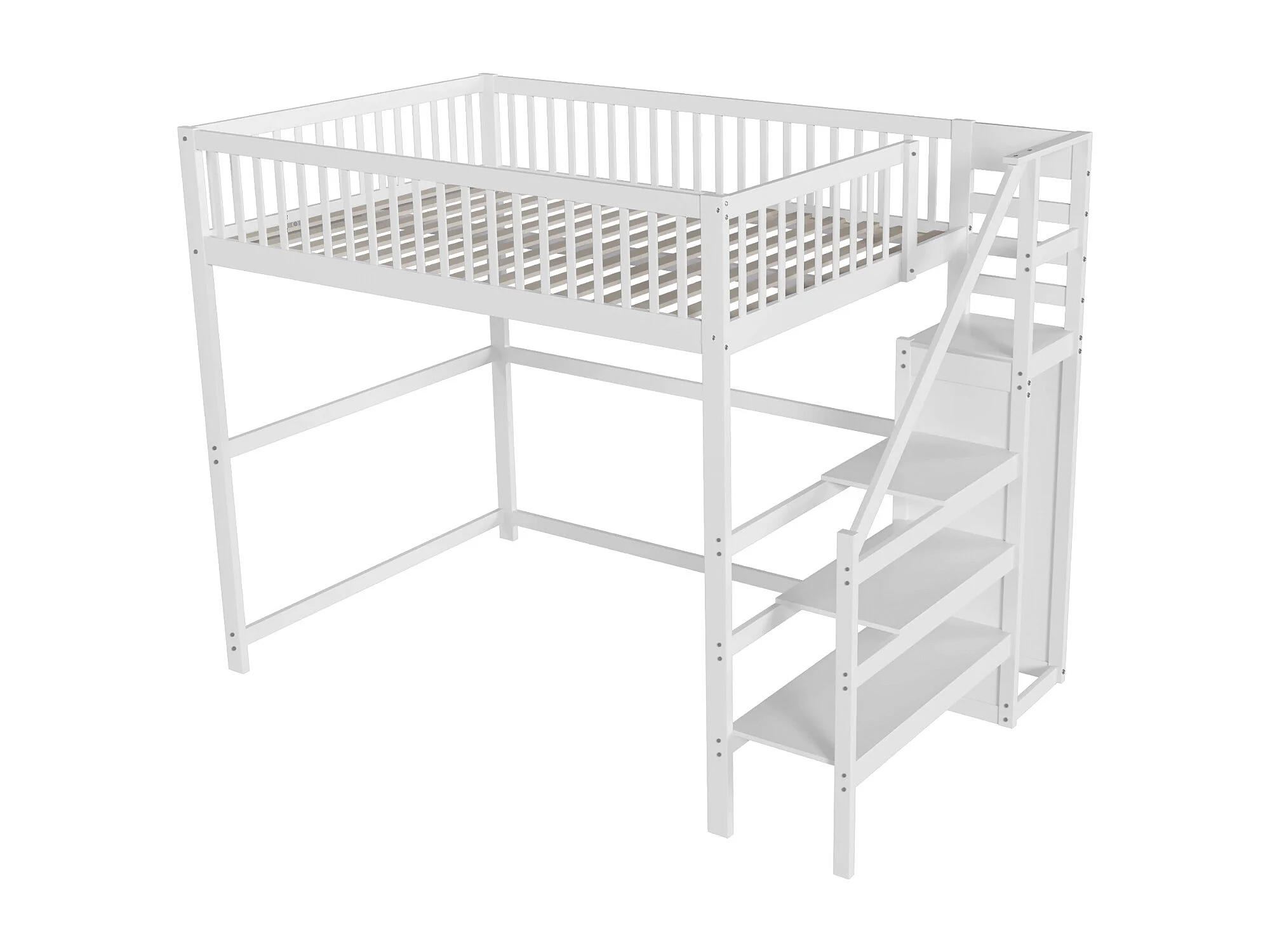 Tussenbed 140x200 met trap, wit houten kinderbed met opbergplank, eenvoudige kledingkast