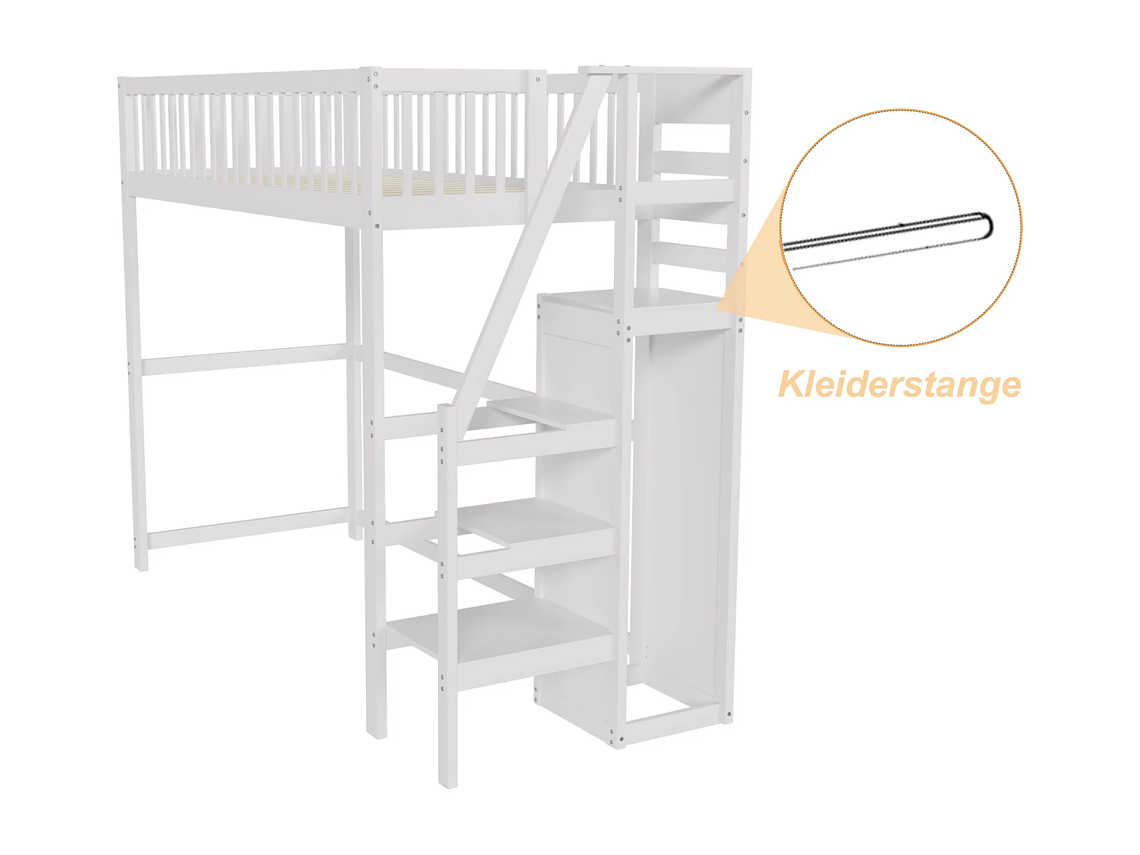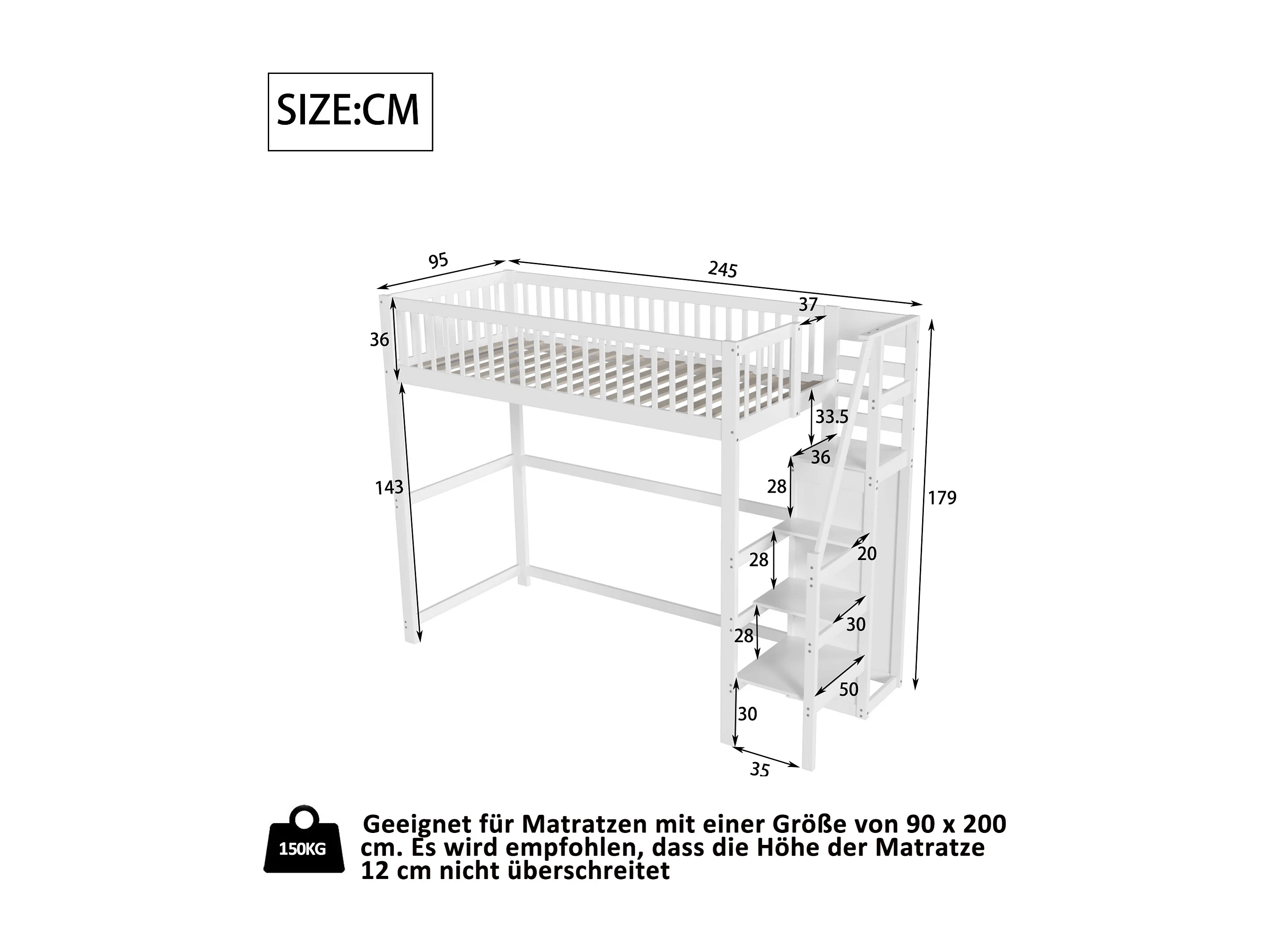 Tussenbed 90x200 met trap, wit houten kinderbed met opbergplank, eenvoudige kledingkast