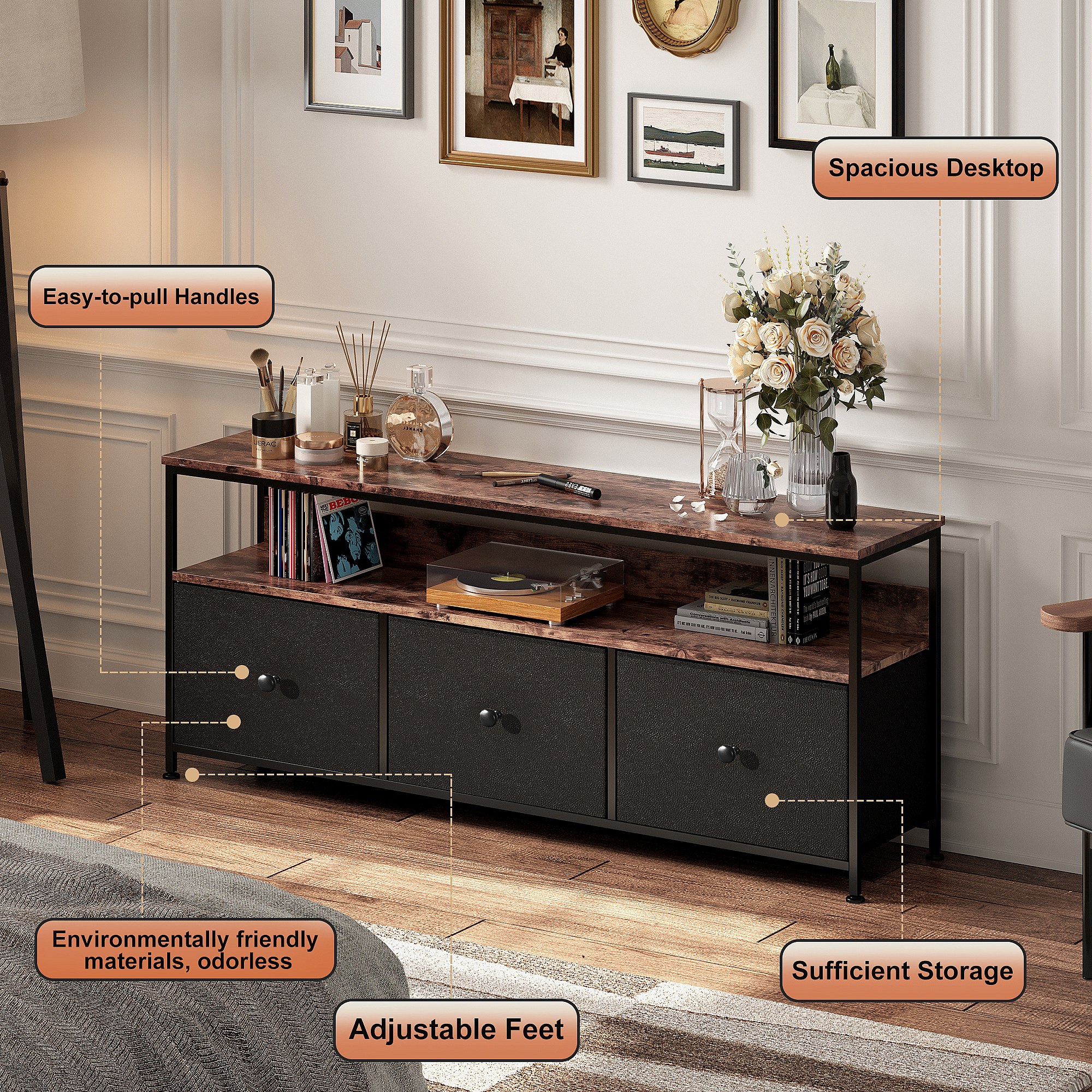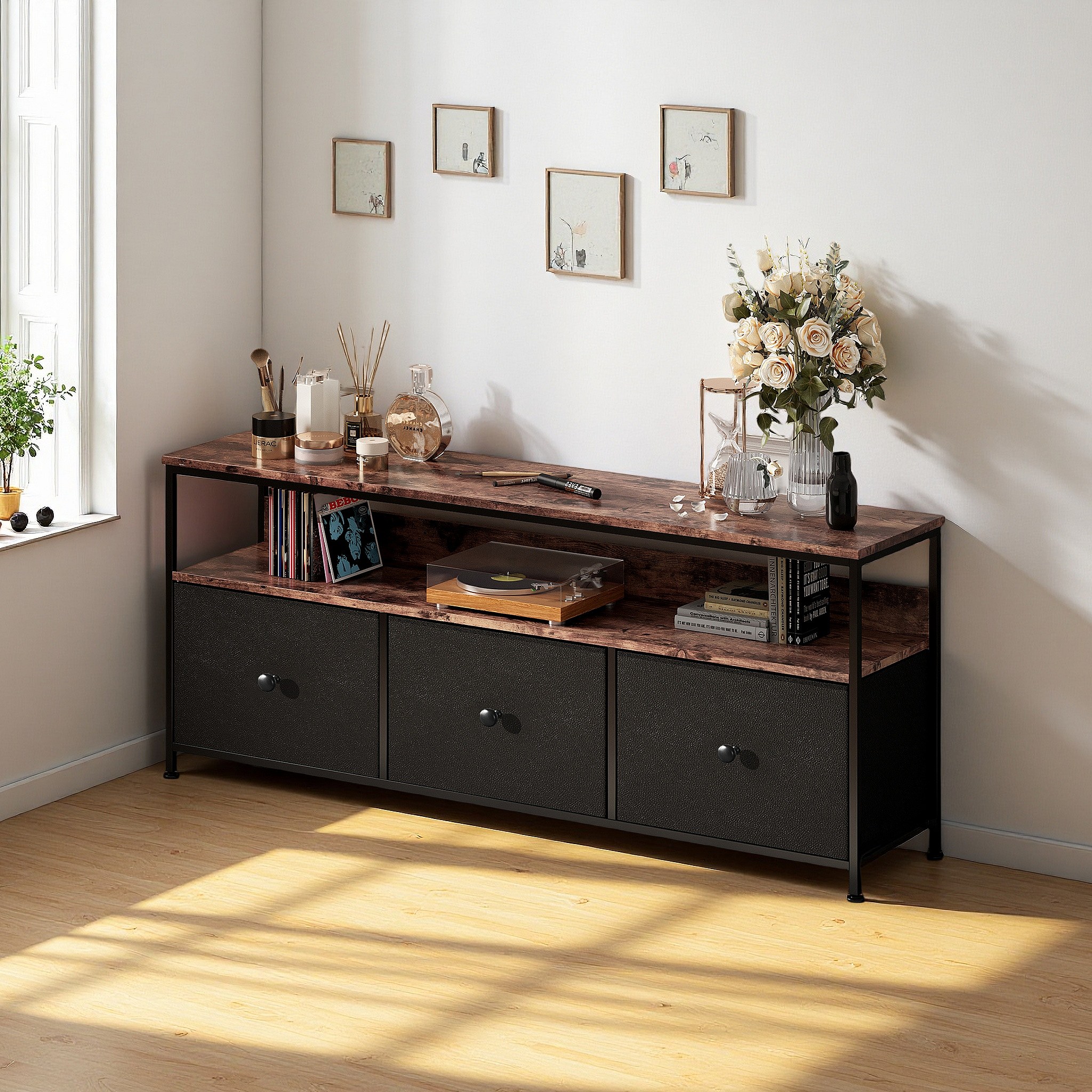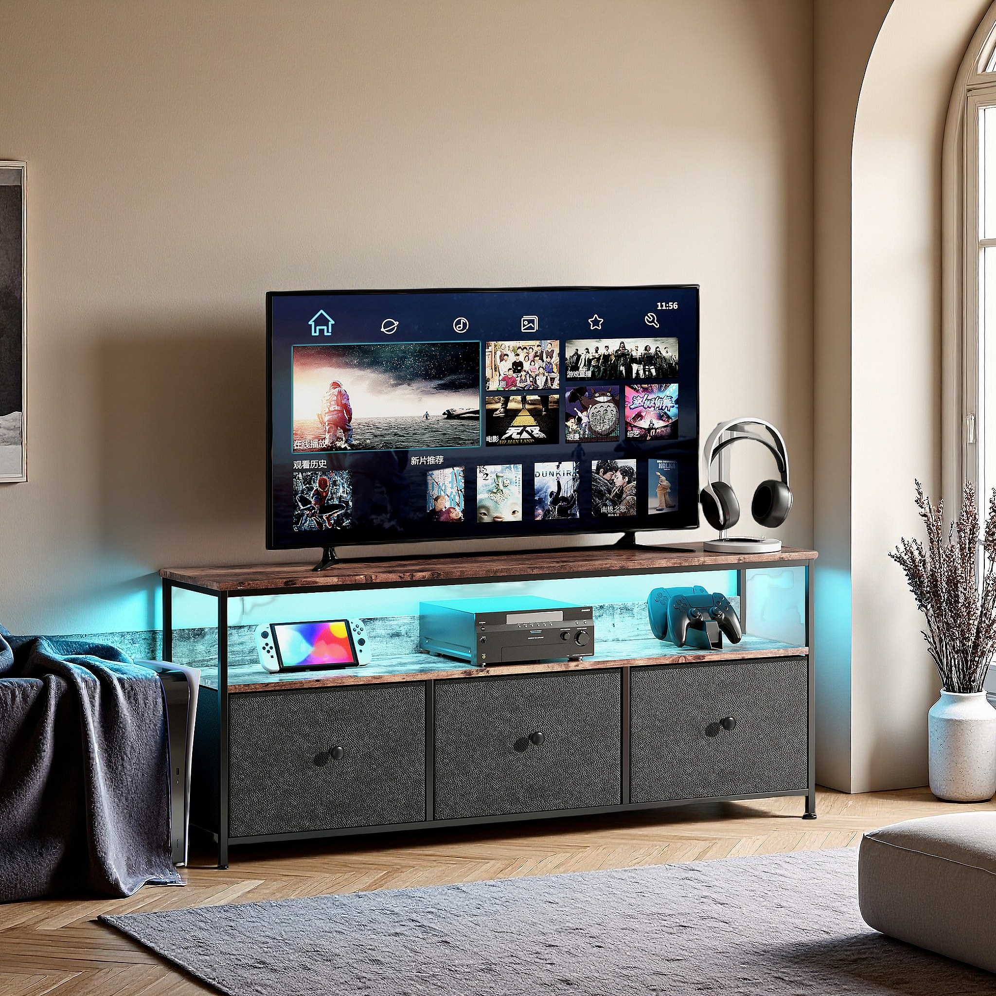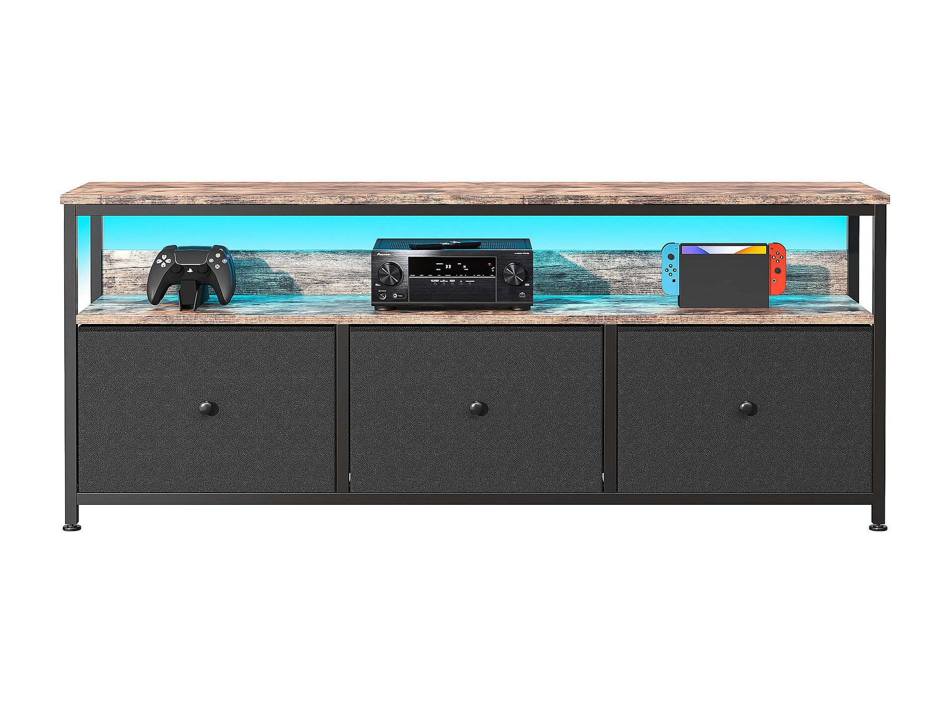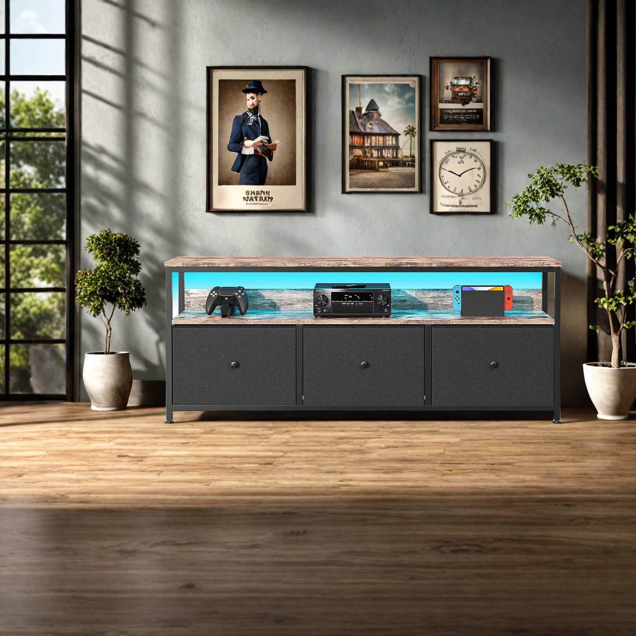 TV-meubel 137 cm met LED, tijgerhoutlook bovenkant, 3 zwarte PU-stoffen lades, stevig metalen frame, verstelbare poten, retro-moderne stijl