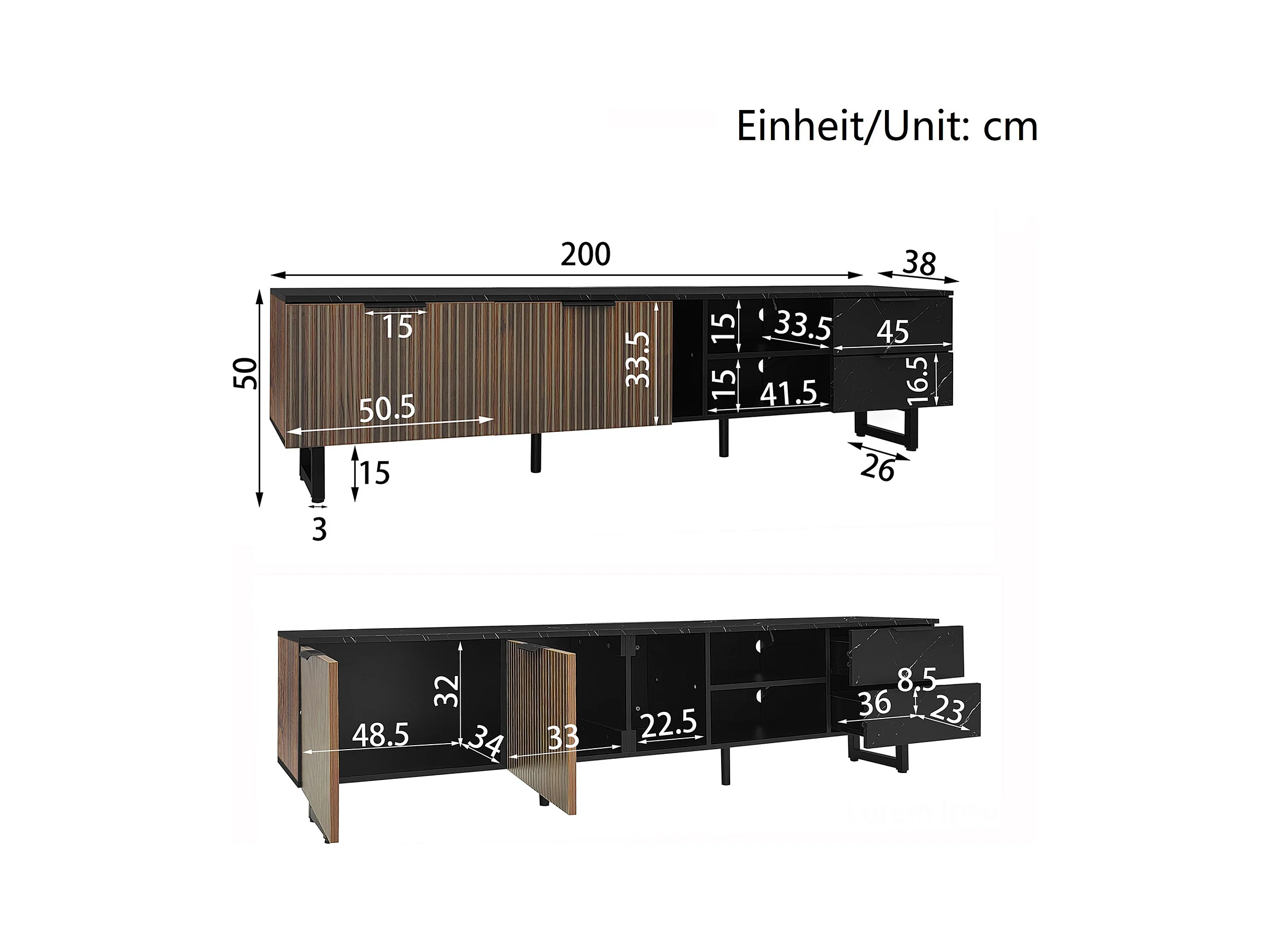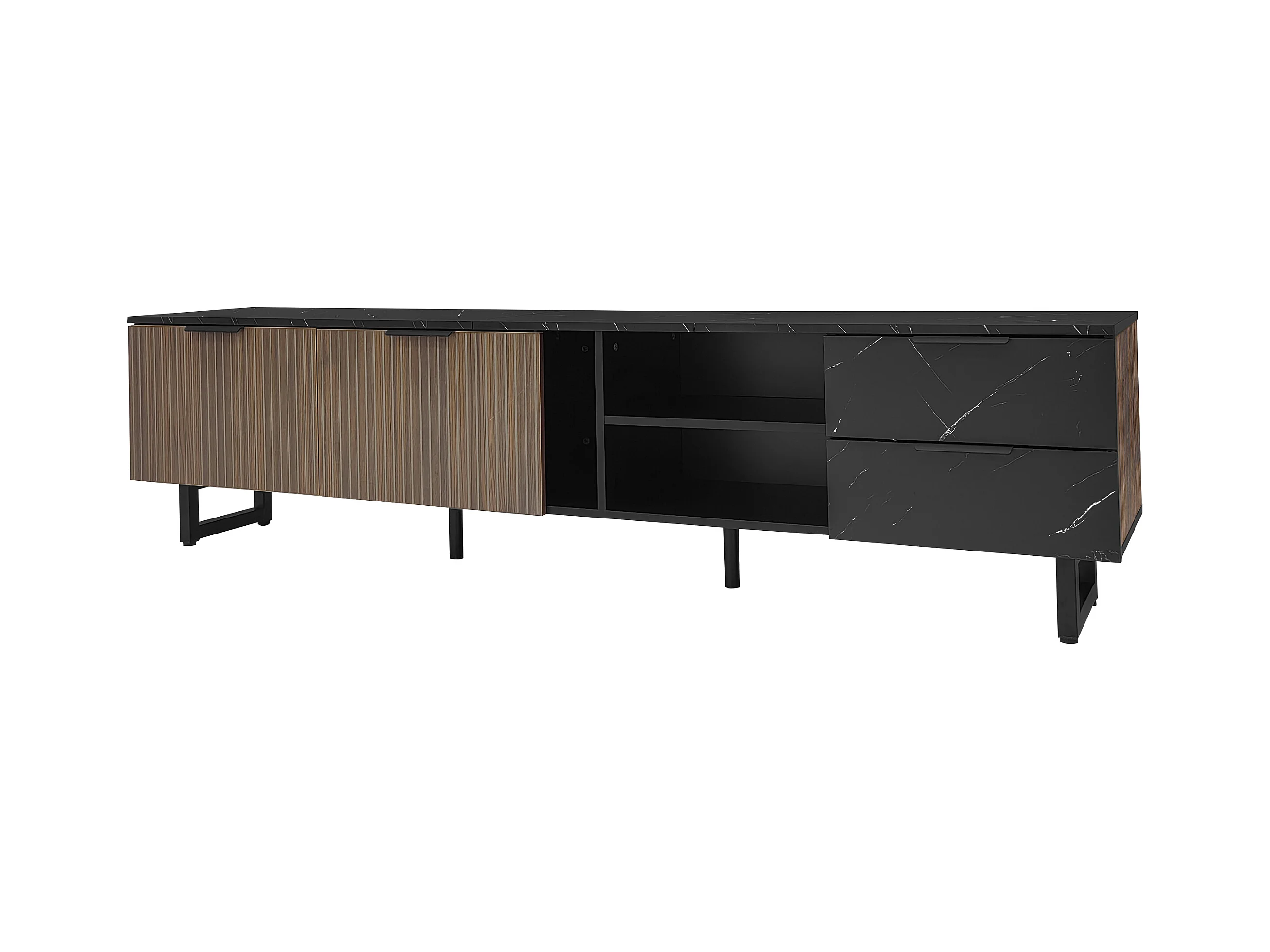 TV-meubel 200x38x50 cm met twee lades en planken Zwart MDF-materiaal en natuurlijke kleuren voor de woonkamer