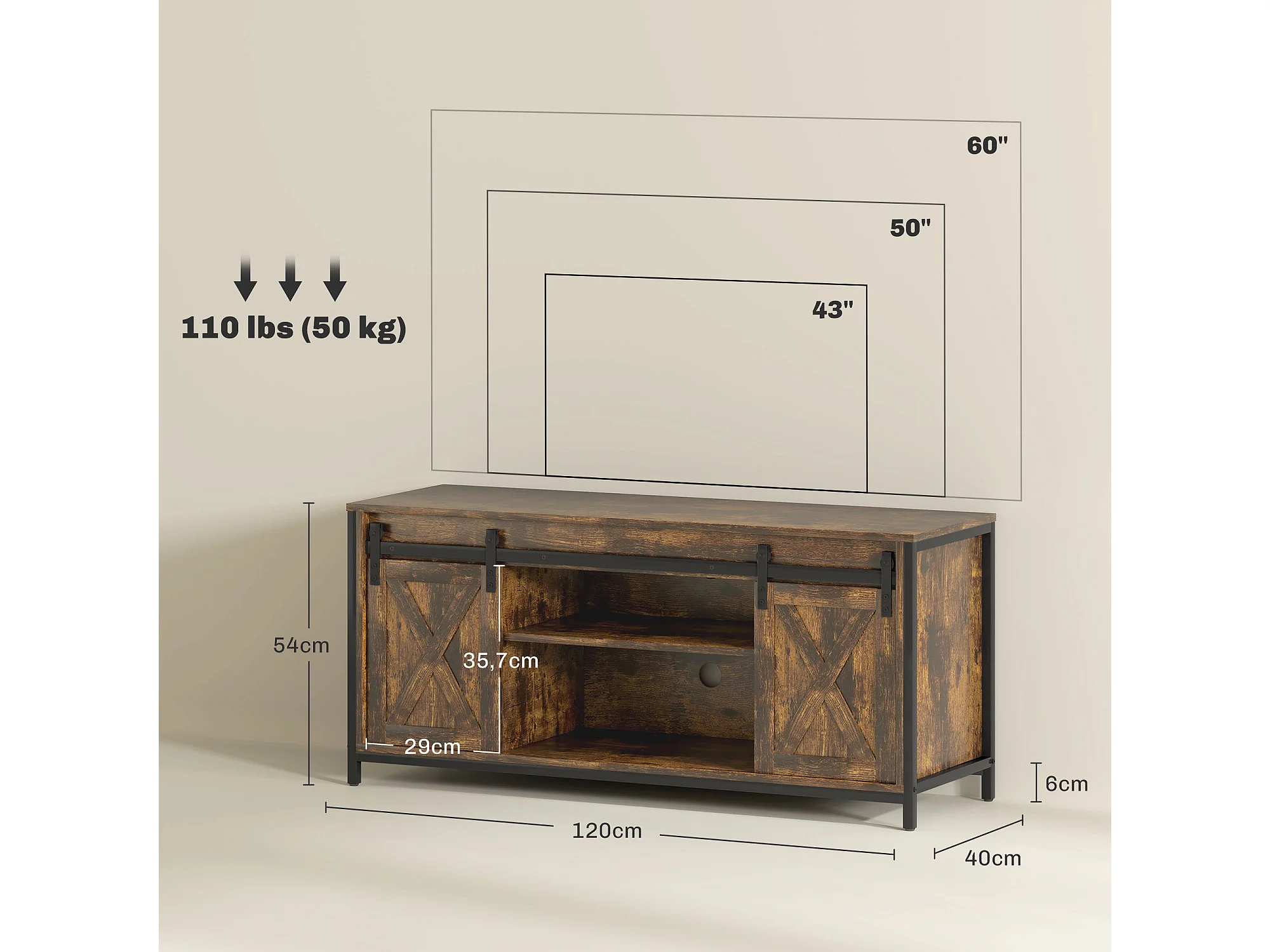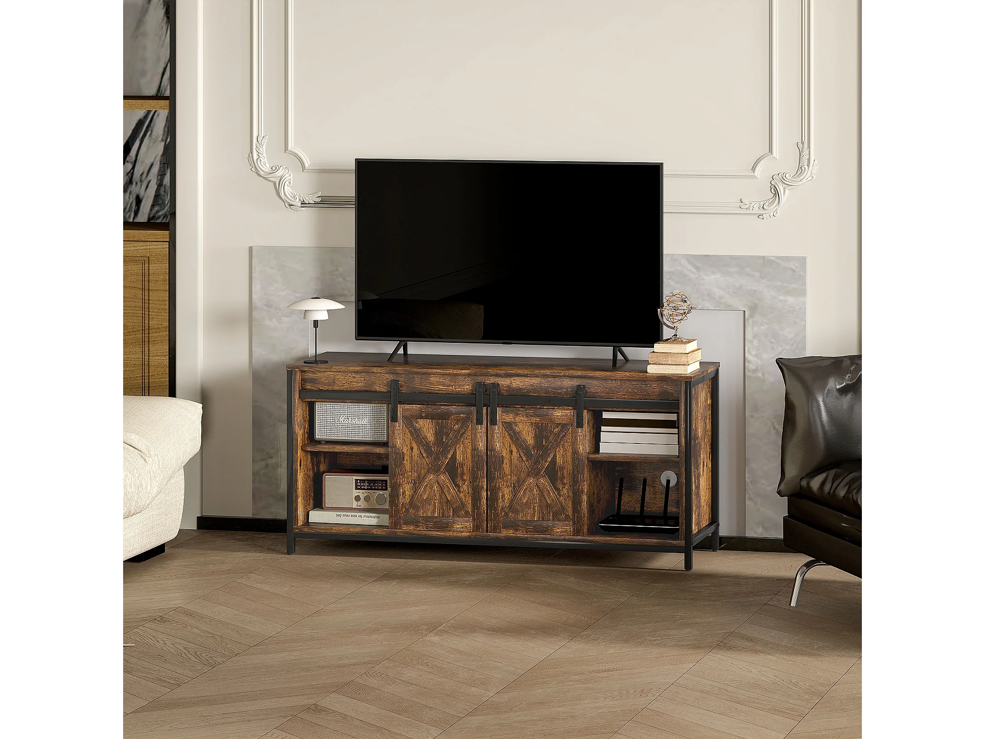 Tv-meubel in industriële stijl met 2 schuifdeuren en verstelbare planken, bruin.