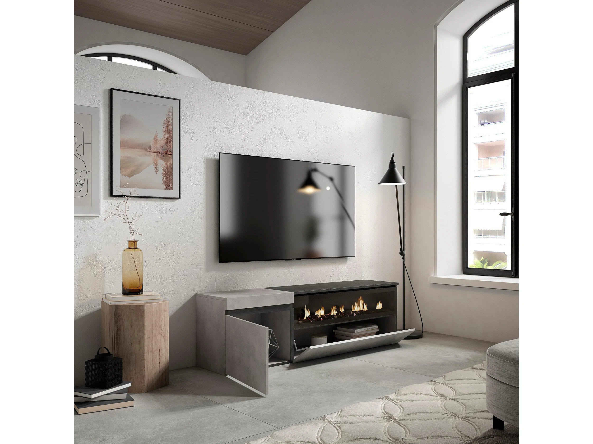 TV-Meubel, Lowboard, 150x35x45cm, Voor tv's tot 65", Elektrische haard, Cement