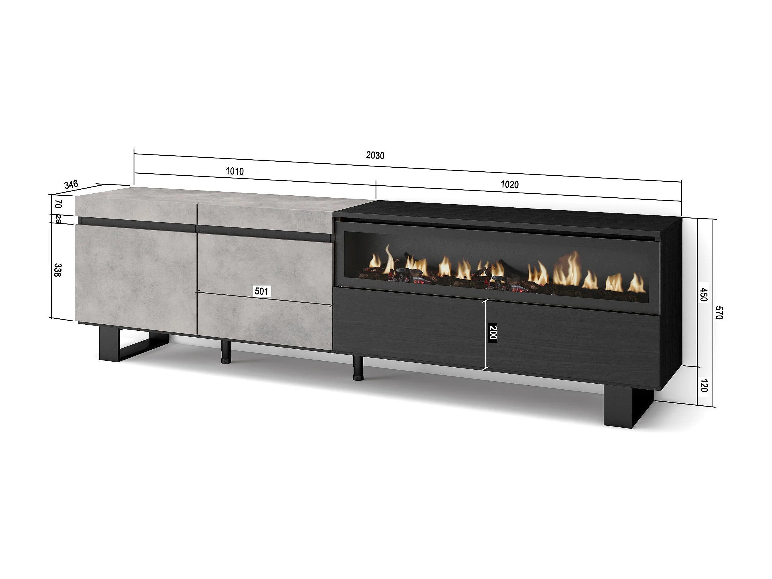 TV-Meubel, Lowboard, 200x35x57cm, Voor tv's tot 80", Elektrische haard, Industrieel design, Cement